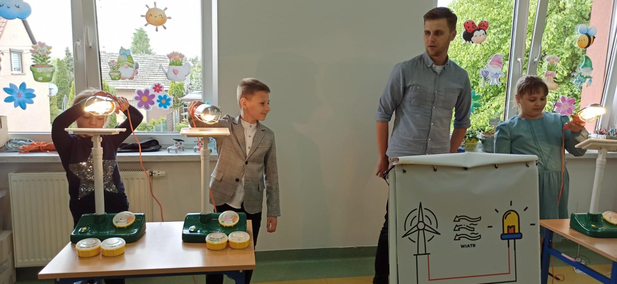 Nasi uczniowie z klas I –IV mieli przyjemność wziąć udział w ciekawych warsztatach z zakresu wiedzy o energii odnawialnej, gdzie przeprowadzając proste eksperymenty utrwalali wiedzę na temat źródeł energii odnawialnej oraz alternatywnych źródeł pozyskiwania energii – energii nieodnawialnej. Najatrakcyjniejszą częścią warsztatów była zabawa w wyścigi samochodzikami napędzanymi panelami fotowoltaicznymi. Na podsumowanie zajęć dzieci otrzymały dyplomy i przystąpiły do sesji zdjęciowej.