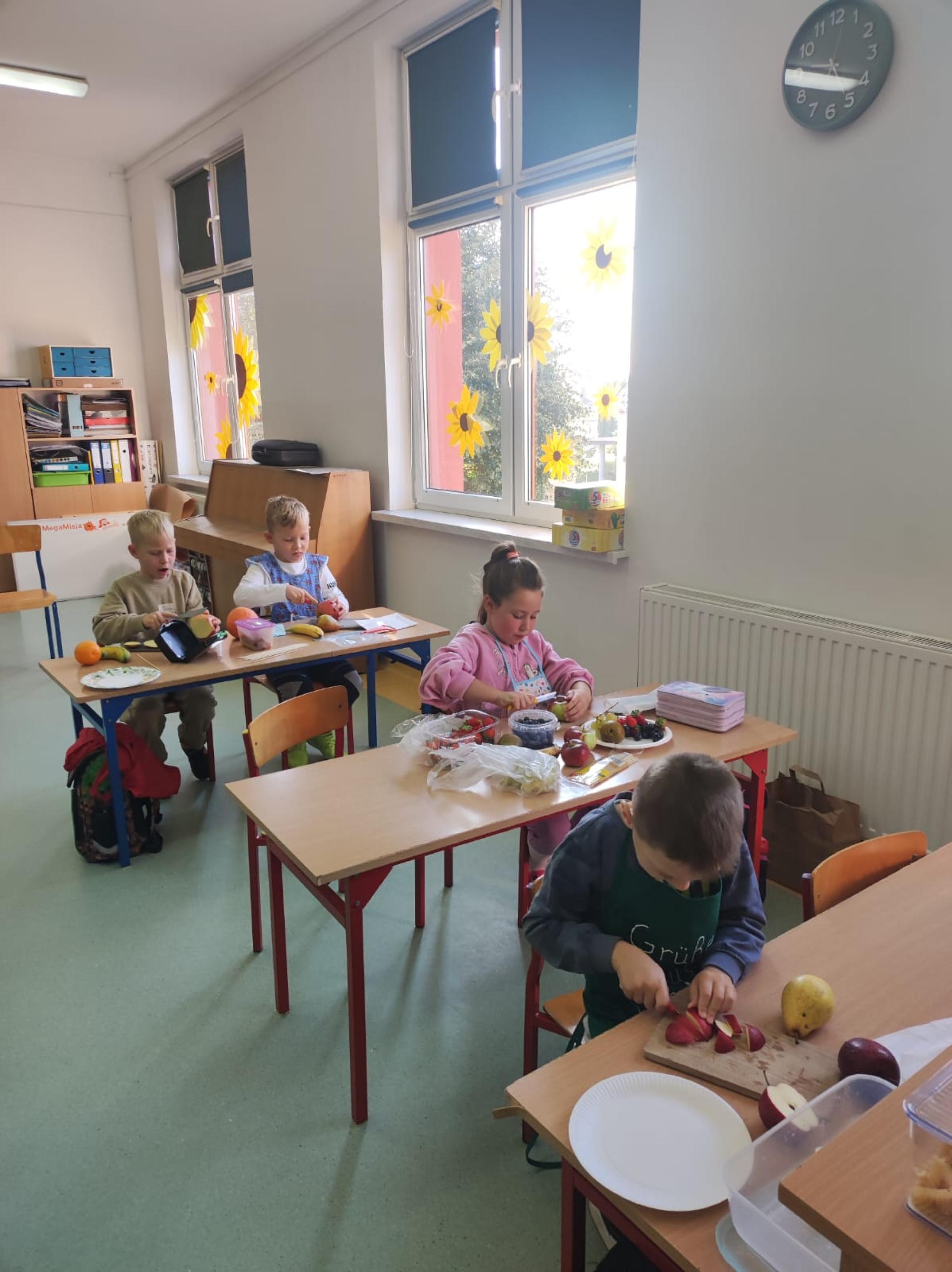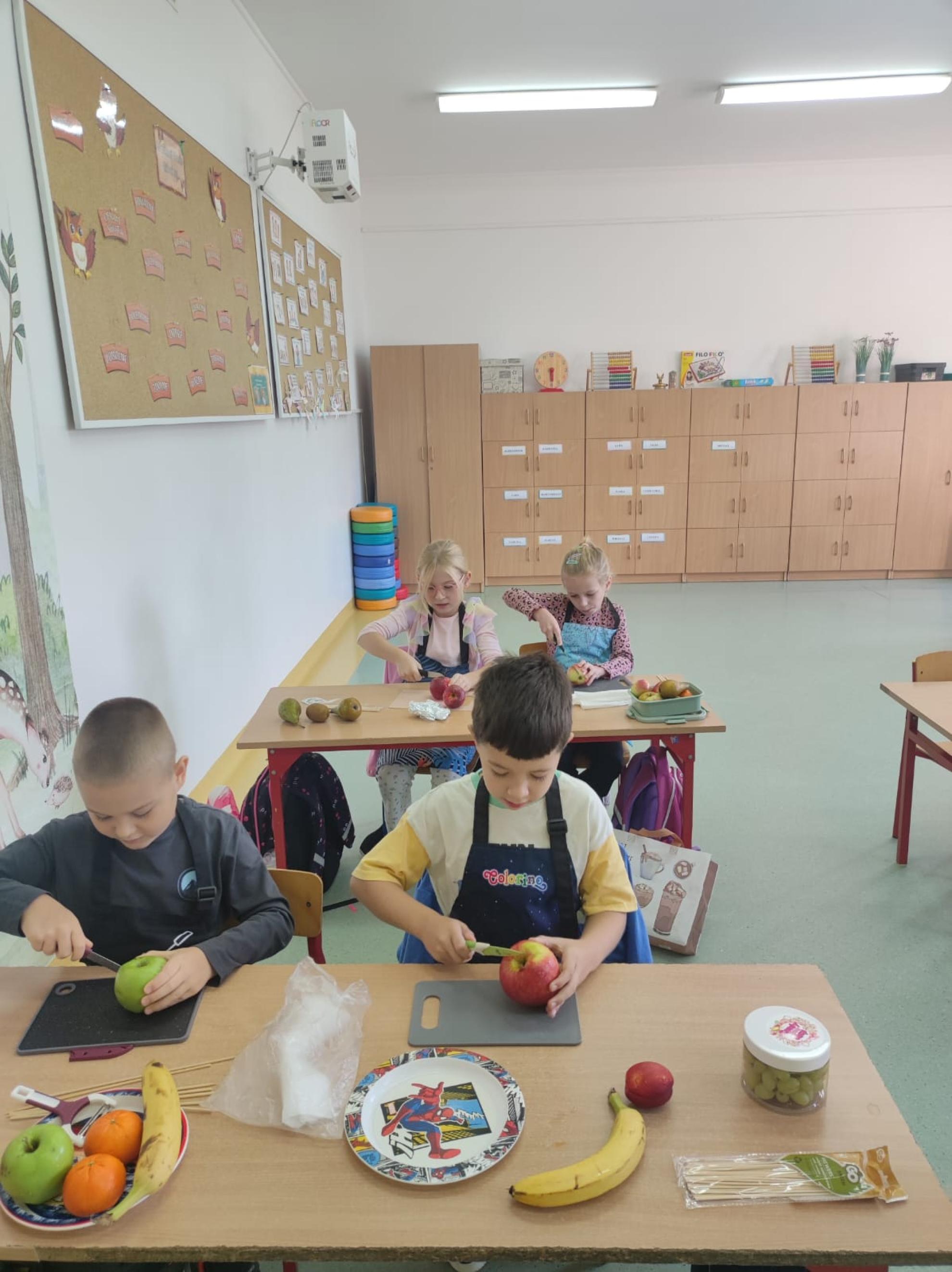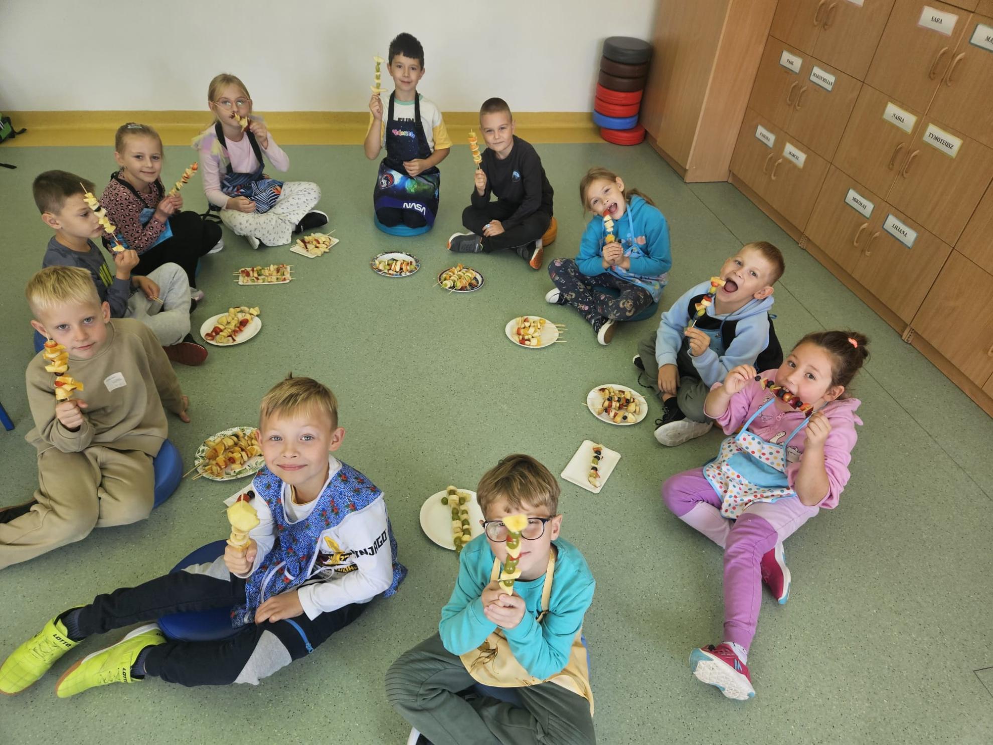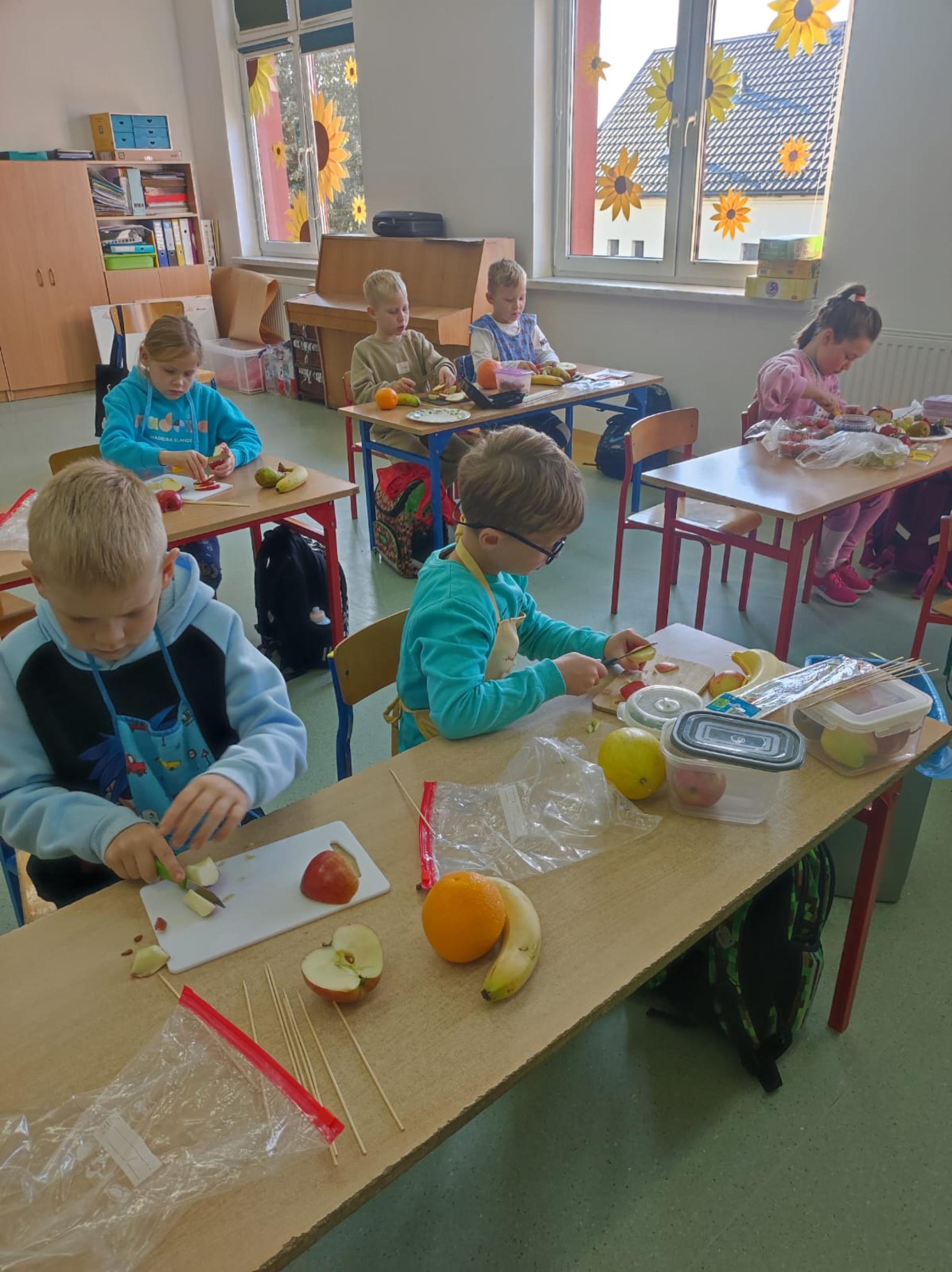 Uczniowie klasy I przygotowywali kolorowe szaszłyki owocowe,
