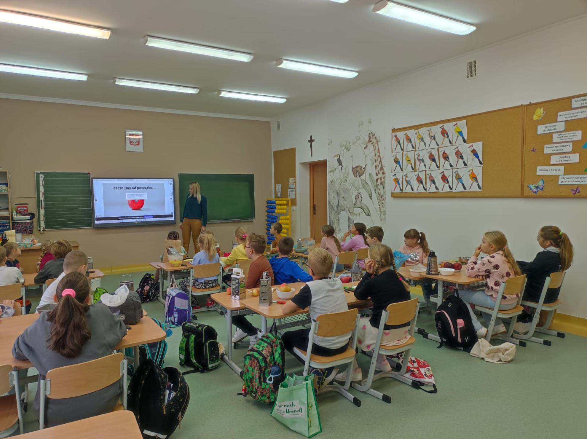 Na początku dzieci wzięły udział w krótkiej pogadance, podczas której poznały historię pochodzenia jabłka, jego wartości odżywcze oraz różnorodne odmiany tego popularnego i zdrowego owocu. Uczniowie dowiedzieli się także, dlaczego warto jeść jabłka codziennie i jak wpływają one na nasze zdrowie.