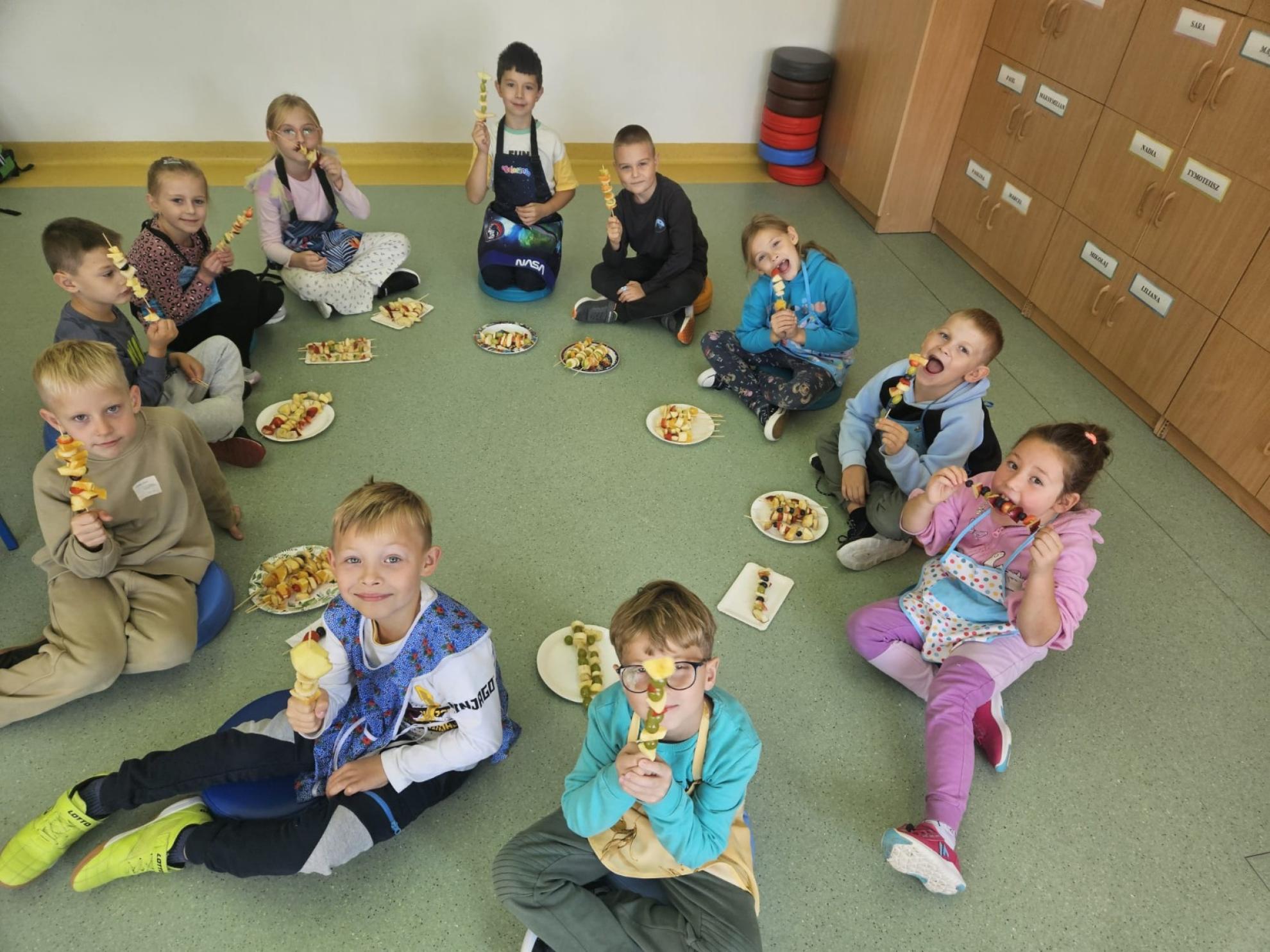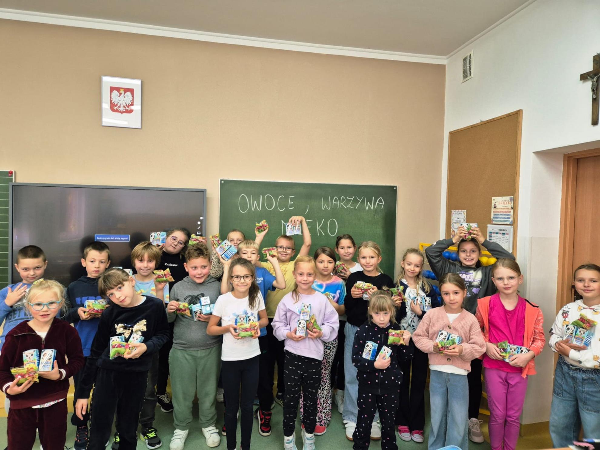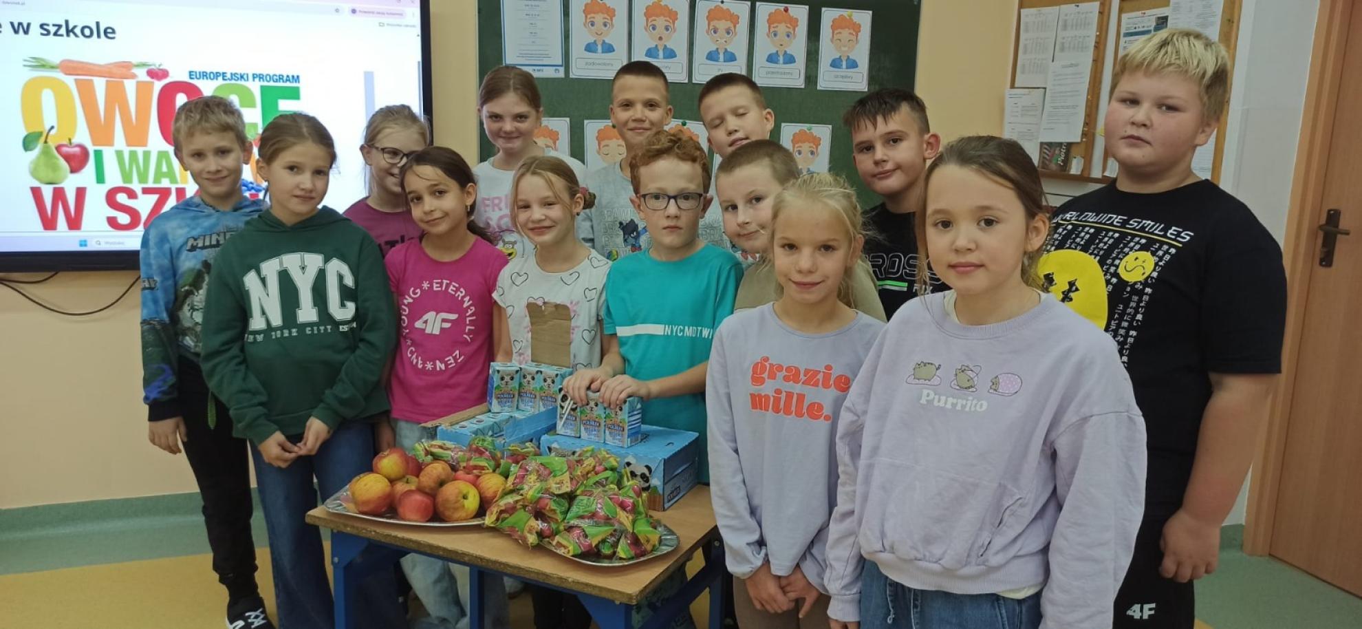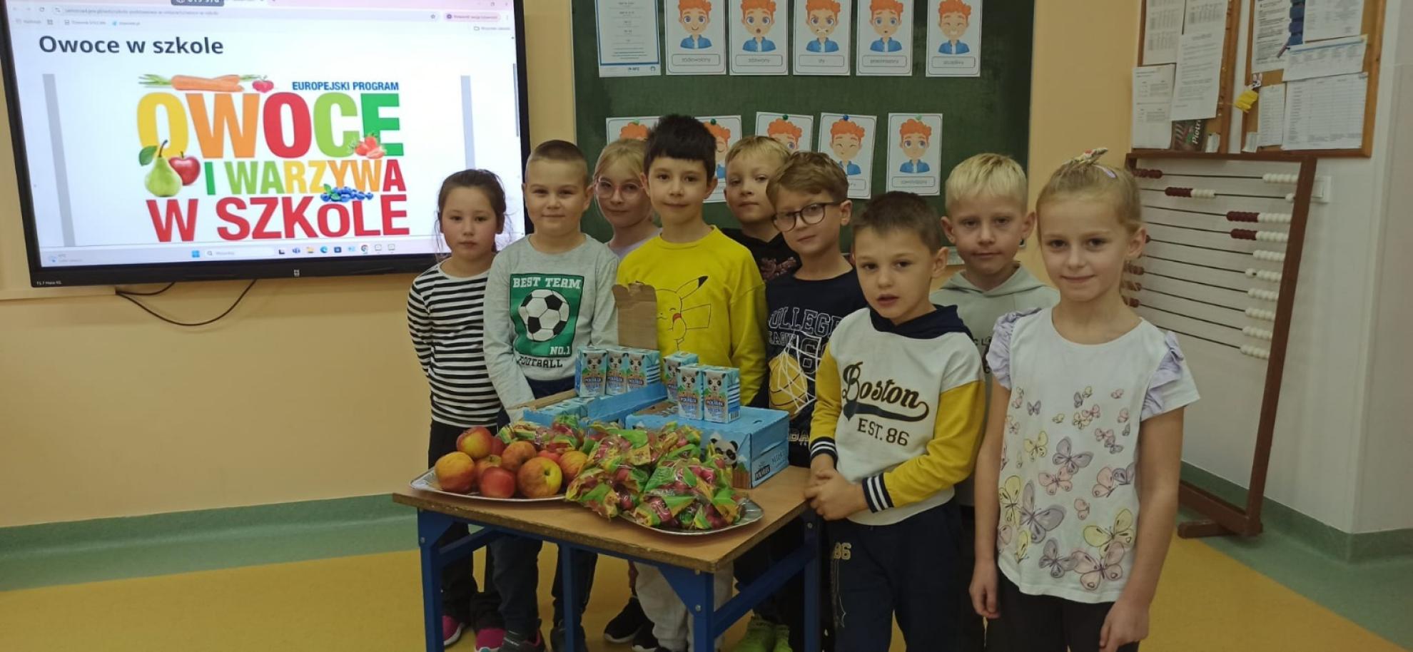 Jak co roku klasy I - IV uczestniczą w programie koordynowanym przez Krajowy Ośrodek Wsparcia Rolnictwa „Owoce i warzywa w szkole”, który polega na dostarczaniu dzieciom owoców, warzyw oraz mleka i przetworów mlecznych. Głównym celem tego programu jest kształtowanie prawidłowych nawyków żywieniowych poprzez dostarczanie uczniom produktów mlecznych oraz owocowo-warzywnych. Dzięki temu dzieci od najmłodszych lat poznają smaki zdrowych przekąsek. Program obejmuje działania o charakterze edukacyjnym i promocyjnym. Nasze klasy przeprowadziły zajęcia edukacyjne mające na celu wyrabianie u dzieci prawidłowych nawyków żywieniowych. Dzieci obejrzały film na temat znaczenia witamin obecnych w warzywach i owocach do prawidłowego funkcjonowania organizmu człowieka, wykonały szaszłyki, surówki i sałatki z jabłkiem w roli głównej. Poznały ekipę i niektóre z przygód Chrumasa. Poznawały i utrwalały nazwy mniej popularnych owoców i warzyw. Kolejne wyzwania przed nami z wykorzystaniem warzyw i owoców tych znanych i tych mniej znanych.