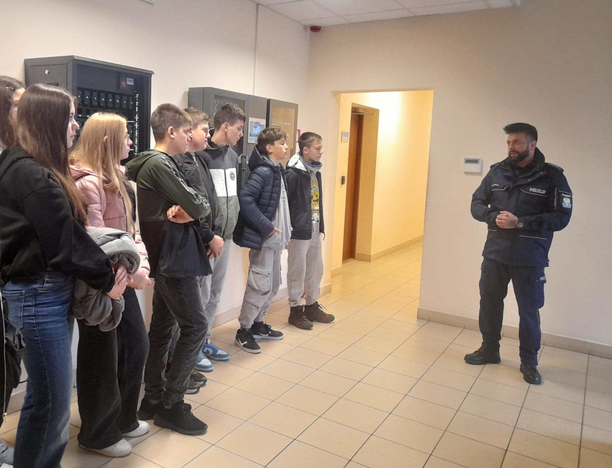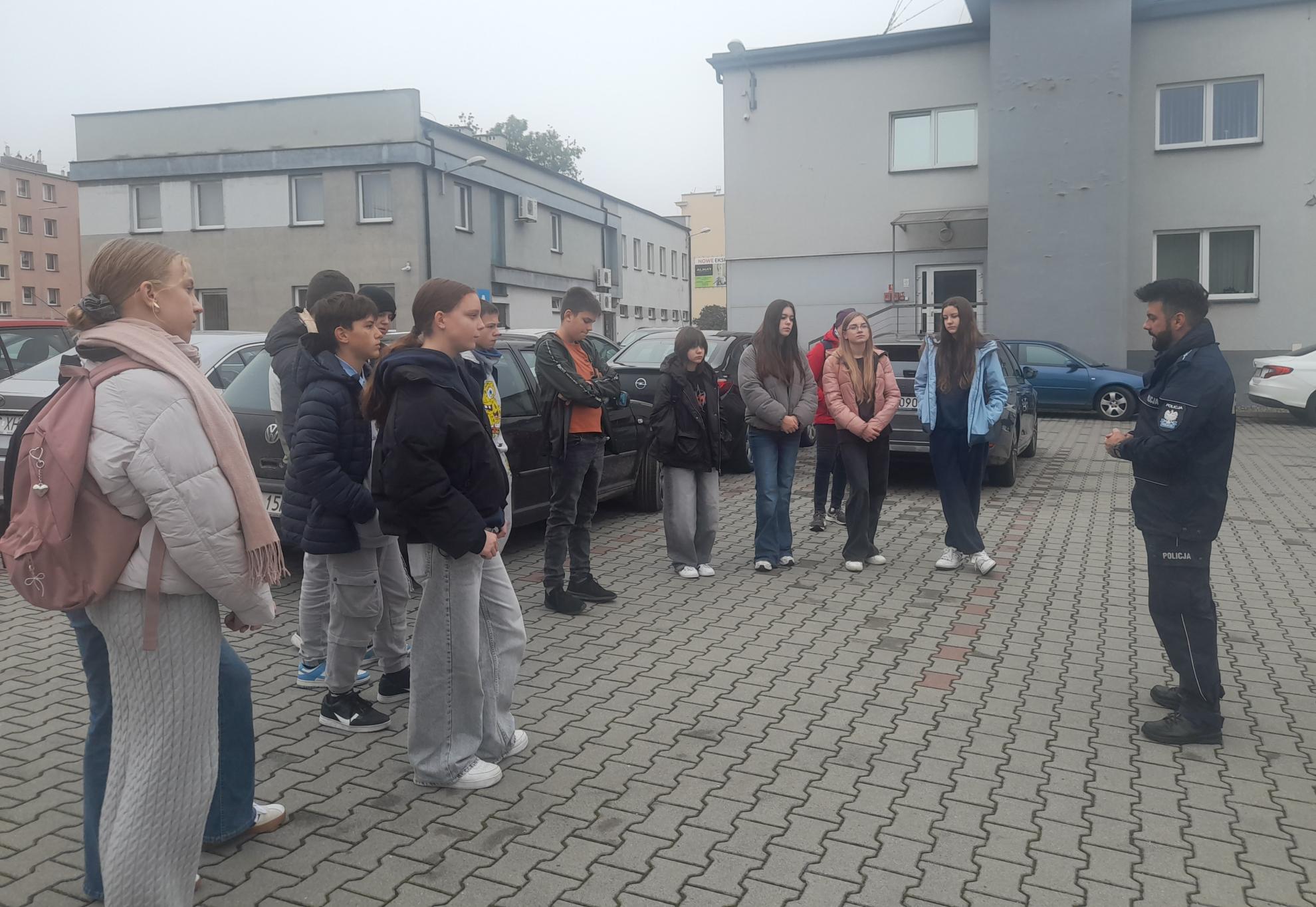 Pierwszym punktem programu była wizyta w lokalnej jednostce Policji. Ze specyfiką pracy Policji zapoznał nas aspirant Łukasz Gardas. Uczniowie mogli dowiedzieć się, jak wygląda codzienna praca policjantów, jakie są ich zadania i jak ważne jest przestrzeganie prawa. Spotkanie z funkcjonariuszem było nie tylko pouczające, ale także inspirujące, bo uczniowie mogli zadawać pytania i poznać bliżej pracę służb mundurowych.