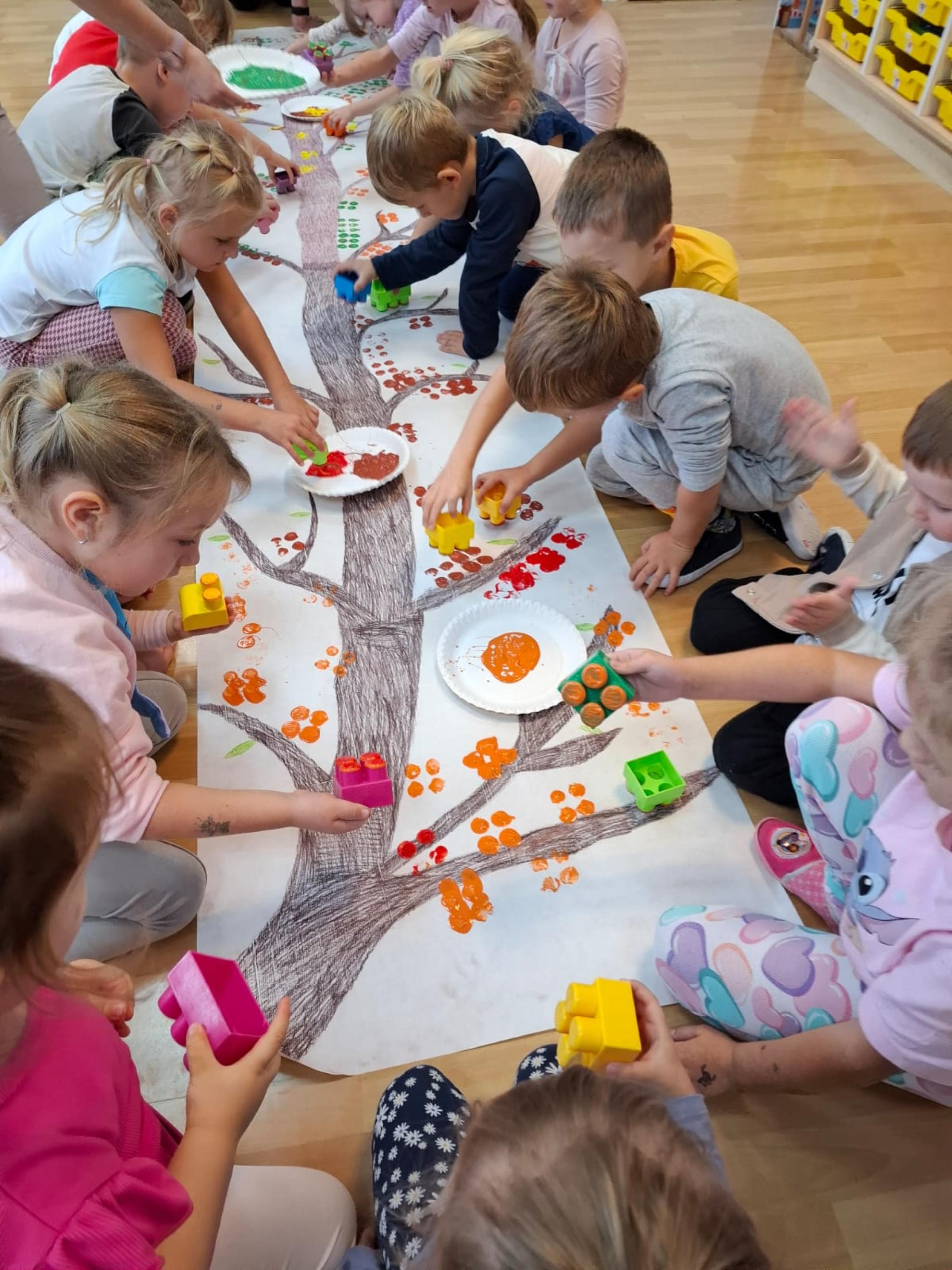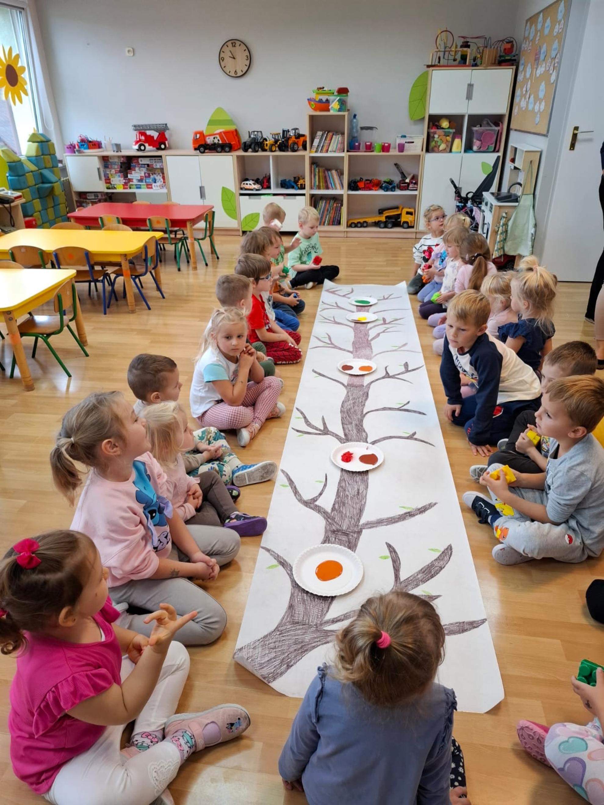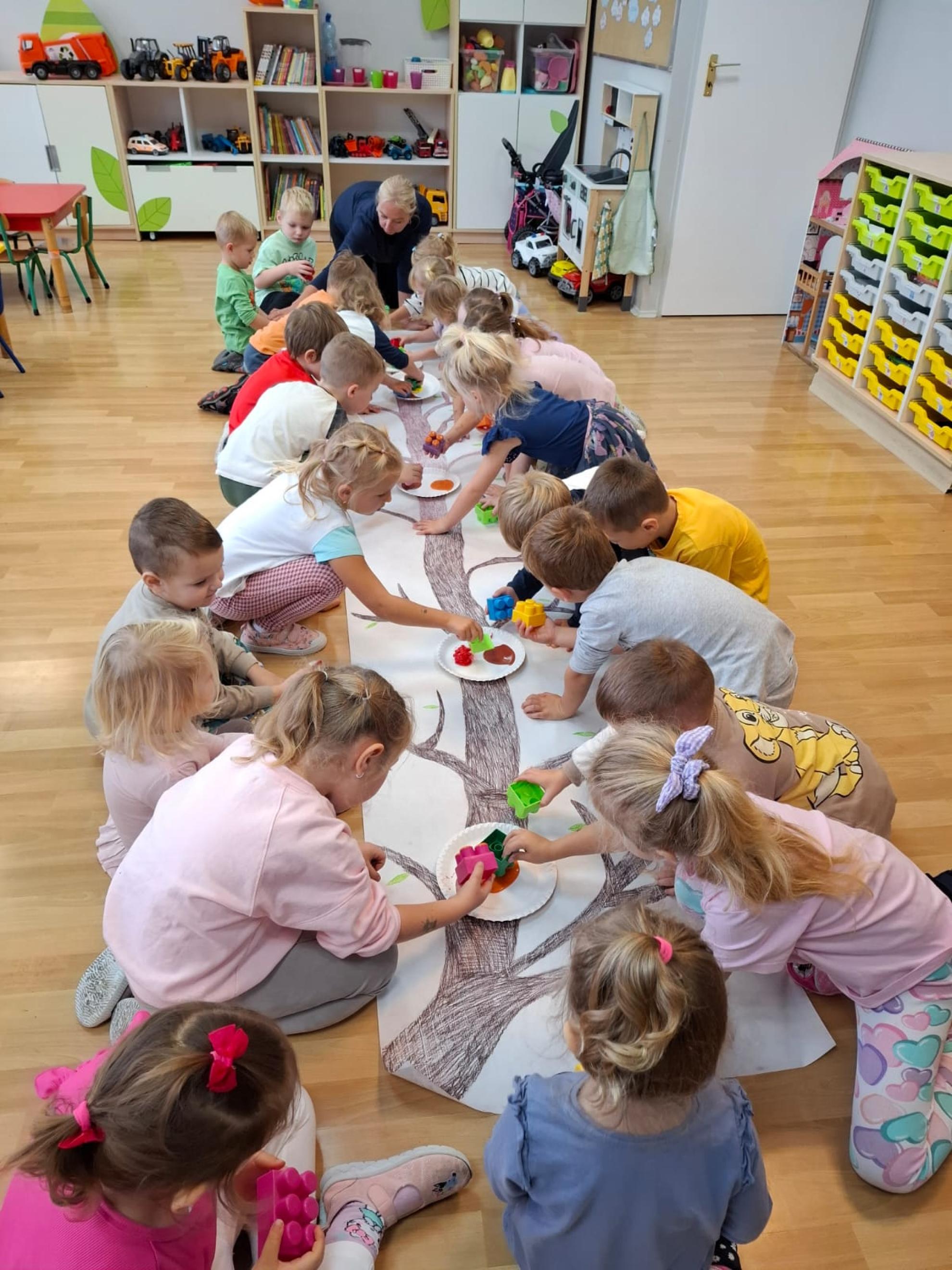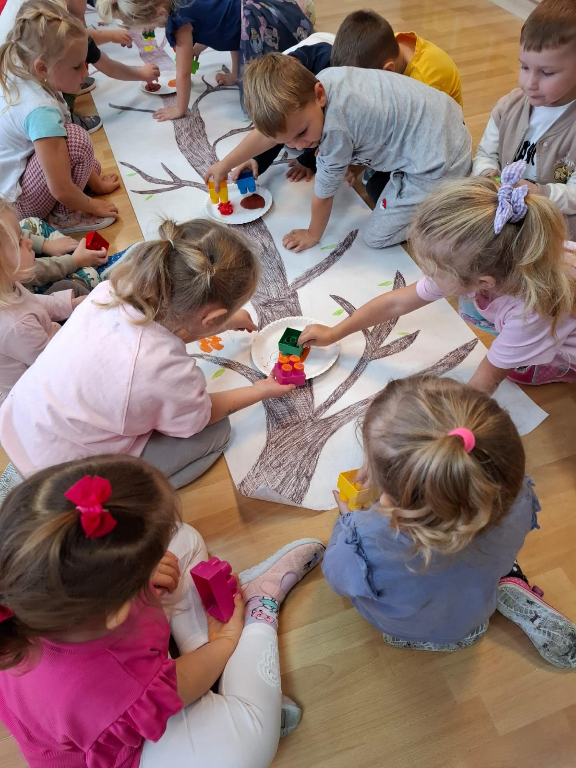 Dzieci dowiedziały się, dlaczego drzewa są tak ważne dla ludzi, zwierząt i całej Ziemi. Wspólnie rozmawialiśmy o tym, jak dbać o przyrodę, rozpoznawaliśmy gatunki drzew, a także świetnie się bawiliśmy podczas układania kolorowych drzew w kolejności wg wzoru, stemplowalismy za pomocą farby i klocków kolorowe liście na ogromnej gałązce