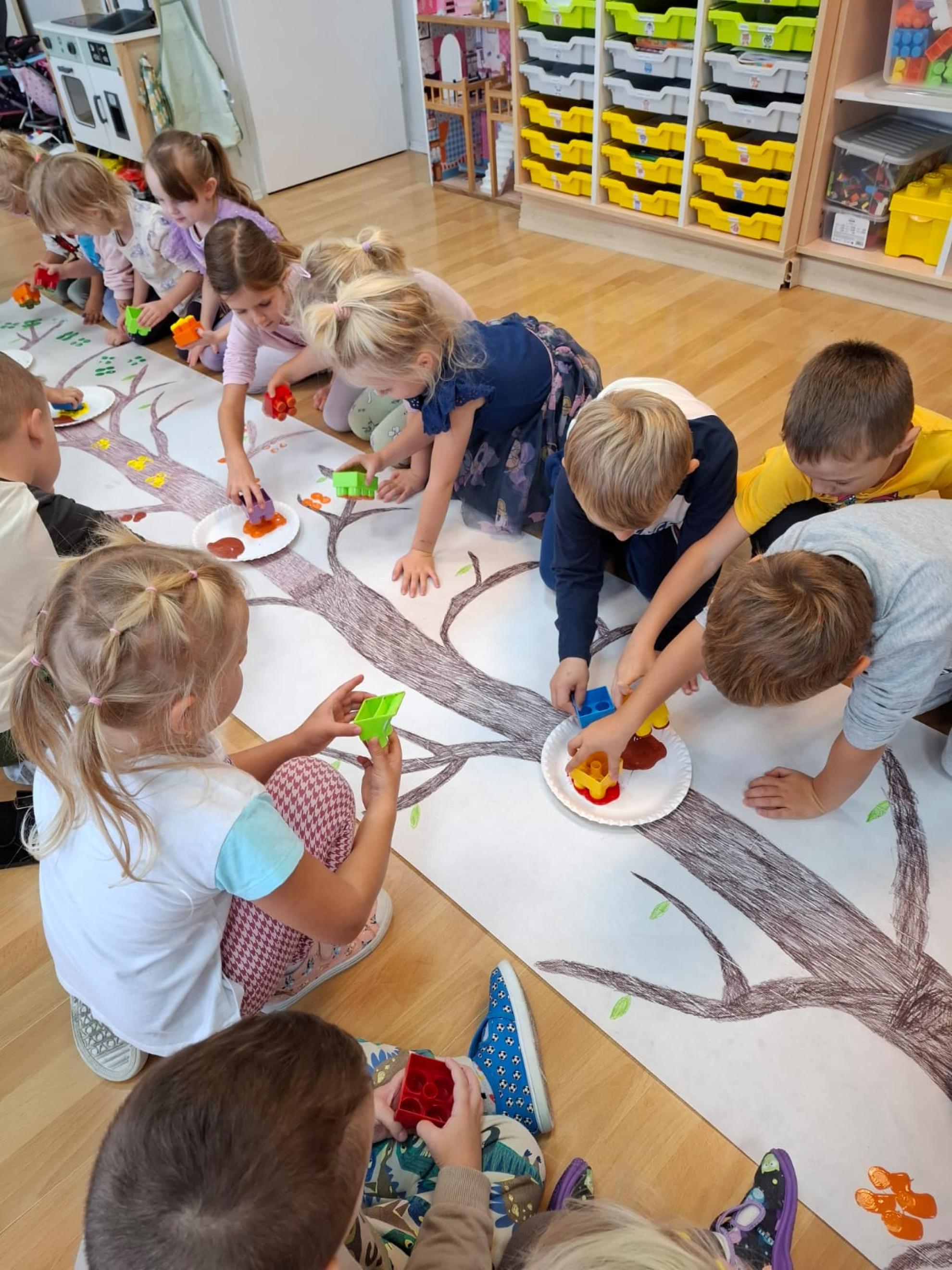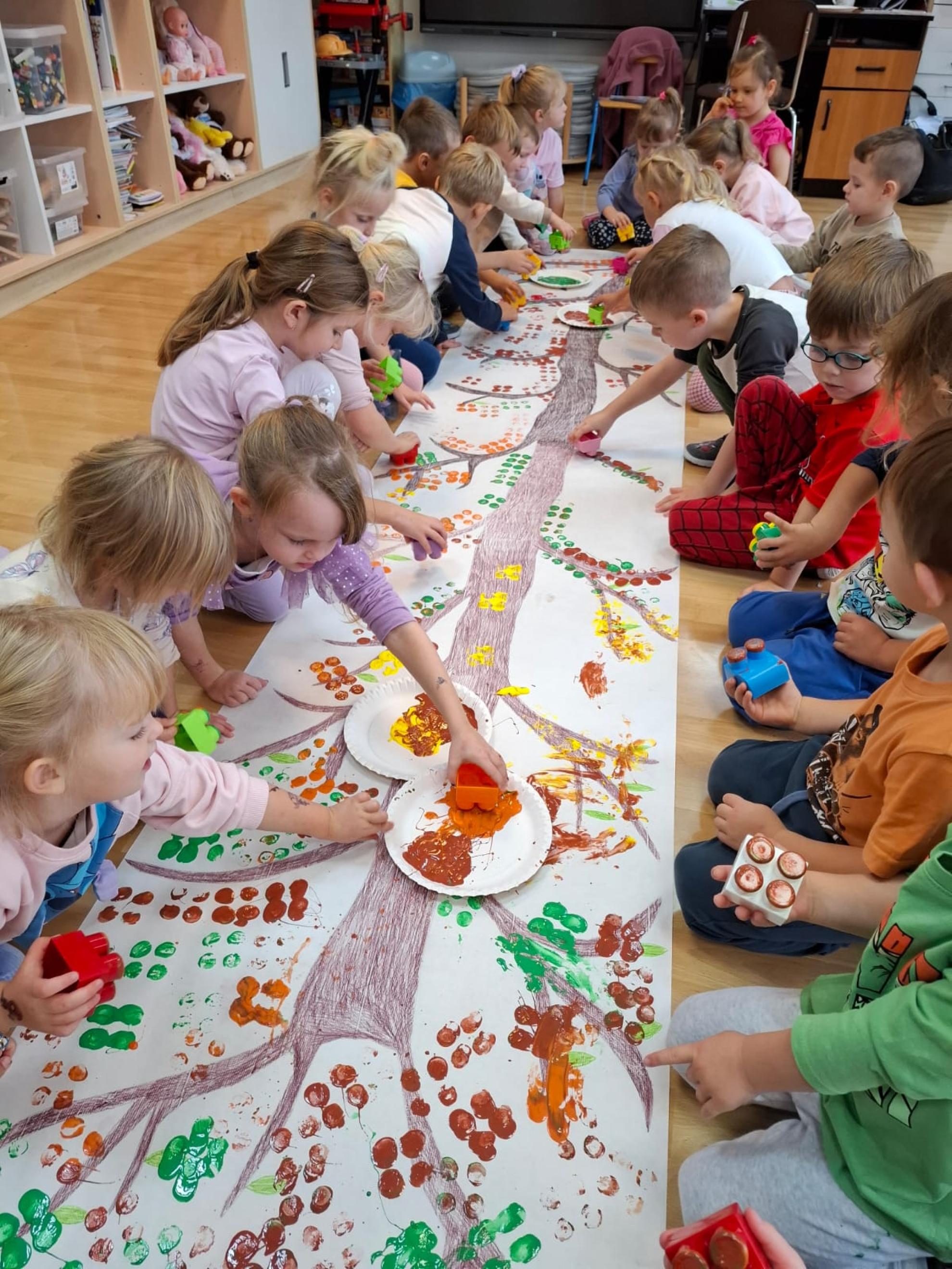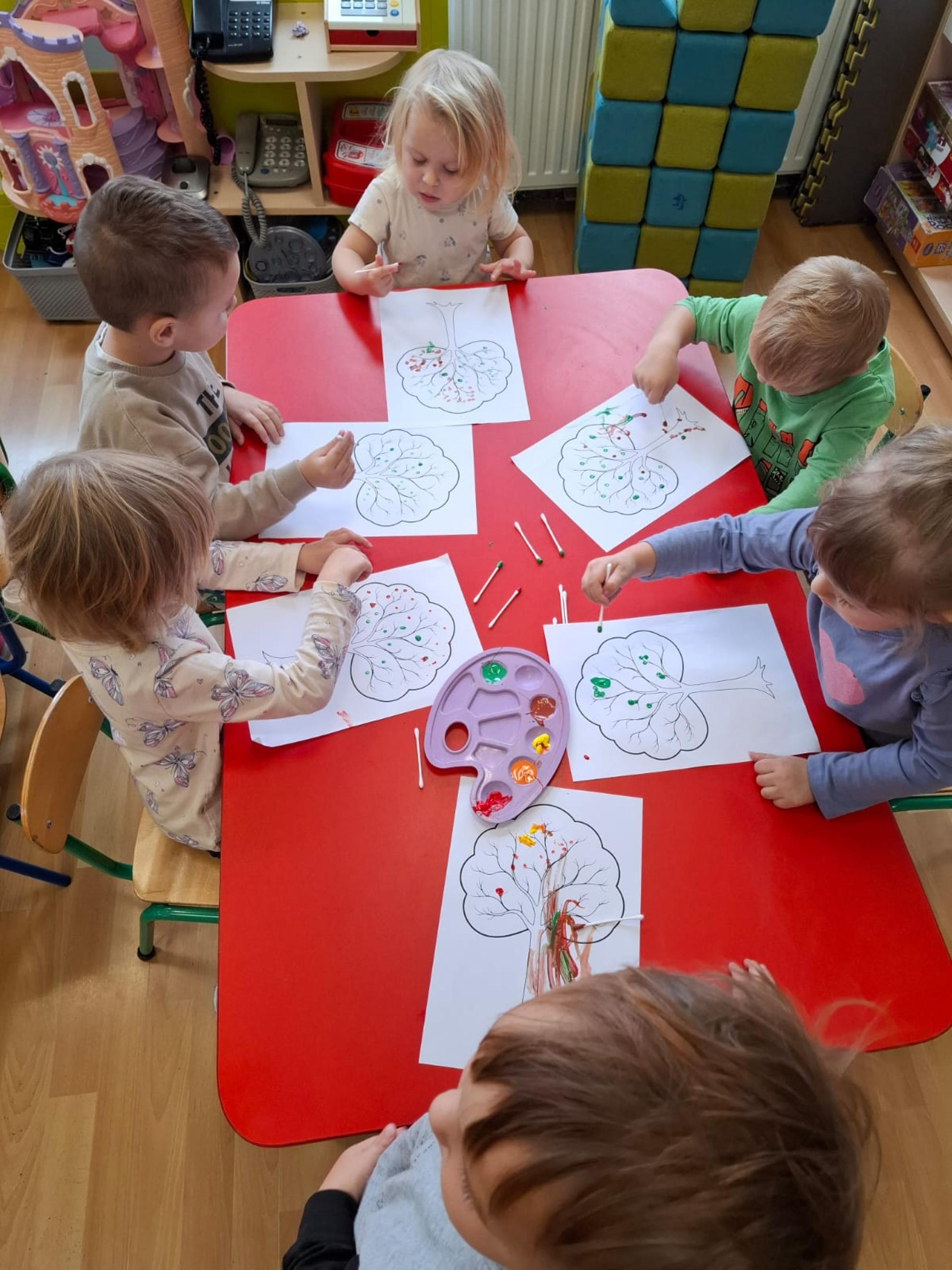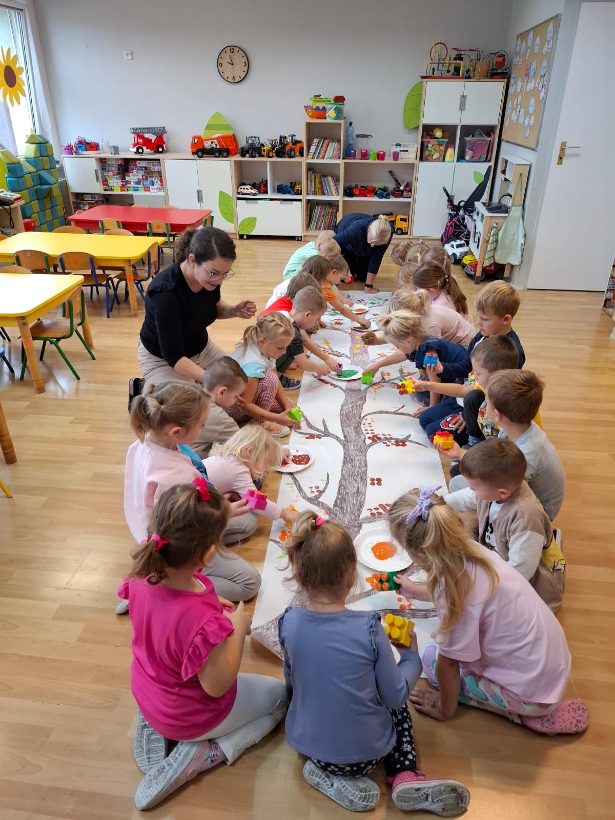 Dzieci dowiedziały się, dlaczego drzewa są tak ważne dla ludzi, zwierząt i całej Ziemi. Wspólnie rozmawialiśmy o tym, jak dbać o przyrodę, rozpoznawaliśmy gatunki drzew, a także świetnie się bawiliśmy podczas układania kolorowych drzew w kolejności wg wzoru, stemplowalismy za pomocą farby i klocków kolorowe liście na ogromnej gałązce