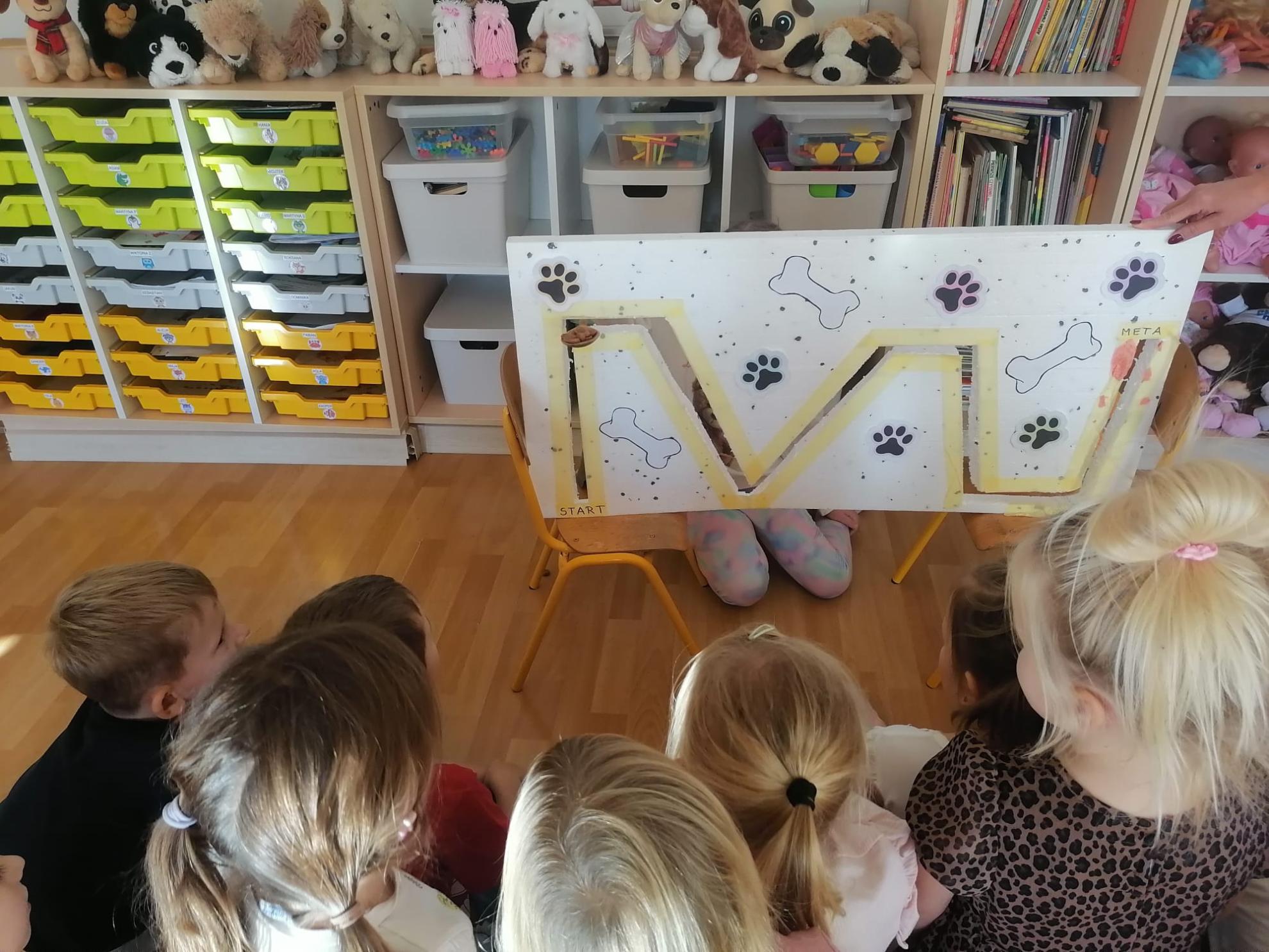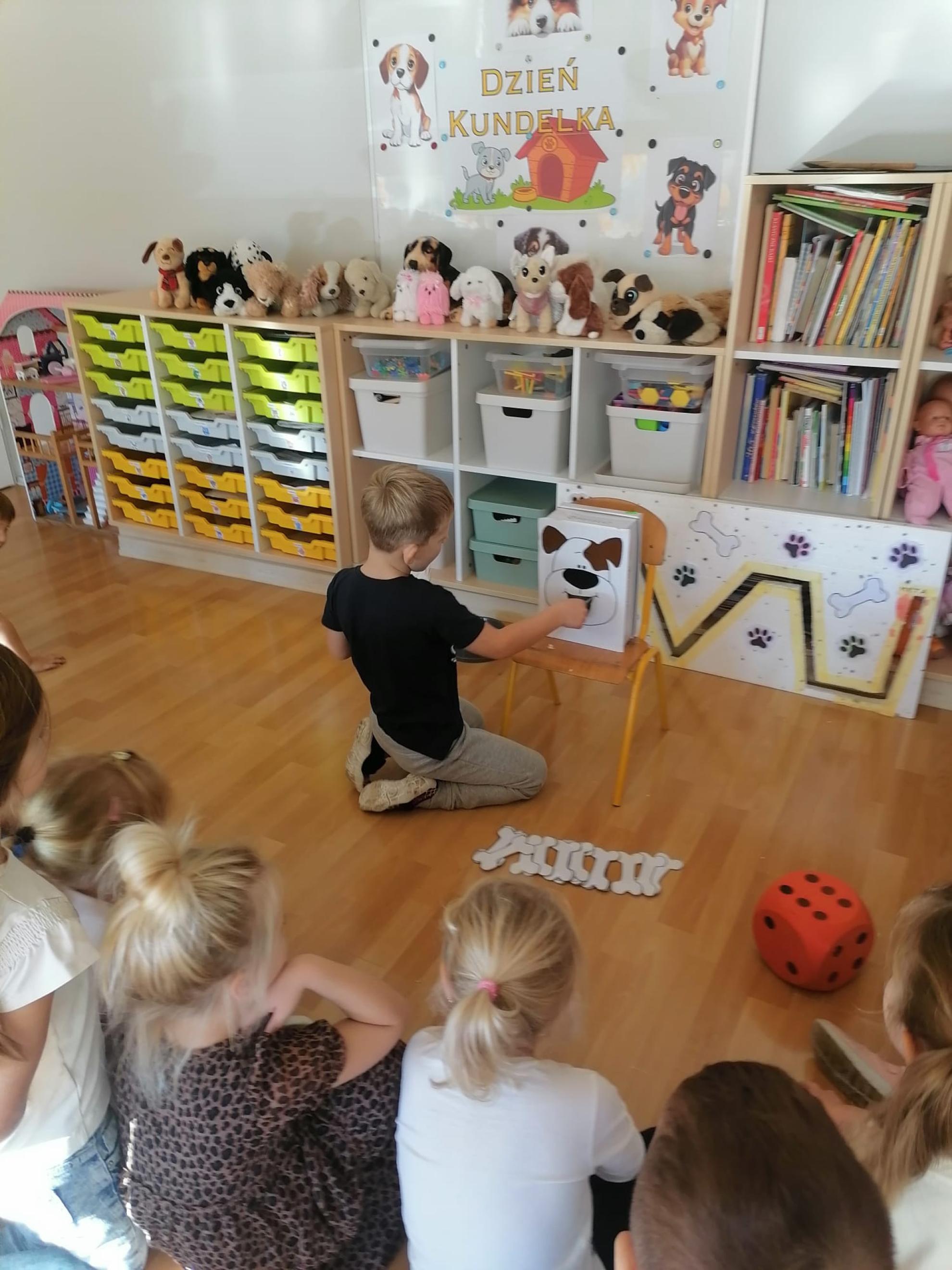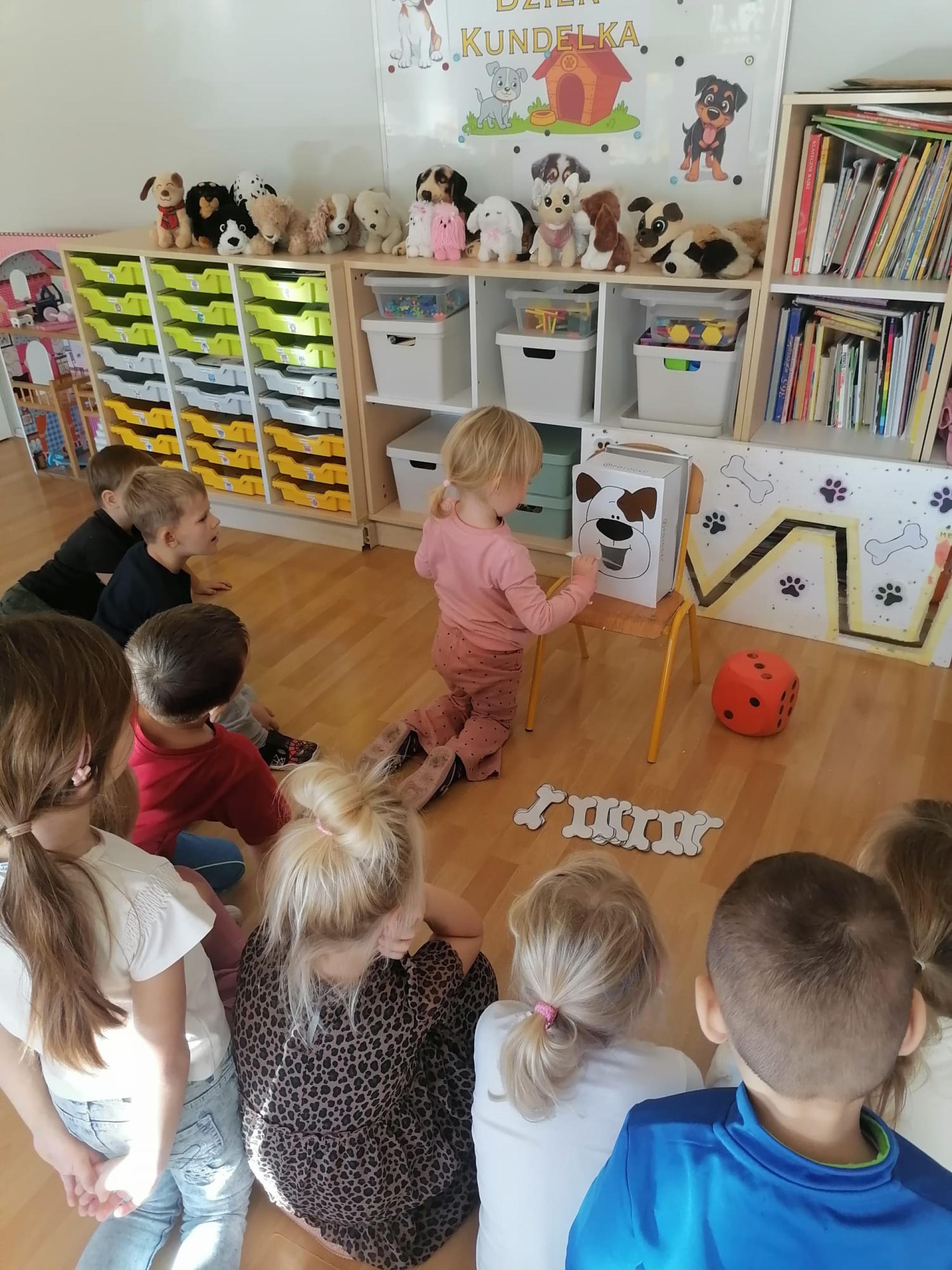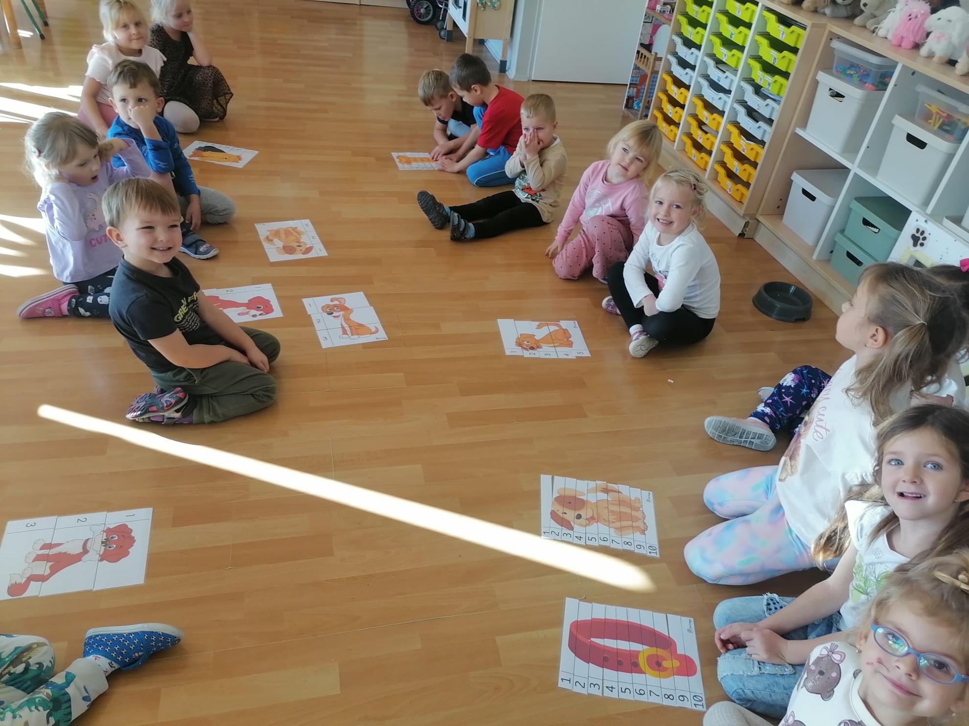 Dzieci wysłuchały bajki, której bohaterem był pies Smutasek. Chętnie uczestniczyły w różnych zabawach ruchowych, sprawnościowych i matematycznych oraz wykonały pracę plastyczną. Był to mile spędzony czas przepełniony zabawą i pozytywną energią.