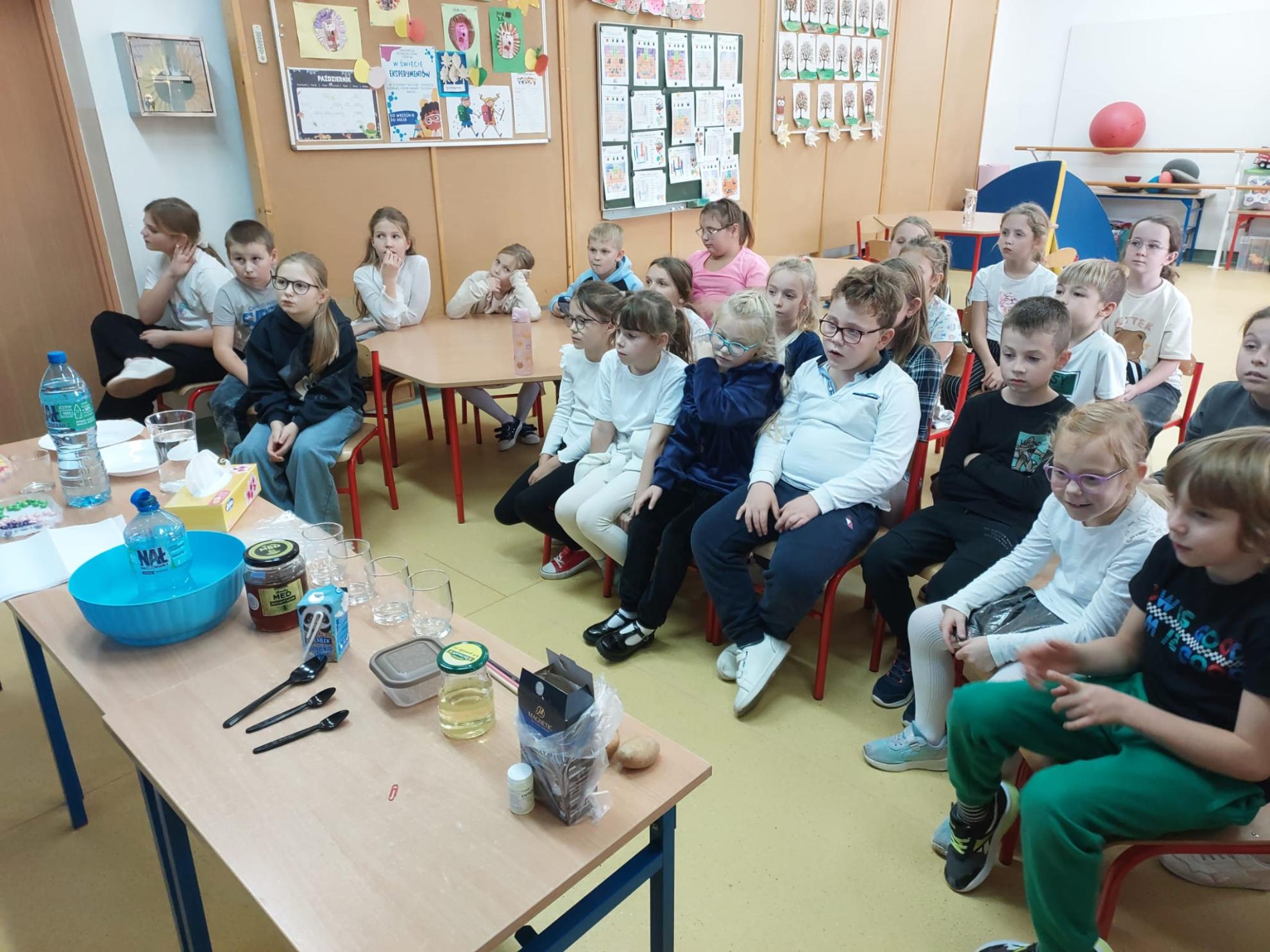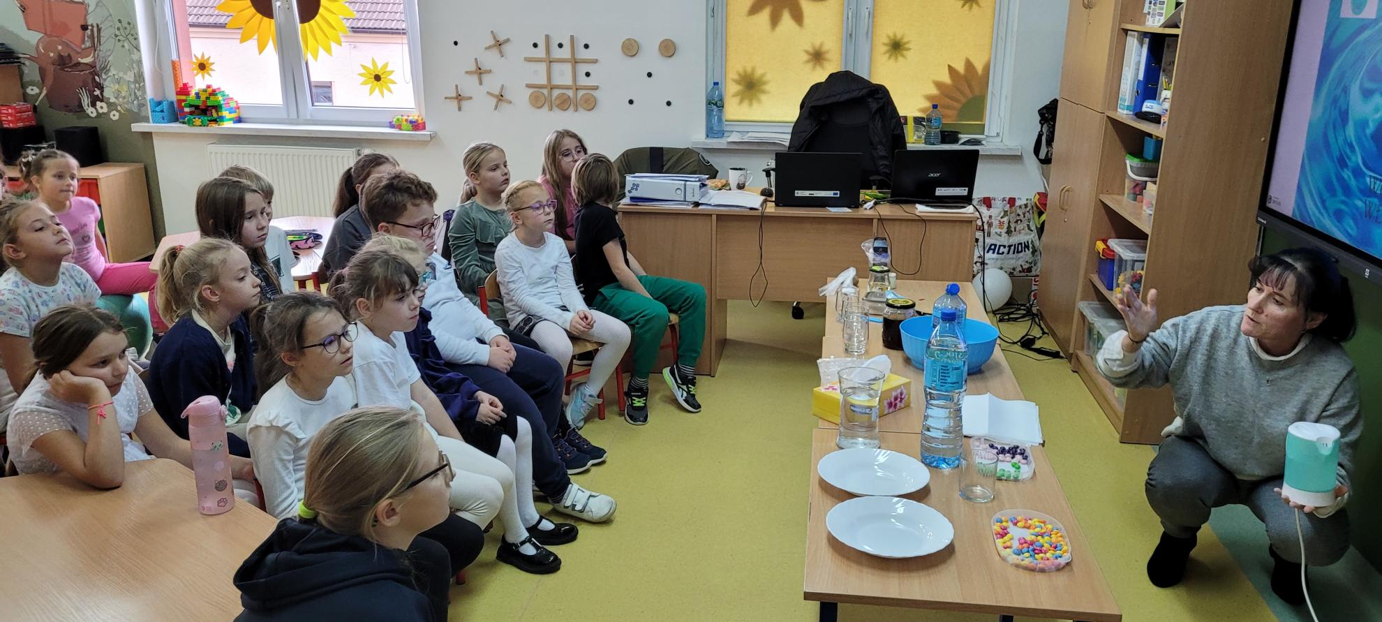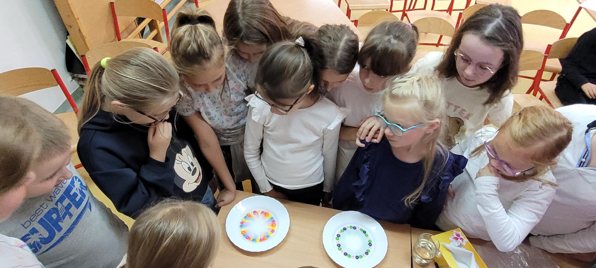 We wtorek 28.10 odbyły się kolejne innowacyjne zajęcia świetlicowe z cyklu „W świecie eksperymentów” - nauka poprzez zabawę. Nauczycielki wykorzystały wodę, aby zademonstrować budowę cieczy i ich właściwości. Uczniowie klas I-IV czynnie uczestniczyli w doświadczeniach poświęconych rozpuszczalności substancji, napięciu powierzchniowemu cieczy i zjawiskom dyfuzji. Prowadzili obserwacje i stawiali hipotezy, weryfikowali je i wyciągali wnioski. Szczególnie spodobały im się eksperymenty z magicznym ziemniakiem, cukierkową tęczą oraz „dziurawą” niekapiącą butelką. Nauczycielki przedstawiły również prezentację podsumowującą zdobytą wiedzę oraz przeprowadziły quiz. Uczestnicy innowacji byli bardzo aktywni, burzliwie dyskutowali