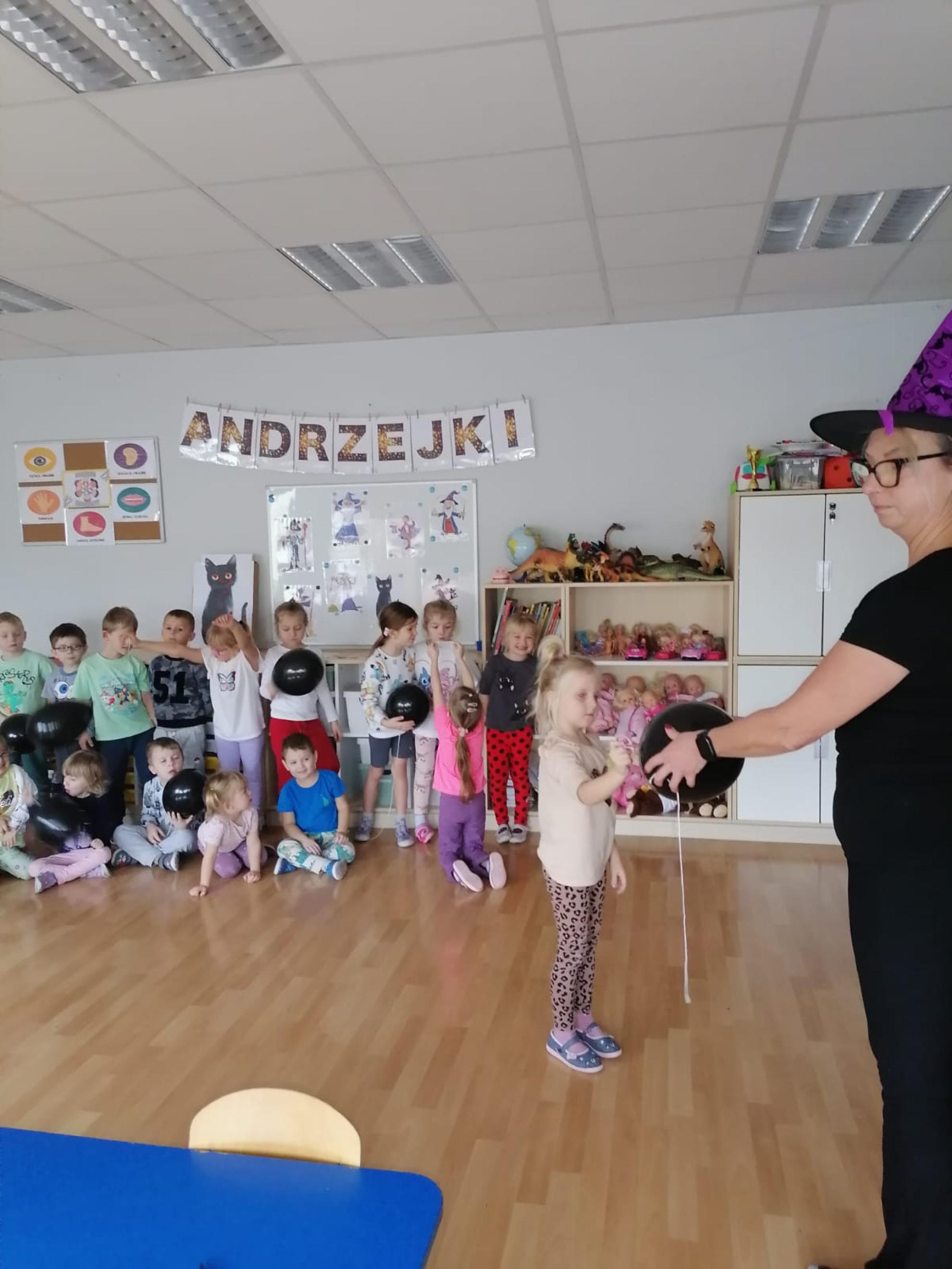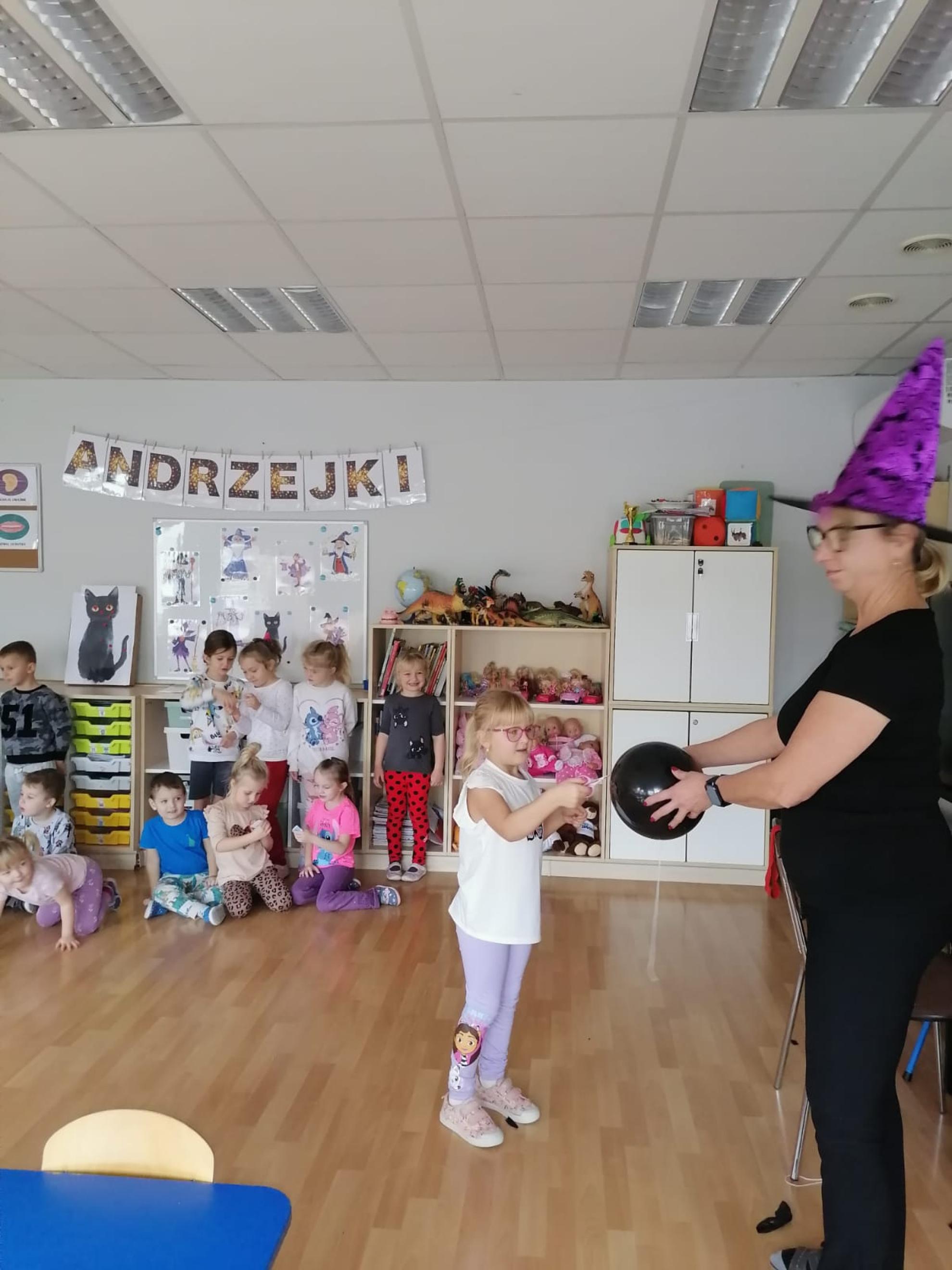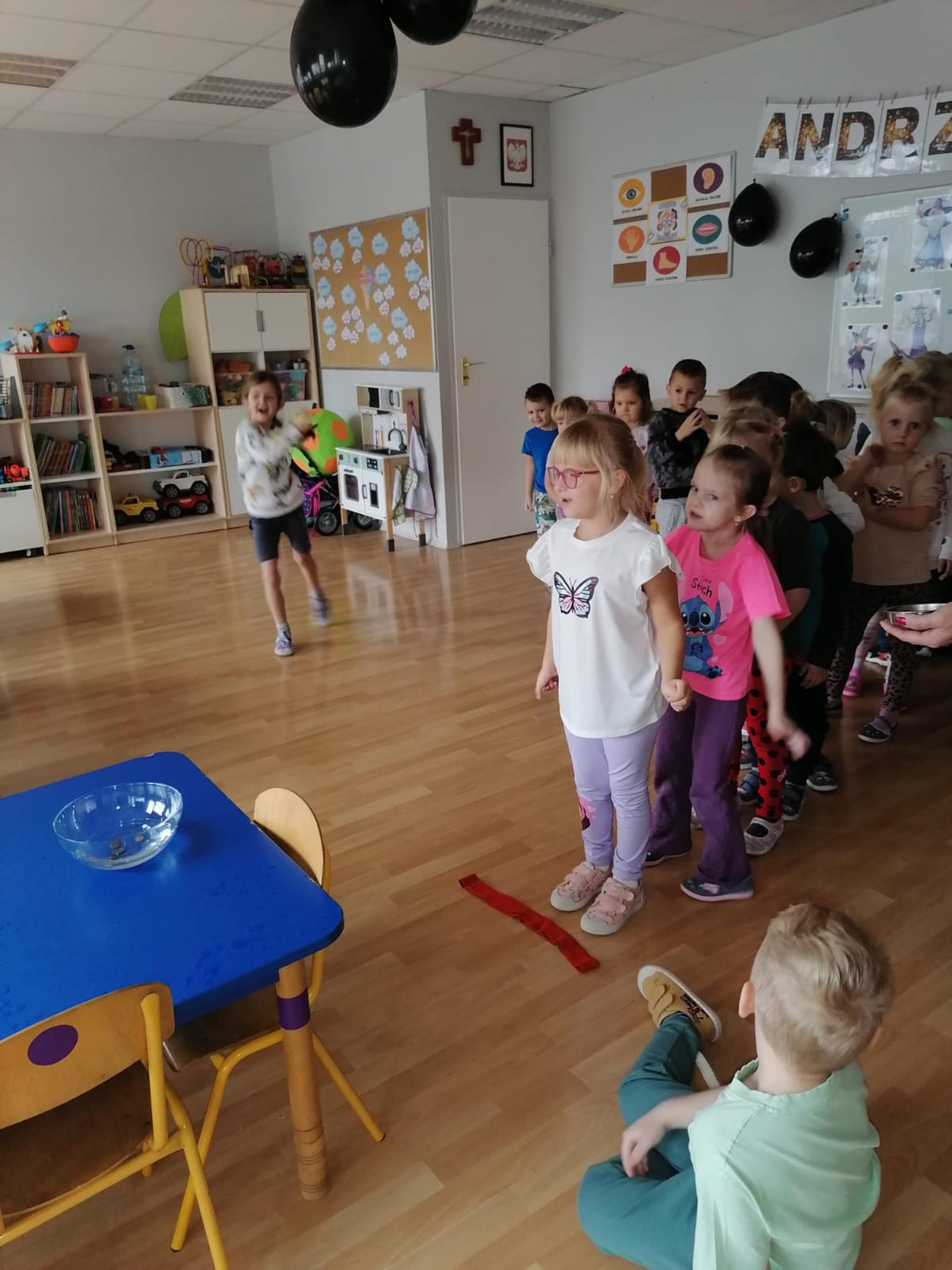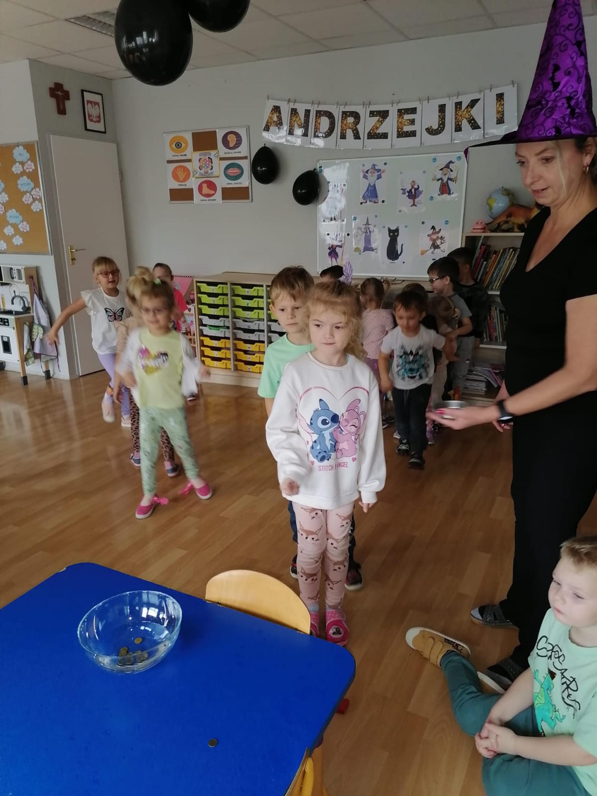 Ten dzień w naszym przedszkolu był dniem radosnych zabaw i wróżb, w których dzieci mogły poznać swoją bliższą i dalszą przyszłość. Nie zabrakło między innymi lania wosku, ustawiania kapci w kierunku drzwi, przebijania balonów z wróżbami, rzucania grosików do miski z wodą - jak dziecko trafi do miski, spełnią się jego marzenia. Na koniec zabawy przedszkolaki raczyły się słodkim poczęstunkiem.