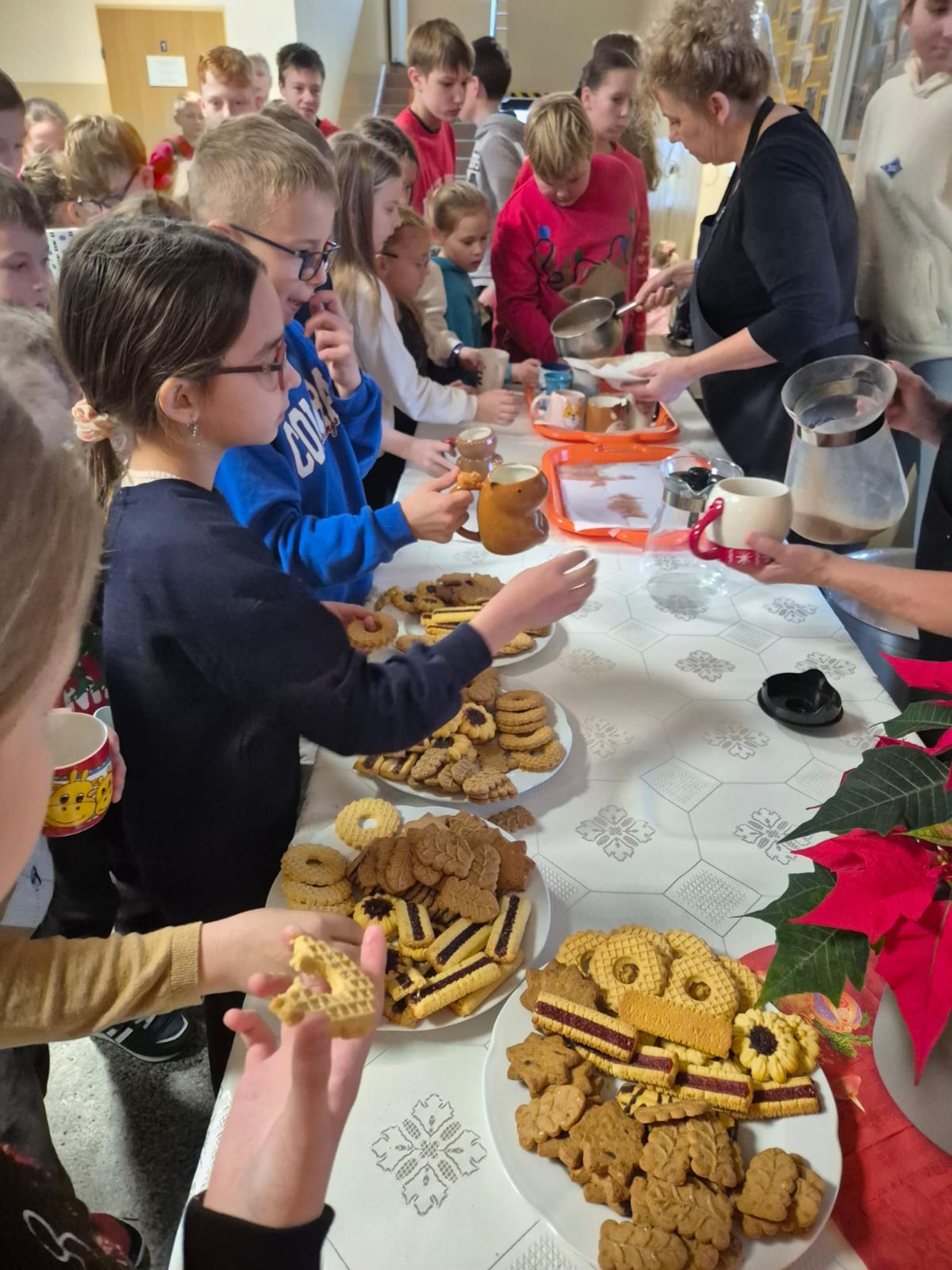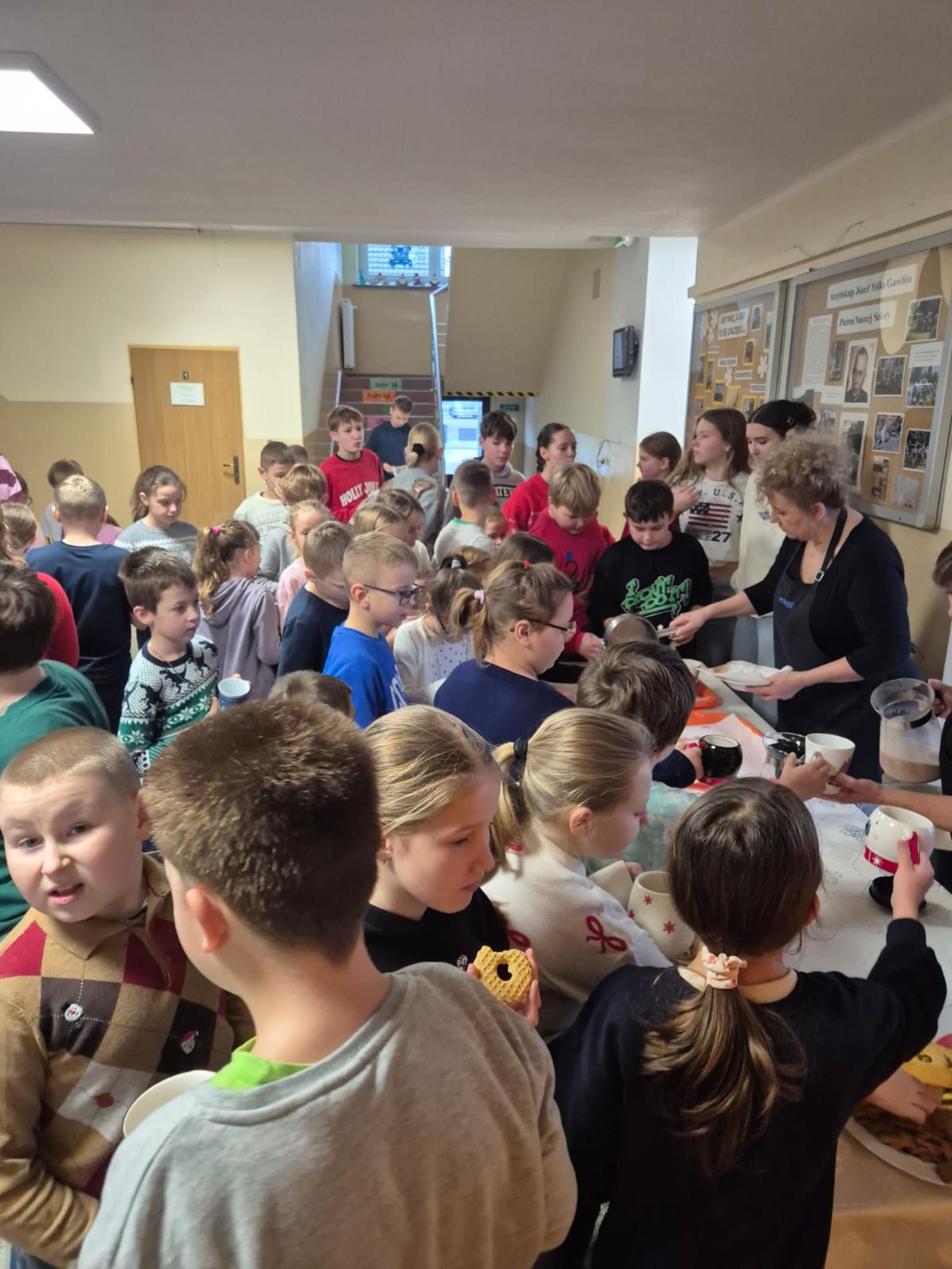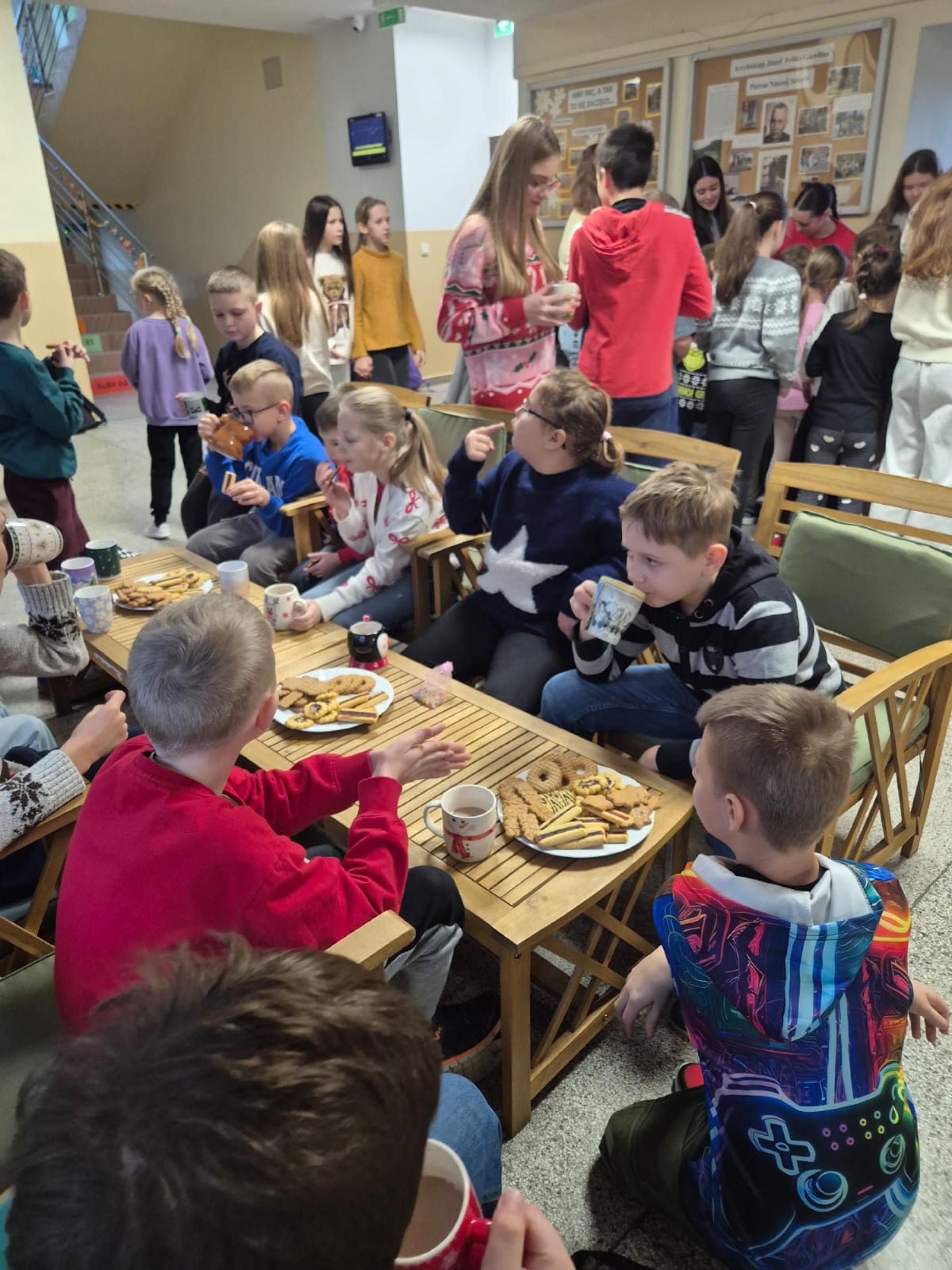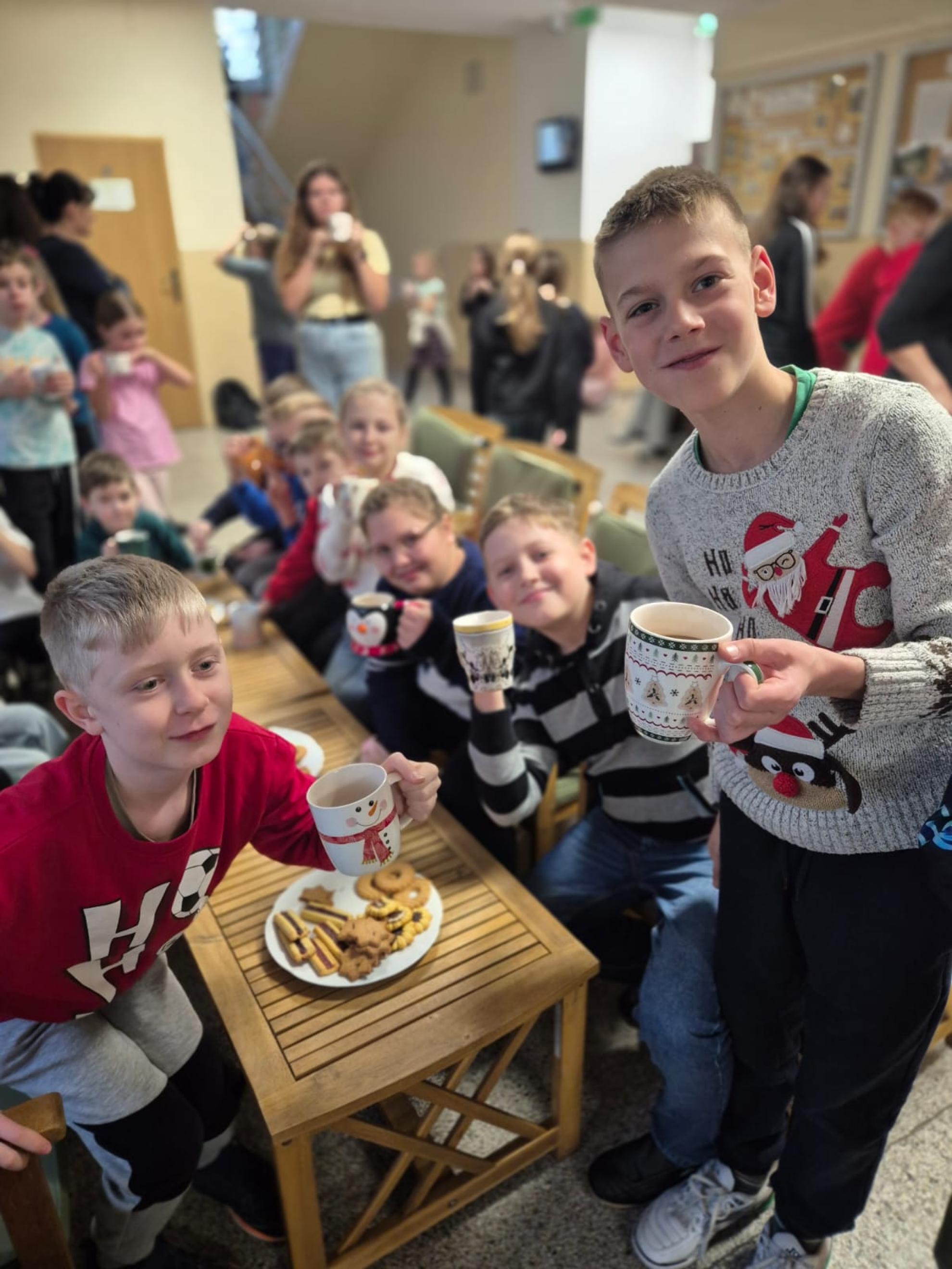 Uczniowie przyszli do szkoły w swoich najcieplejszych sweterkach, a na szkolnym korytarzu unosił się zapach pysznego kakao. Uczniowie delektowali się smakiem kakao pijąc go z własnych, przyniesionych z domów kubeczków. Mogli również poczęstować się świątecznymi pierniczkami!