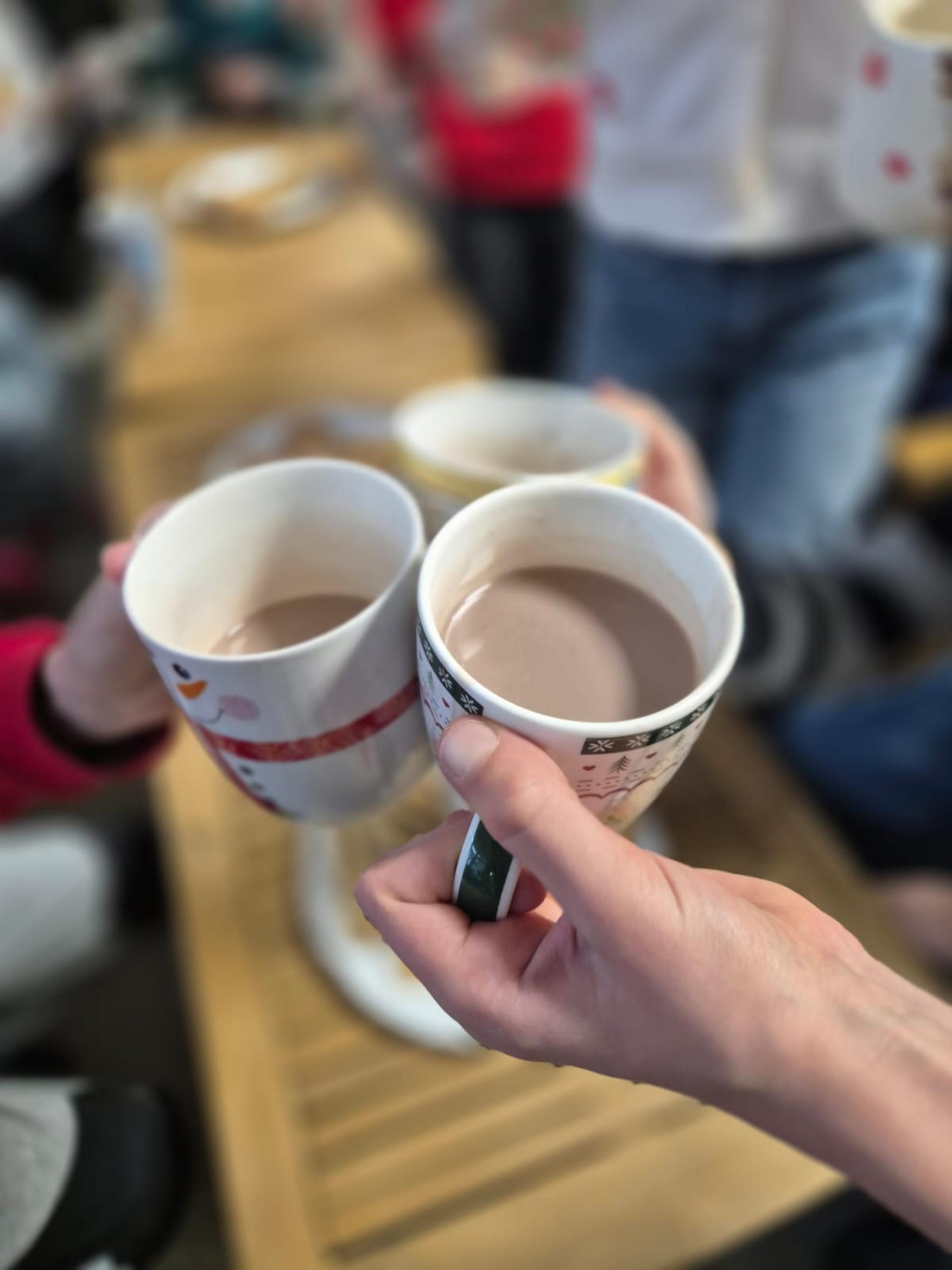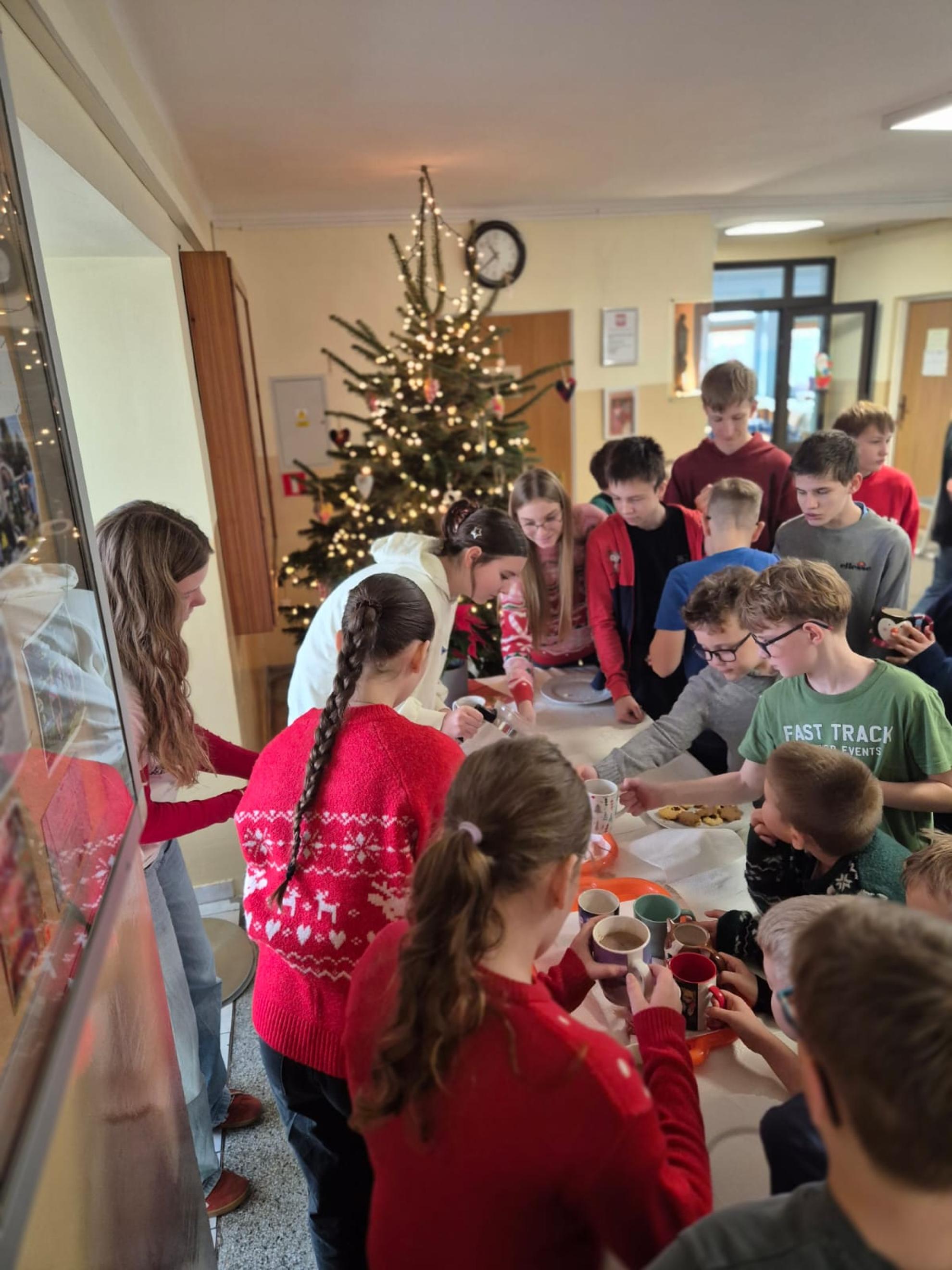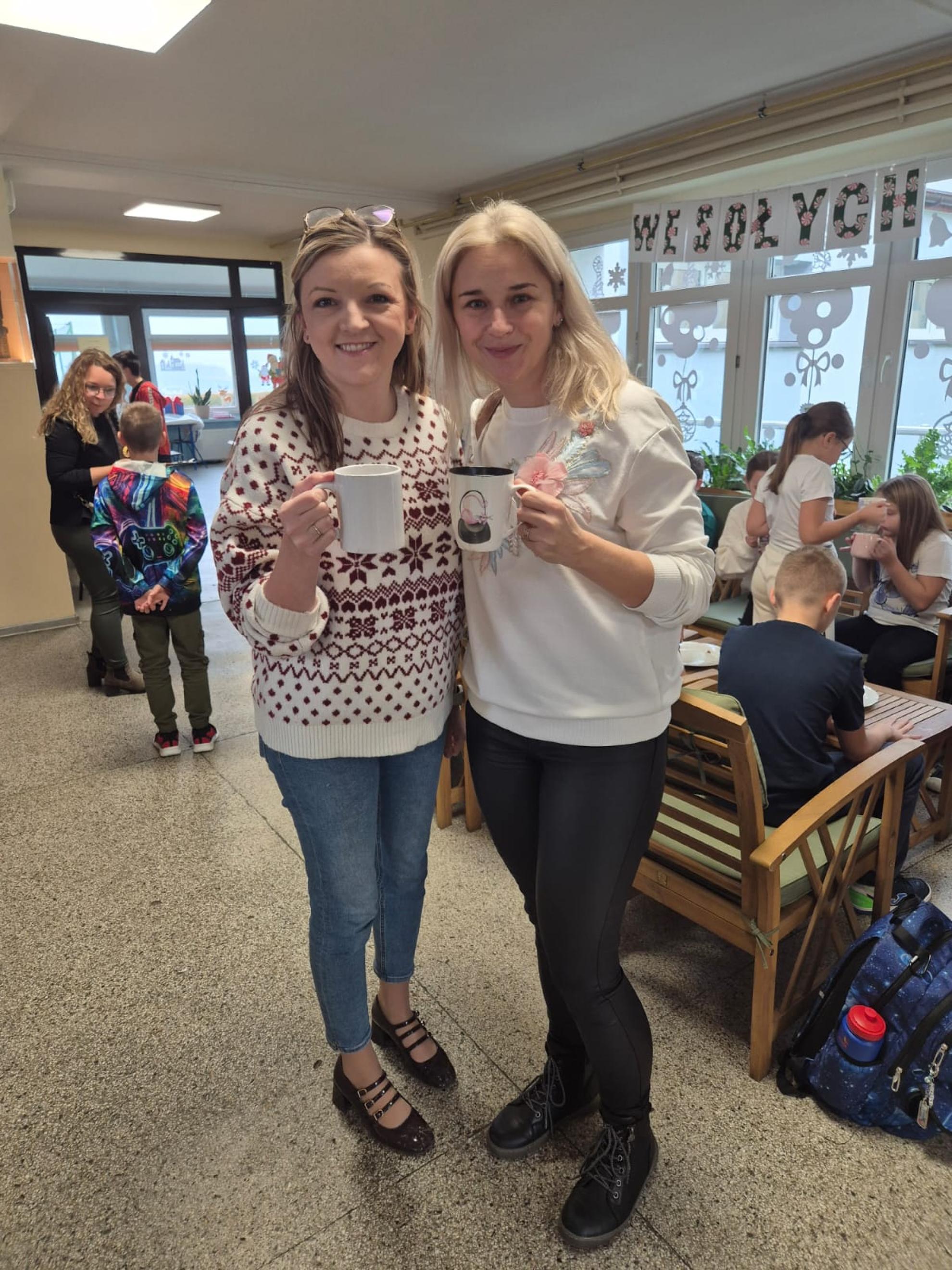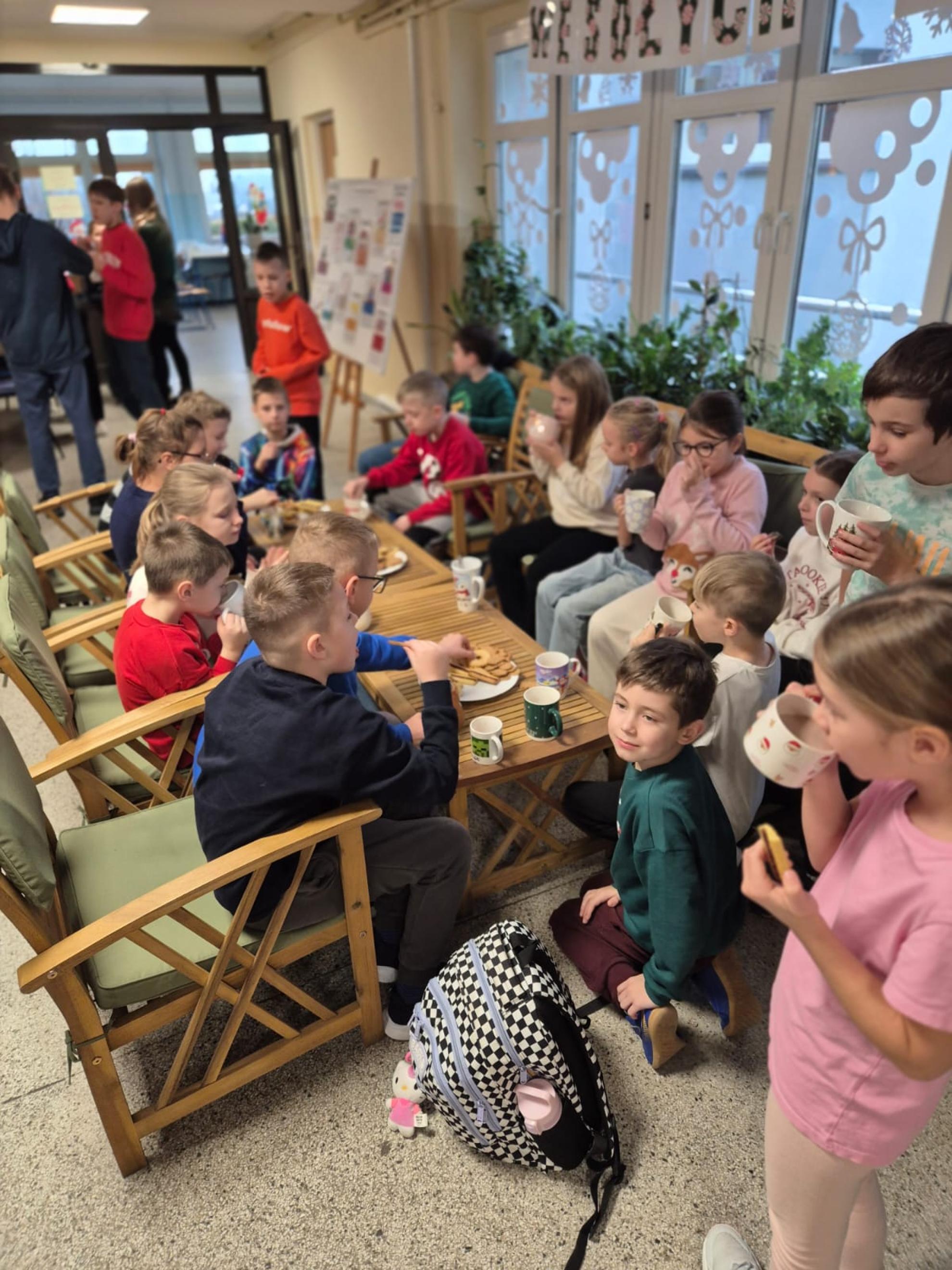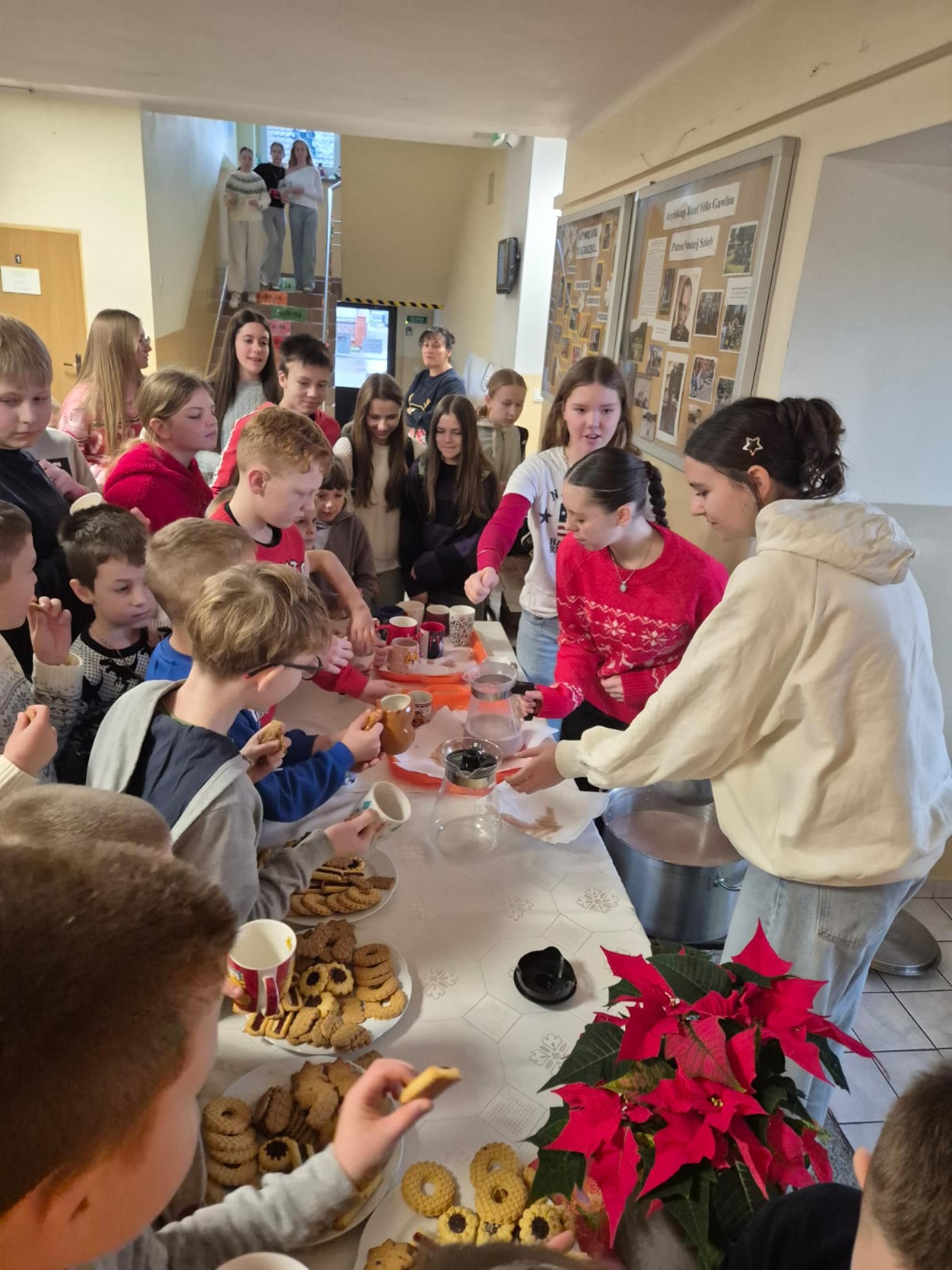 Uczniowie przyszli do szkoły w swoich najcieplejszych sweterkach, a na szkolnym korytarzu unosił się zapach pysznego kakao. Uczniowie delektowali się smakiem kakao pijąc go z własnych, przyniesionych z domów kubeczków. Mogli również poczęstować się świątecznymi pierniczkami!
