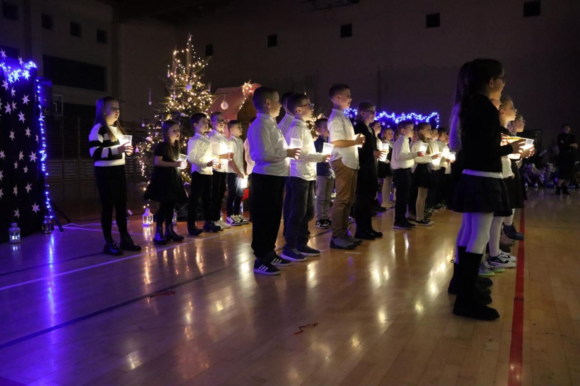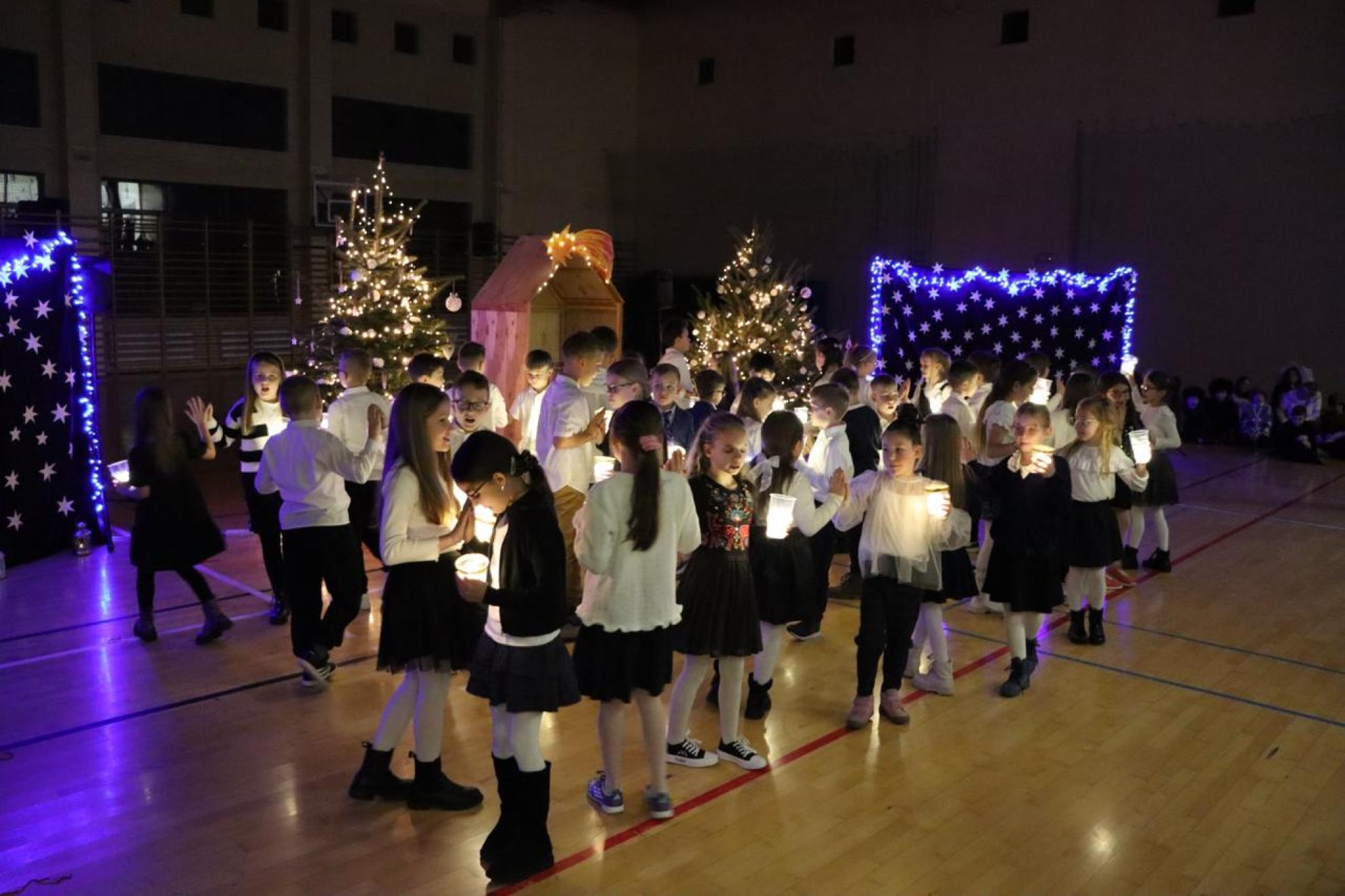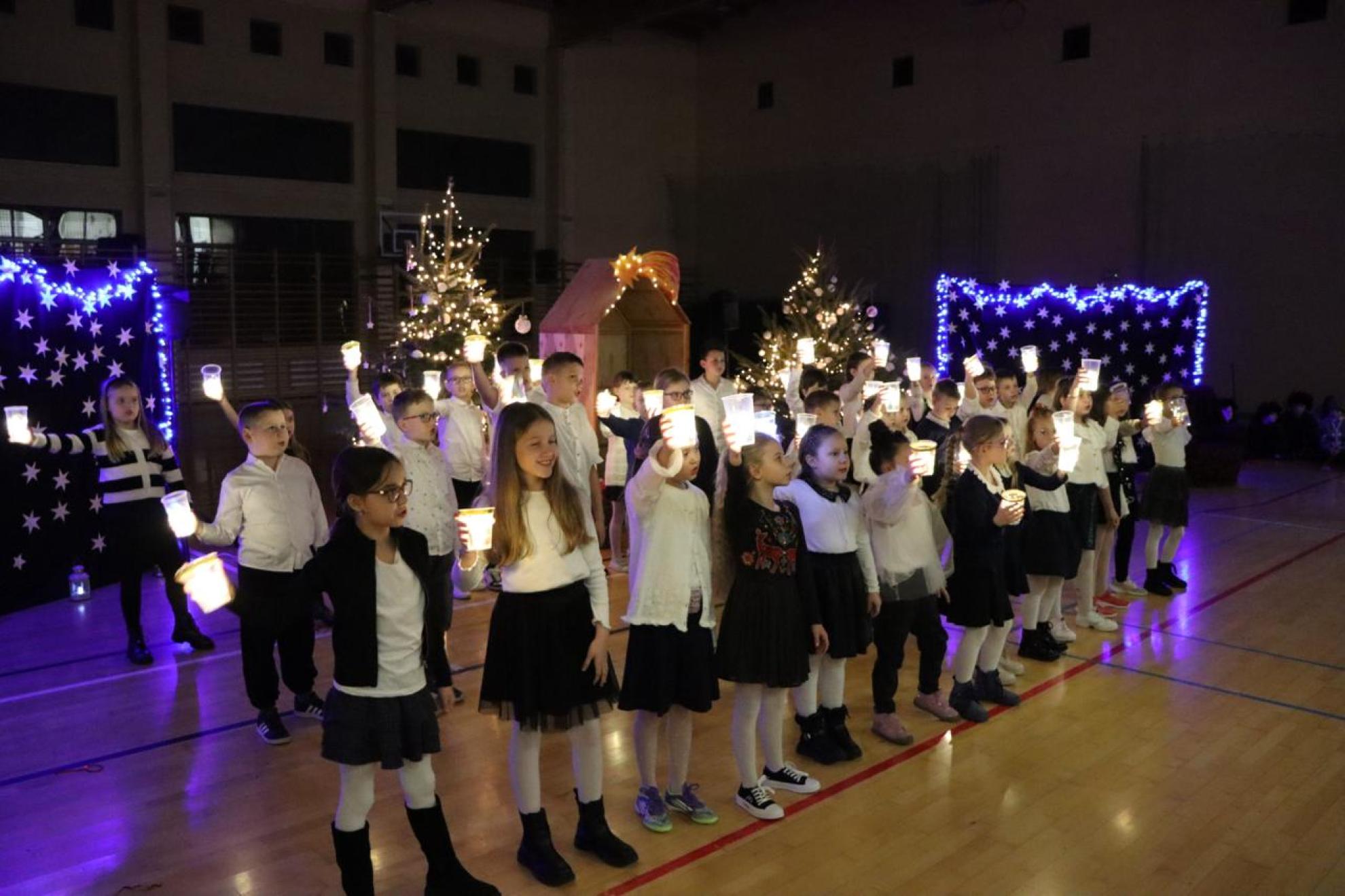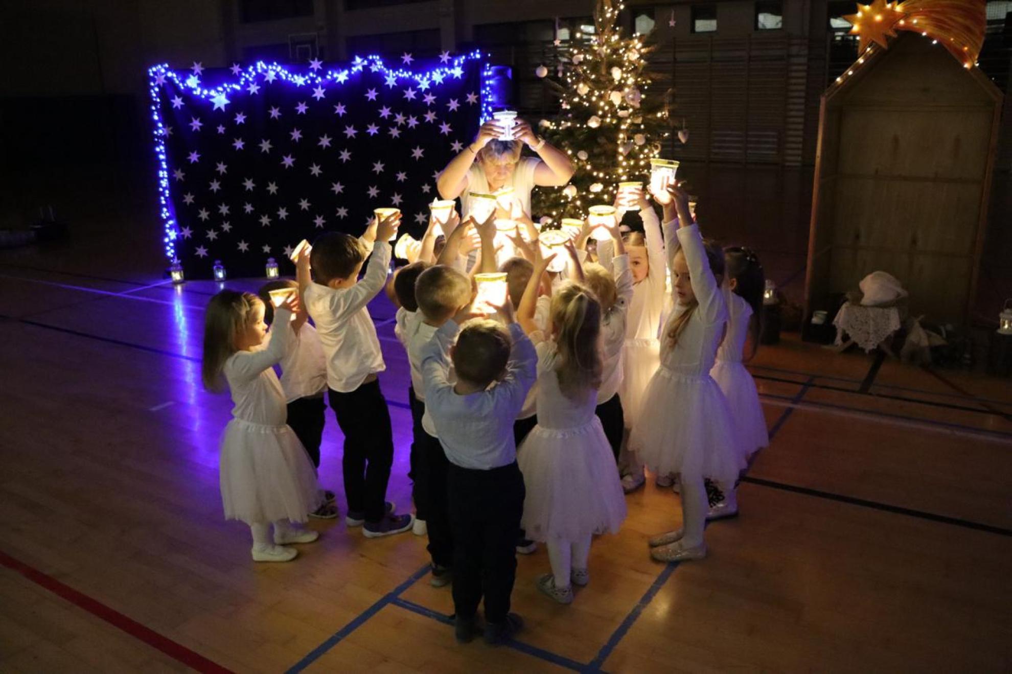 Szczególnym momentem były jasełka w wykonaniu uczniów klas IV–VII, które wprowadziły wszystkich w refleksyjny, bożonarodzeniowy nastrój. Kolejną część programu wypełniły występy najmłodszych artystów. Przedszkolaki z grupy maluszków zaprezentowały taniec do piosenki „Światełka Basi”, natomiast grupa starszaków zachwyciła energicznym tańcem do utworu „Jingle Bells”. Na zakończenie części artystycznej uczniowie klas I–III zaśpiewali świąteczną piosenkę „Wesołych Świąt”.