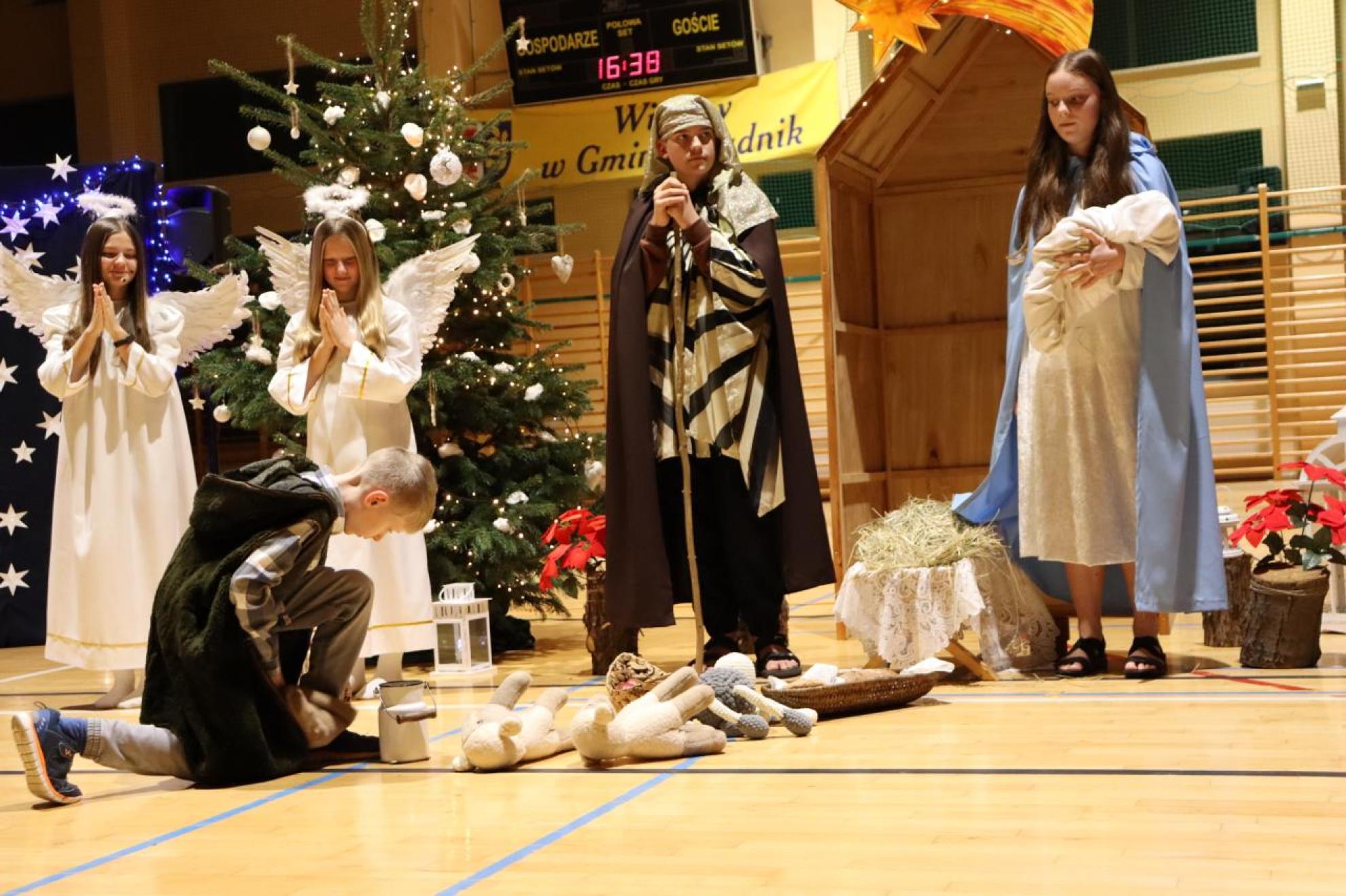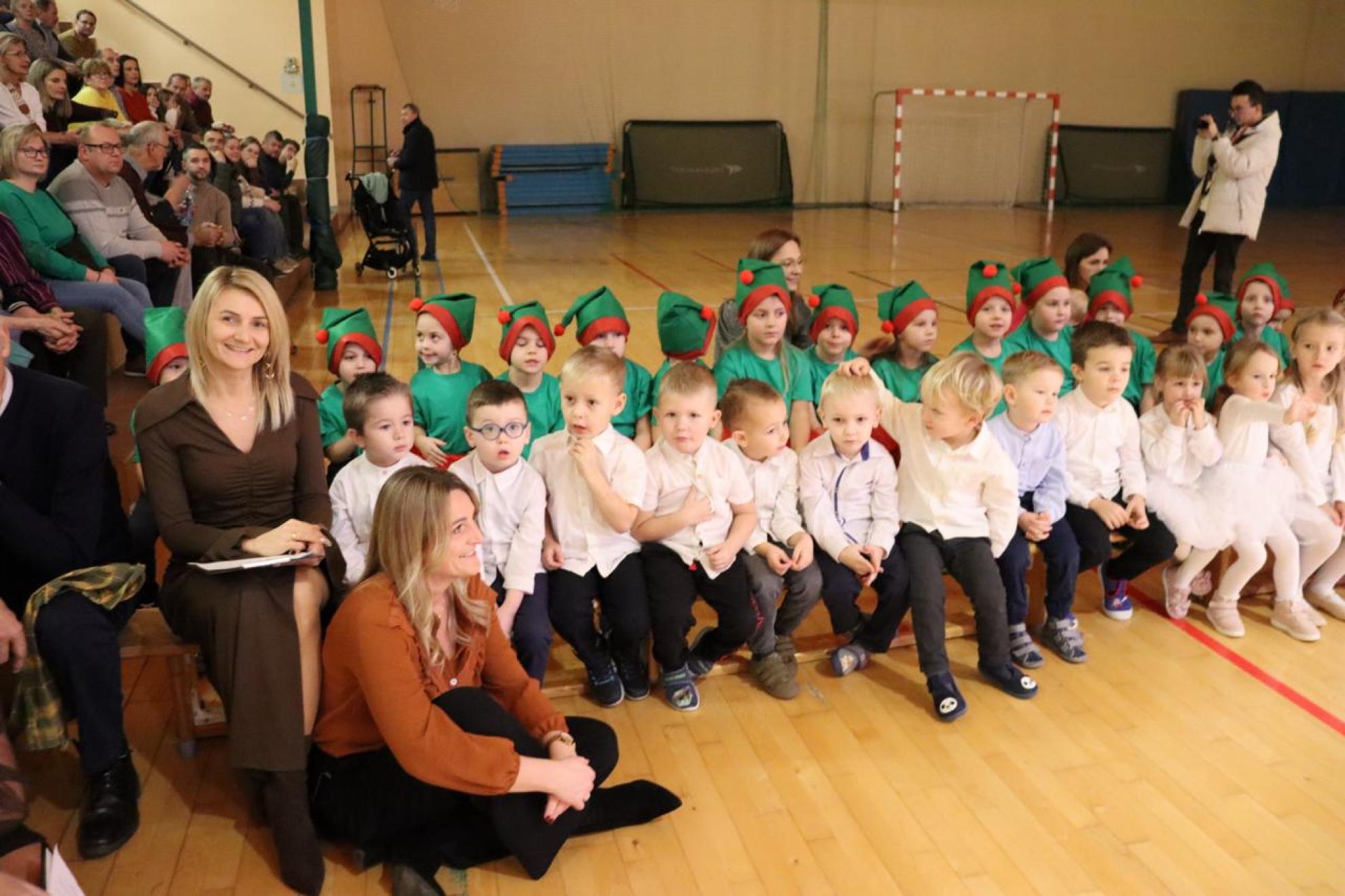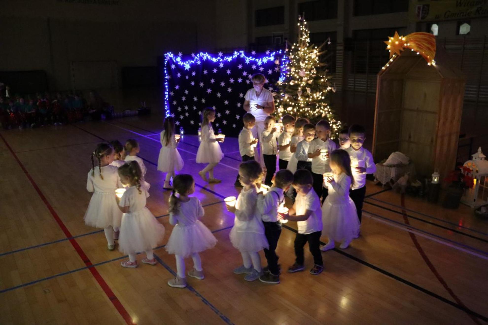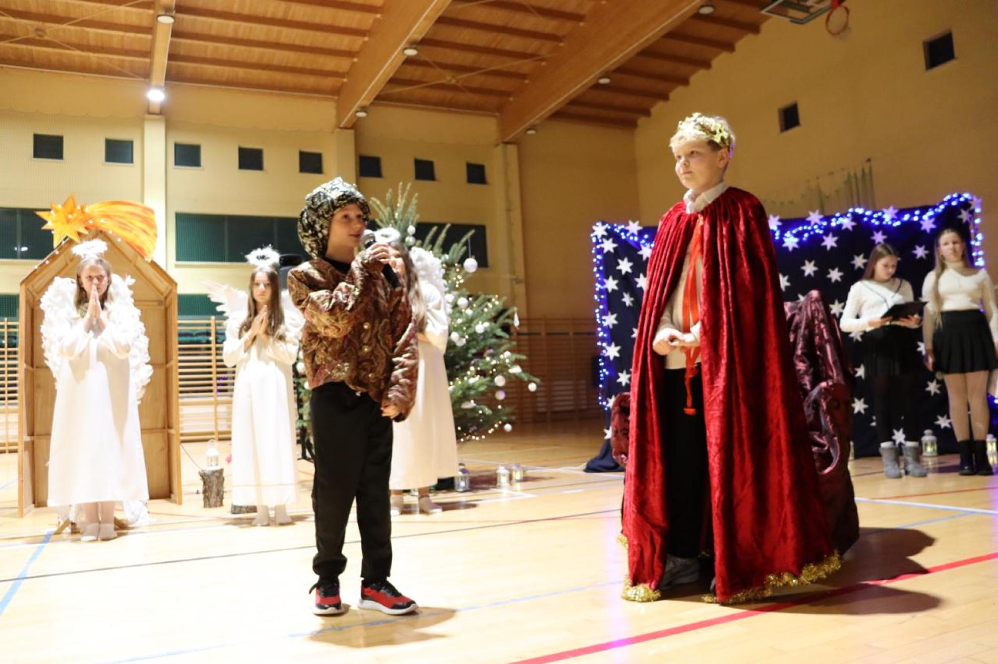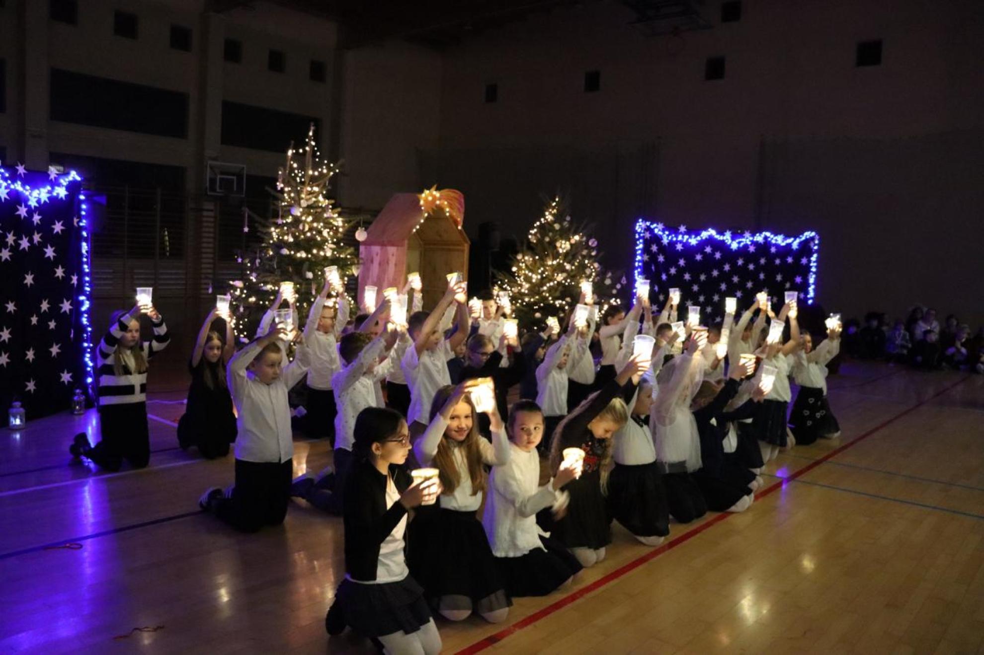 Szczególnym momentem były jasełka w wykonaniu uczniów klas IV–VII, które wprowadziły wszystkich w refleksyjny, bożonarodzeniowy nastrój. Kolejną część programu wypełniły występy najmłodszych artystów. Przedszkolaki z grupy maluszków zaprezentowały taniec do piosenki „Światełka Basi”, natomiast grupa starszaków zachwyciła energicznym tańcem do utworu „Jingle Bells”. Na zakończenie części artystycznej uczniowie klas I–III zaśpiewali świąteczną piosenkę „Wesołych Świąt”.