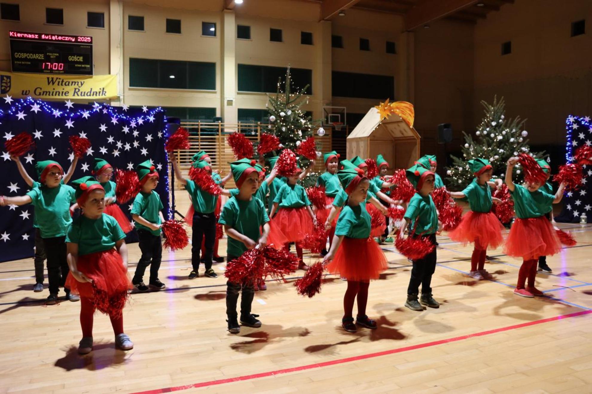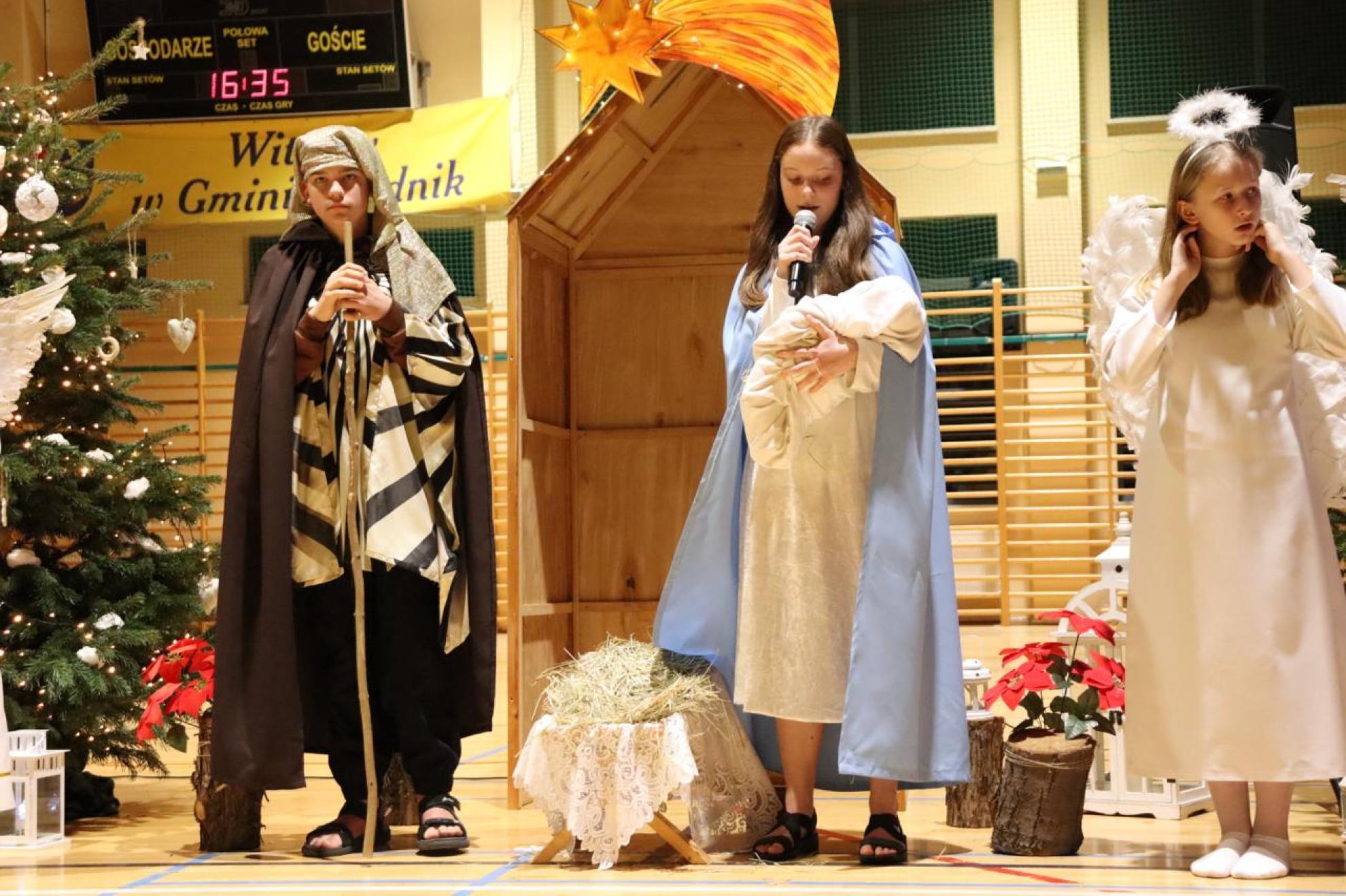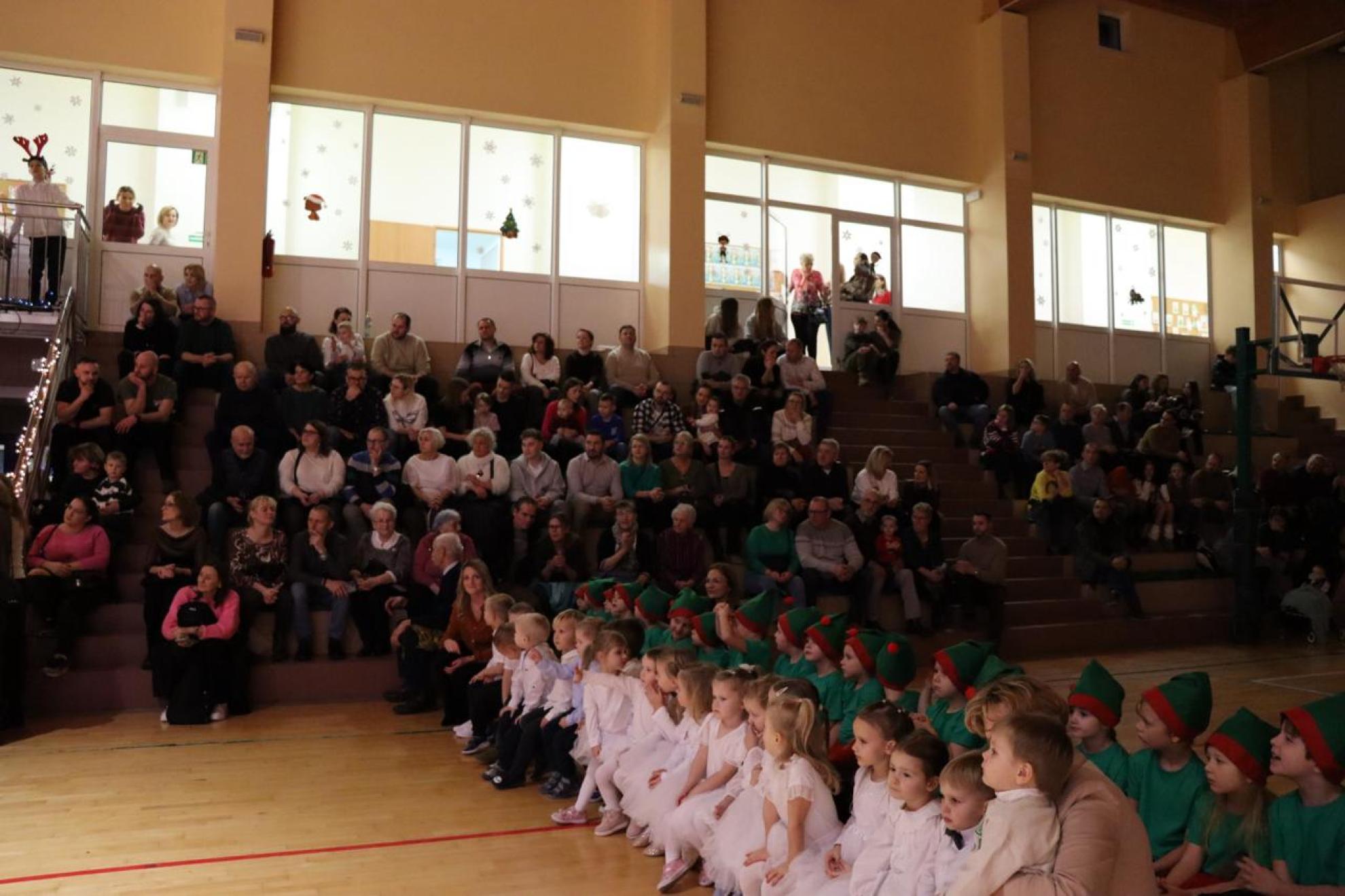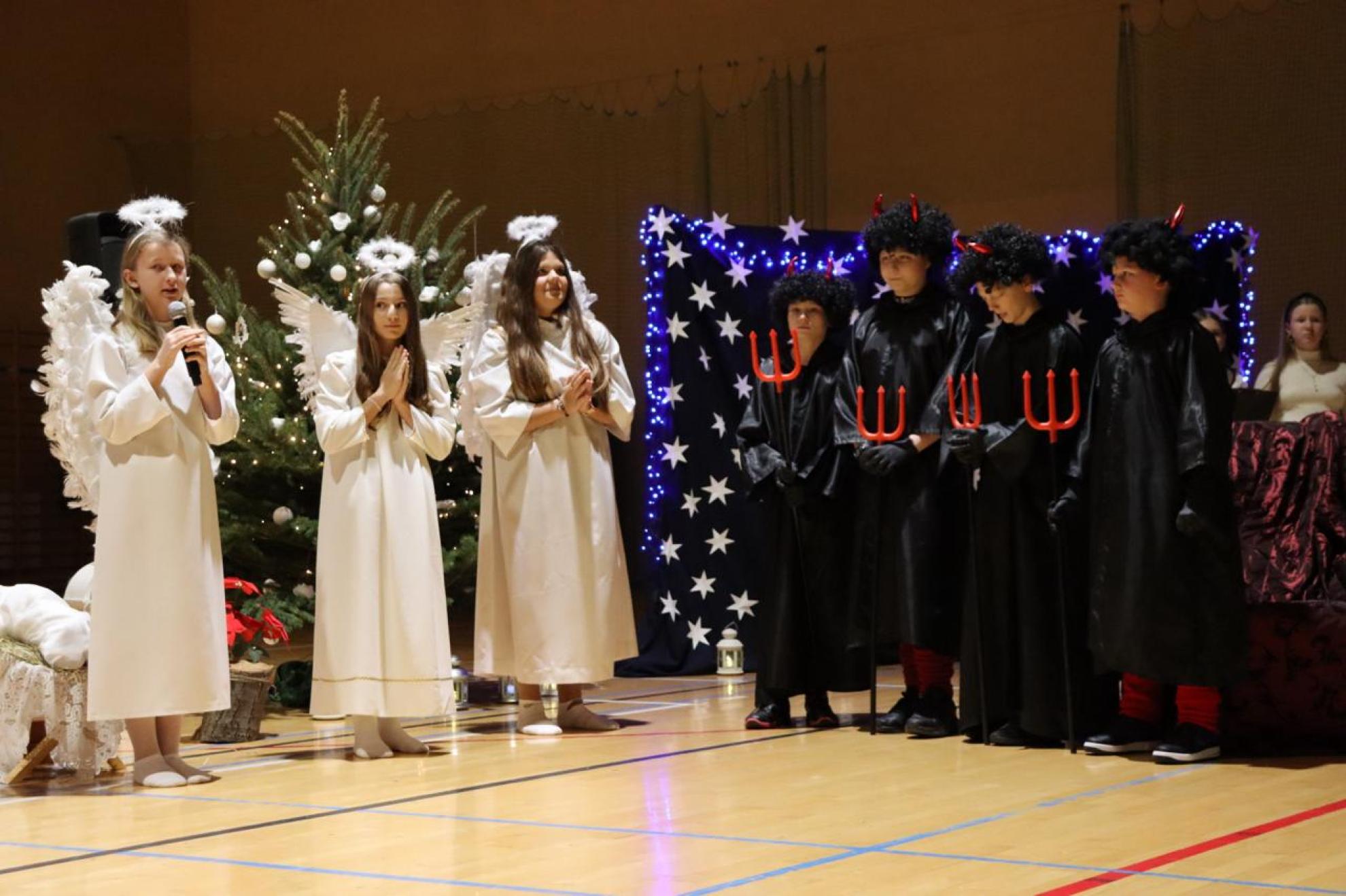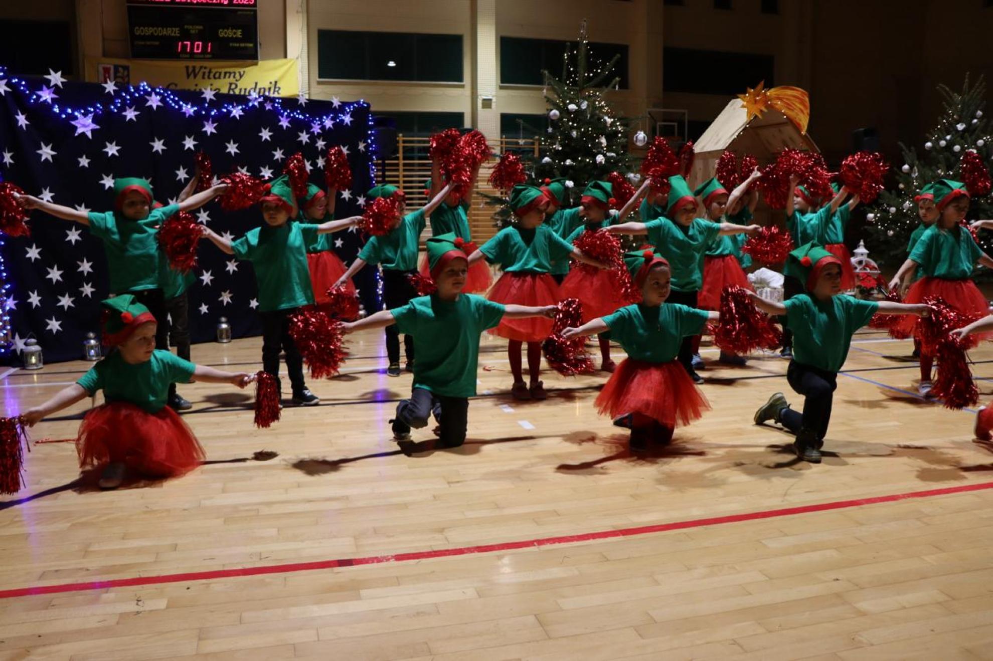 Szczególnym momentem były jasełka w wykonaniu uczniów klas IV–VII, które wprowadziły wszystkich w refleksyjny, bożonarodzeniowy nastrój. Kolejną część programu wypełniły występy najmłodszych artystów. Przedszkolaki z grupy maluszków zaprezentowały taniec do piosenki „Światełka Basi”, natomiast grupa starszaków zachwyciła energicznym tańcem do utworu „Jingle Bells”. Na zakończenie części artystycznej uczniowie klas I–III zaśpiewali świąteczną piosenkę „Wesołych Świąt”.