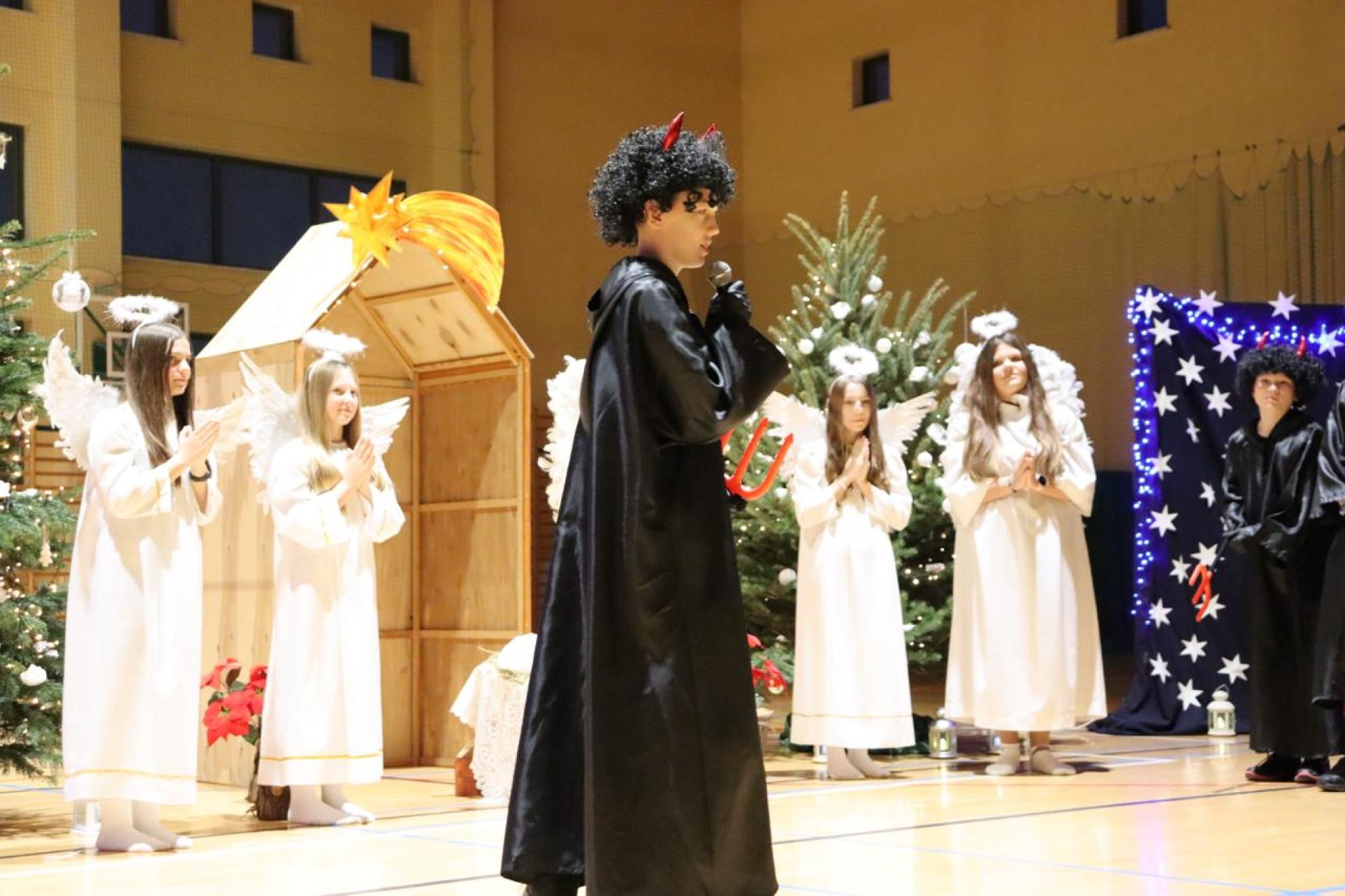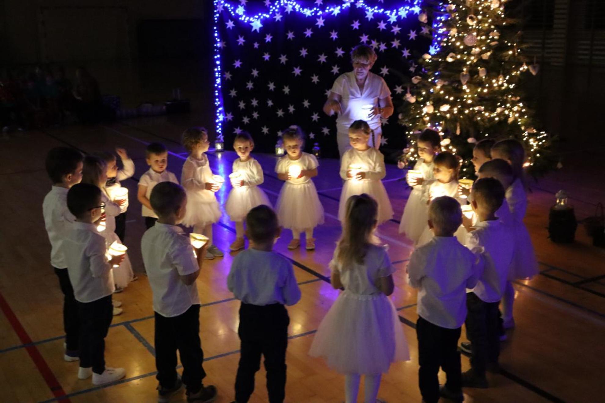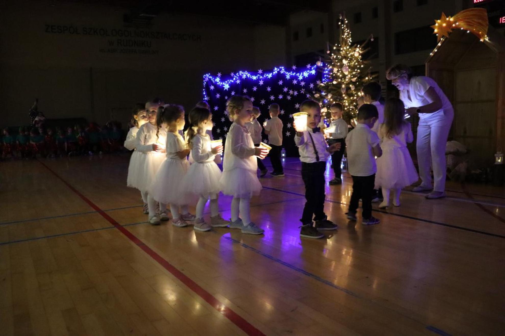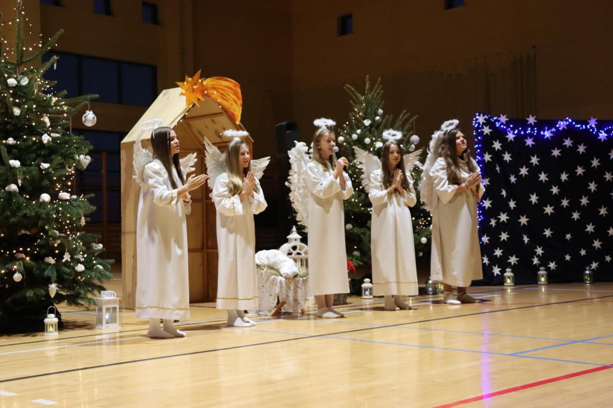 Szczególnym momentem były jasełka w wykonaniu uczniów klas IV–VII, które wprowadziły wszystkich w refleksyjny, bożonarodzeniowy nastrój. Kolejną część programu wypełniły występy najmłodszych artystów. Przedszkolaki z grupy maluszków zaprezentowały taniec do piosenki „Światełka Basi”, natomiast grupa starszaków zachwyciła energicznym tańcem do utworu „Jingle Bells”. Na zakończenie części artystycznej uczniowie klas I–III zaśpiewali świąteczną piosenkę „Wesołych Świąt”.