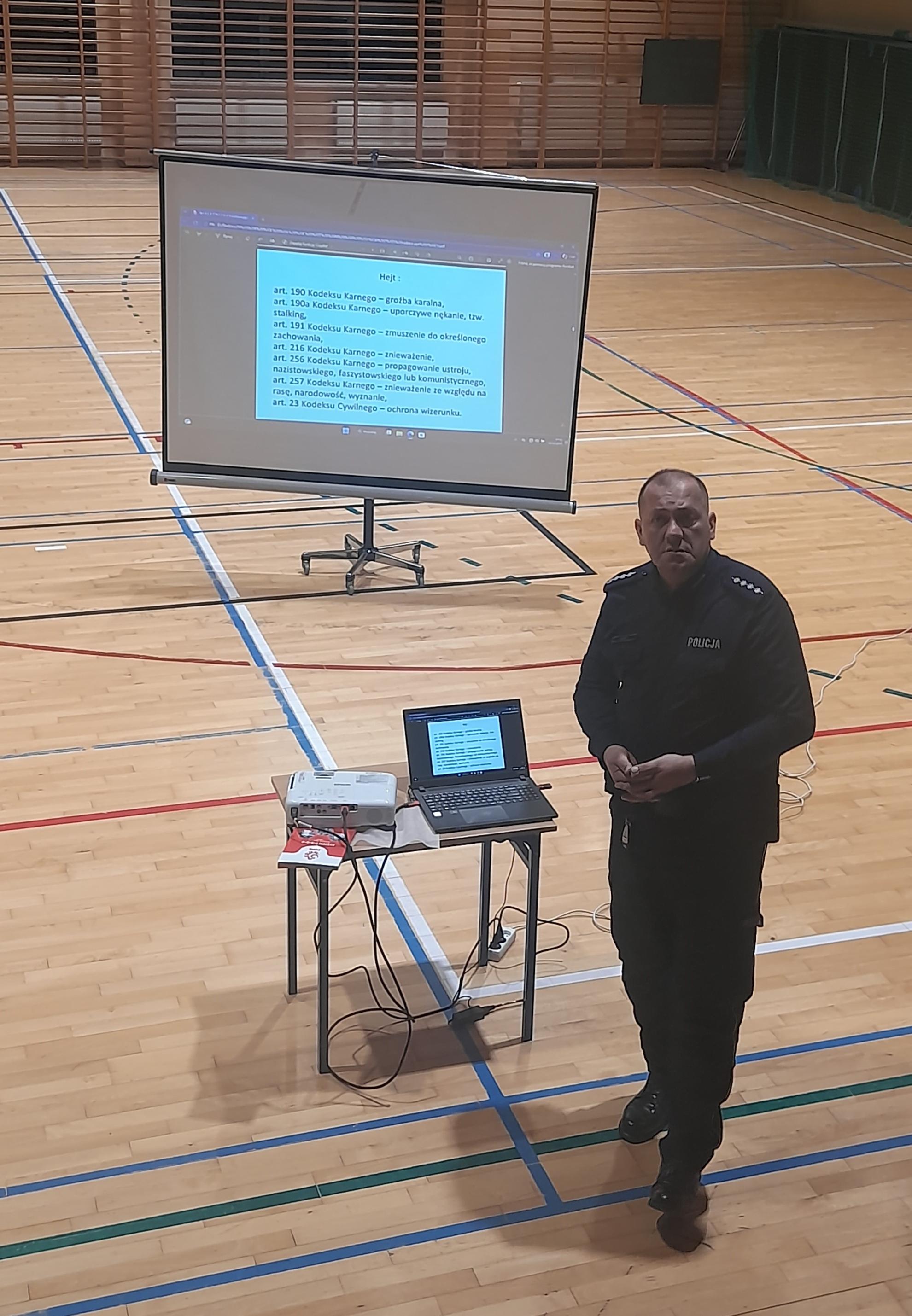 Policjant zwrócił szczególną uwagę na rolę rodziców w kształtowaniu bezpiecznych nawyków cyfrowych u dzieci, podkreślając znaczenie rozmowy, kontroli rodzicielskiej oraz ustalania jasnych zasad korzystania z Internetu. Przedstawił również informacje dotyczące odpowiedzialności karnej nieletnich, wyjaśniając, jakie zachowania mogą stanowić naruszenie prawa oraz jakie konsekwencje prawne mogą z nich wynikać, zarówno dla dzieci, jak i ich opiekunów.