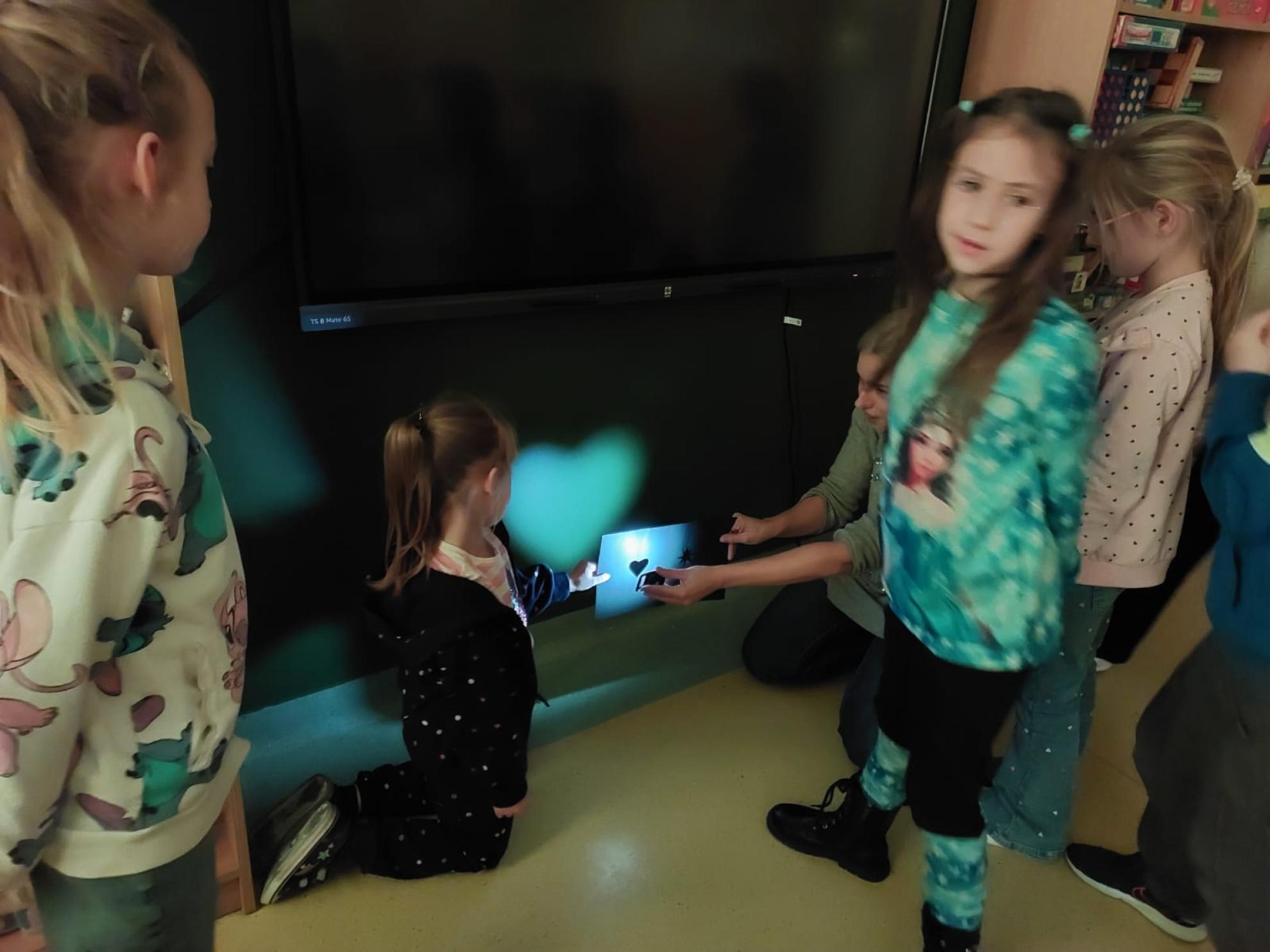 Podczas spotkania uczestnicy eksperymentowali z pochłanianiem i odbijaniem światła, obserwując, jak różne powierzchnie reagują na jego działanie. Rozmawialiśmy także o świetle naturalnym i sztucznym, porównując ich źródła i zastosowanie. Dużo radości sprawiło dzieciom również „łapanie zajączków” – świetlnych refleksów pojawiających się na ścianach sali.