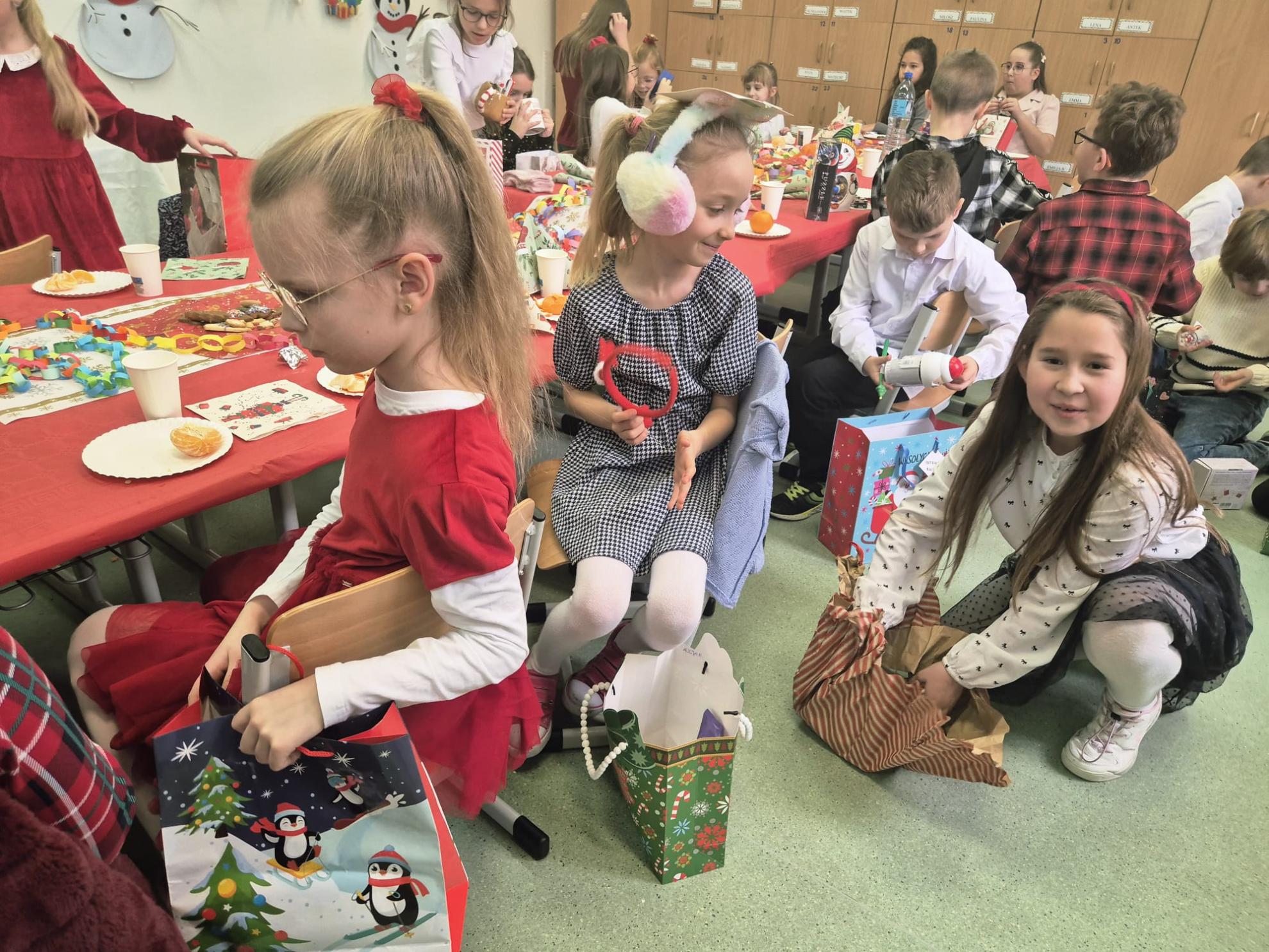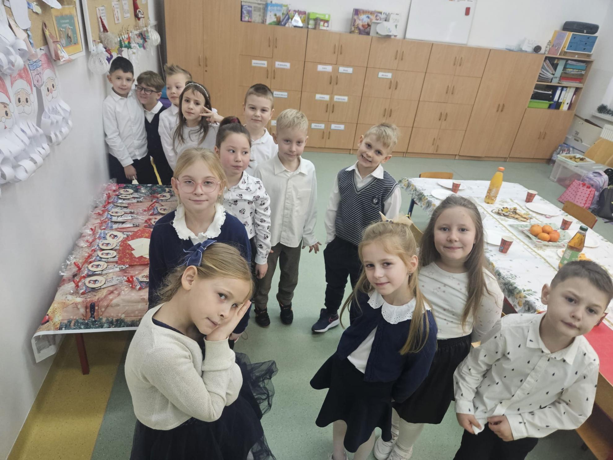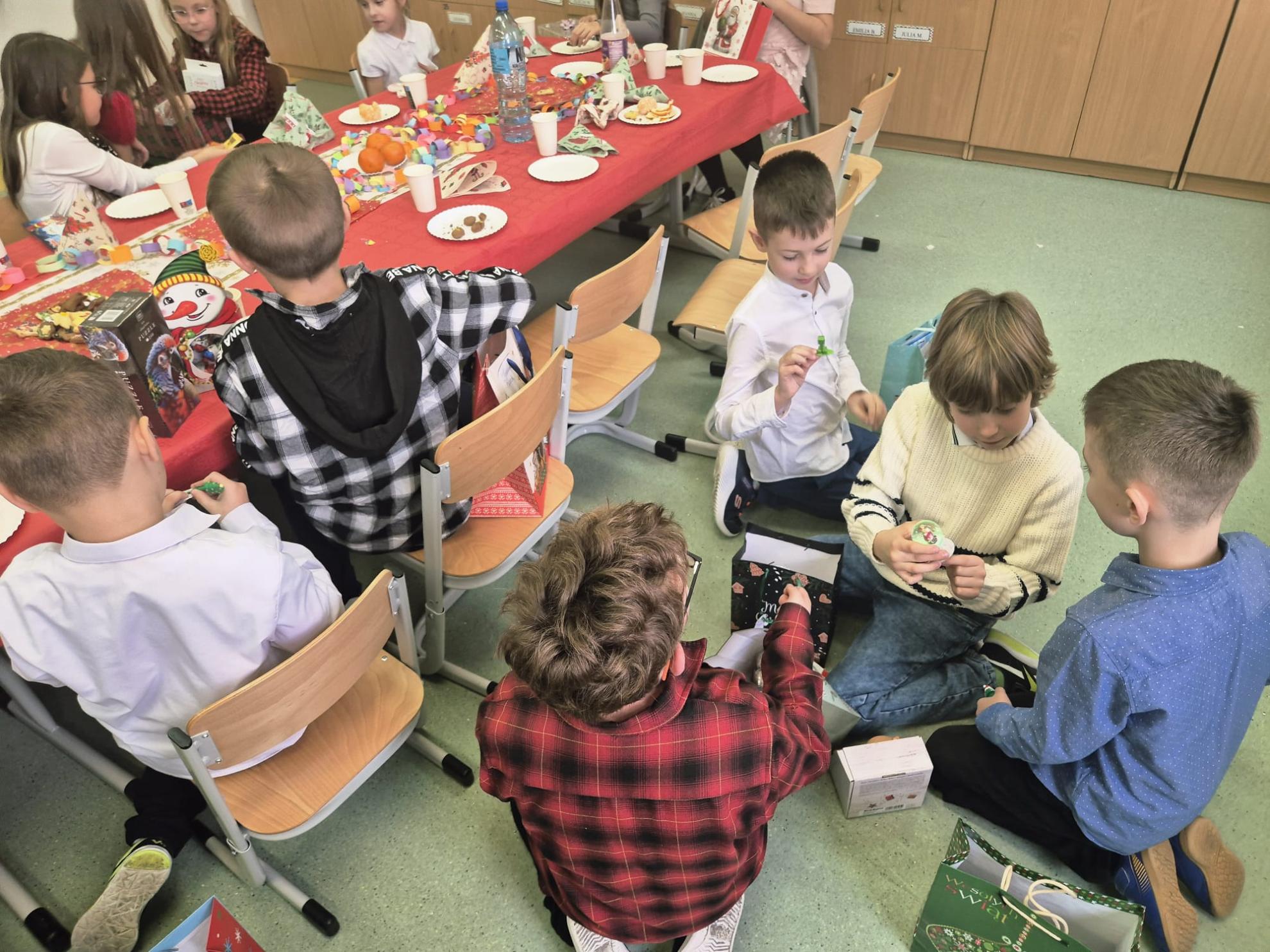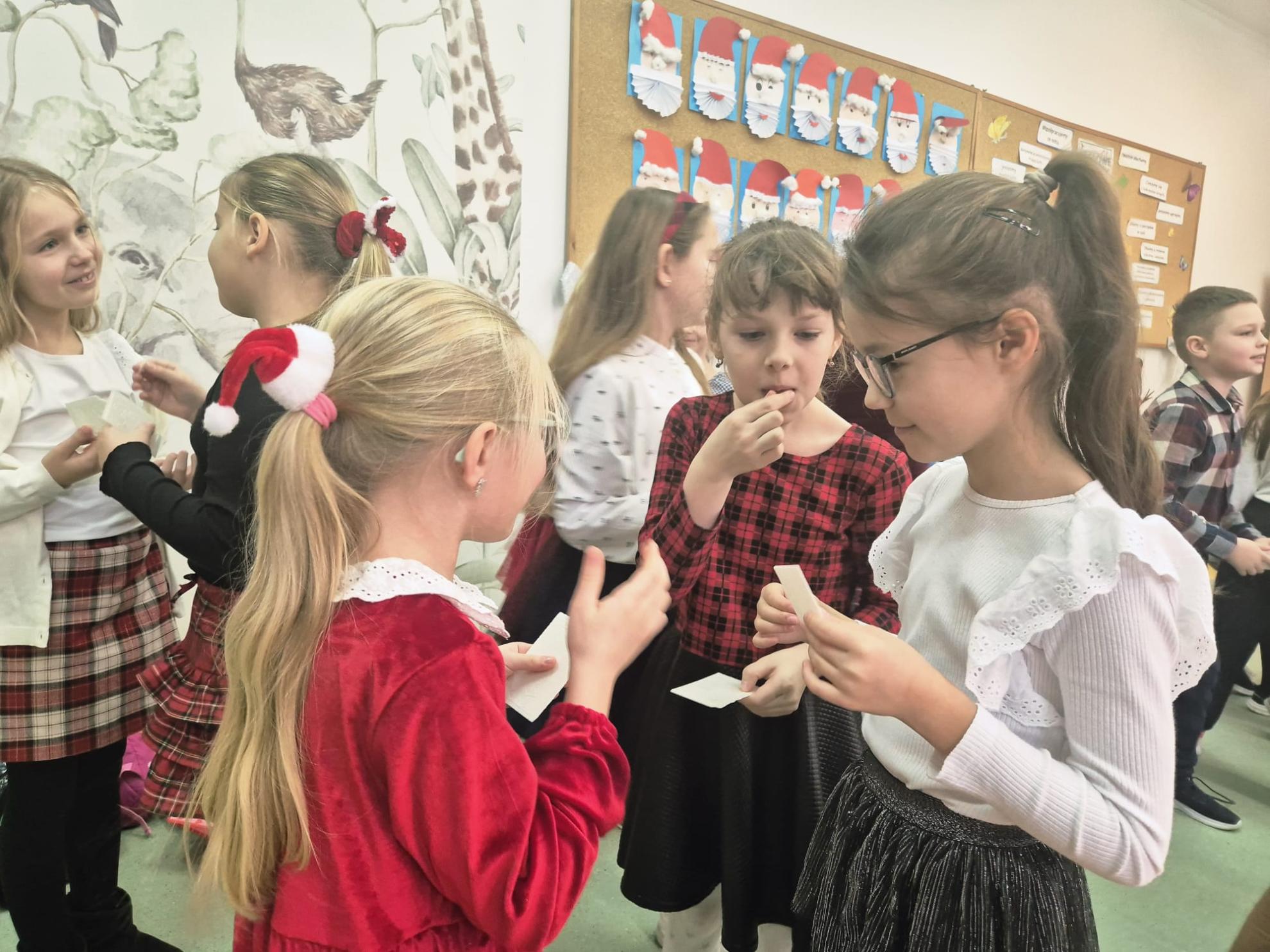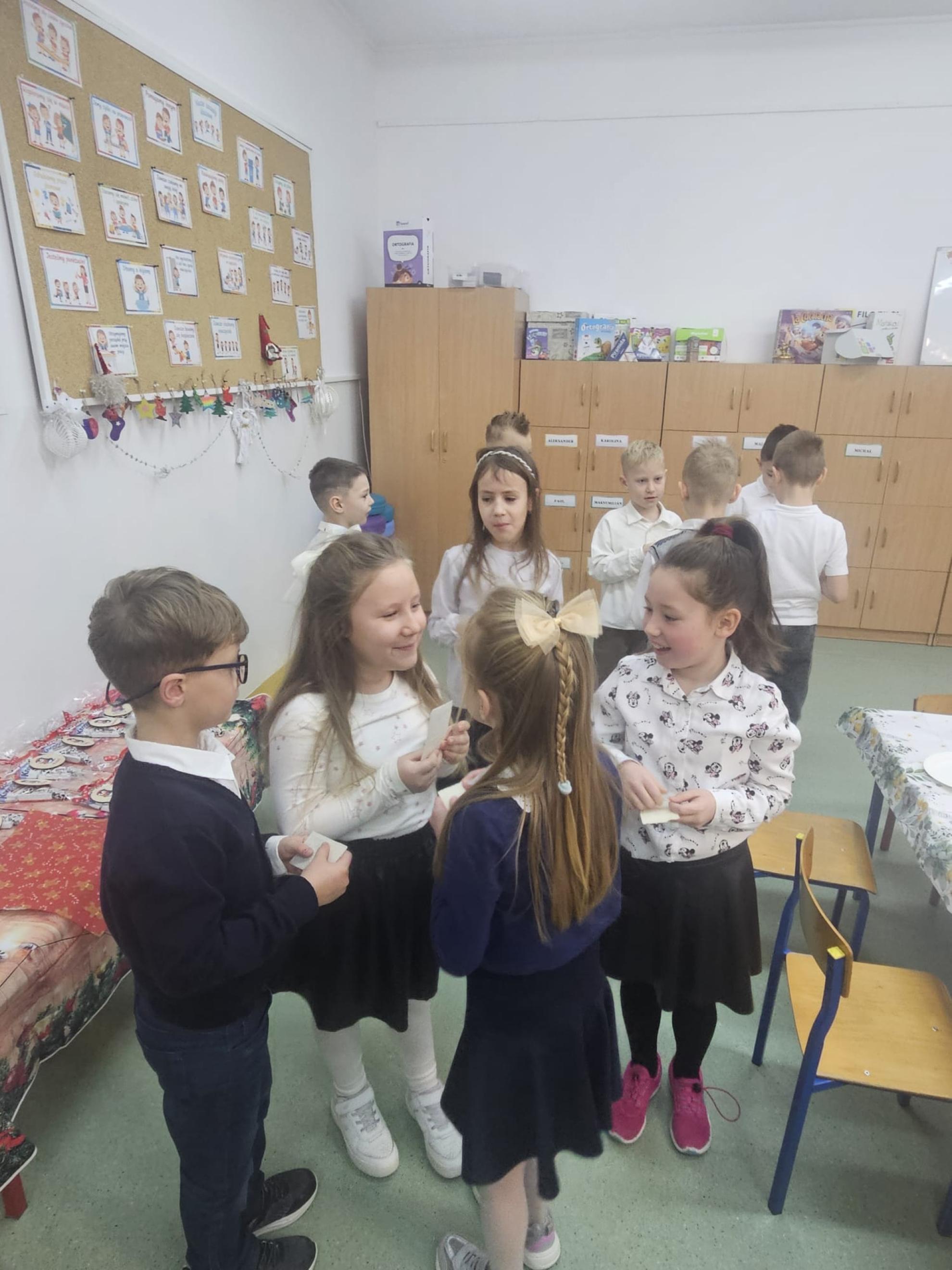 Następnie uczniowie udali się do swoich klas na spotkania opłatkowe. W gronie koleżanek i kolegów składali sobie życzenia, wspólnie zasiedli do wigilijnego stołu oraz obdarowali się drobnymi upominkami.