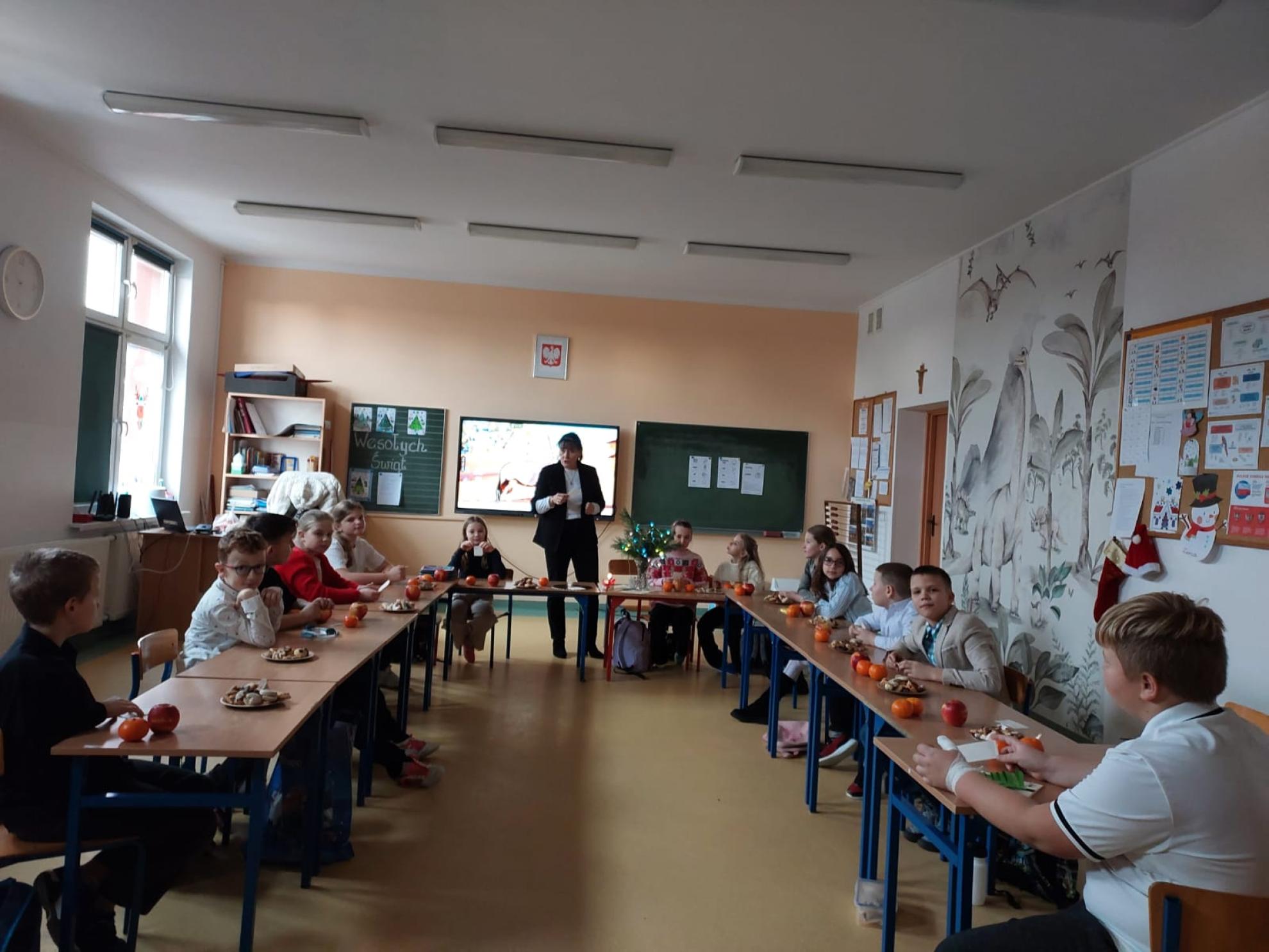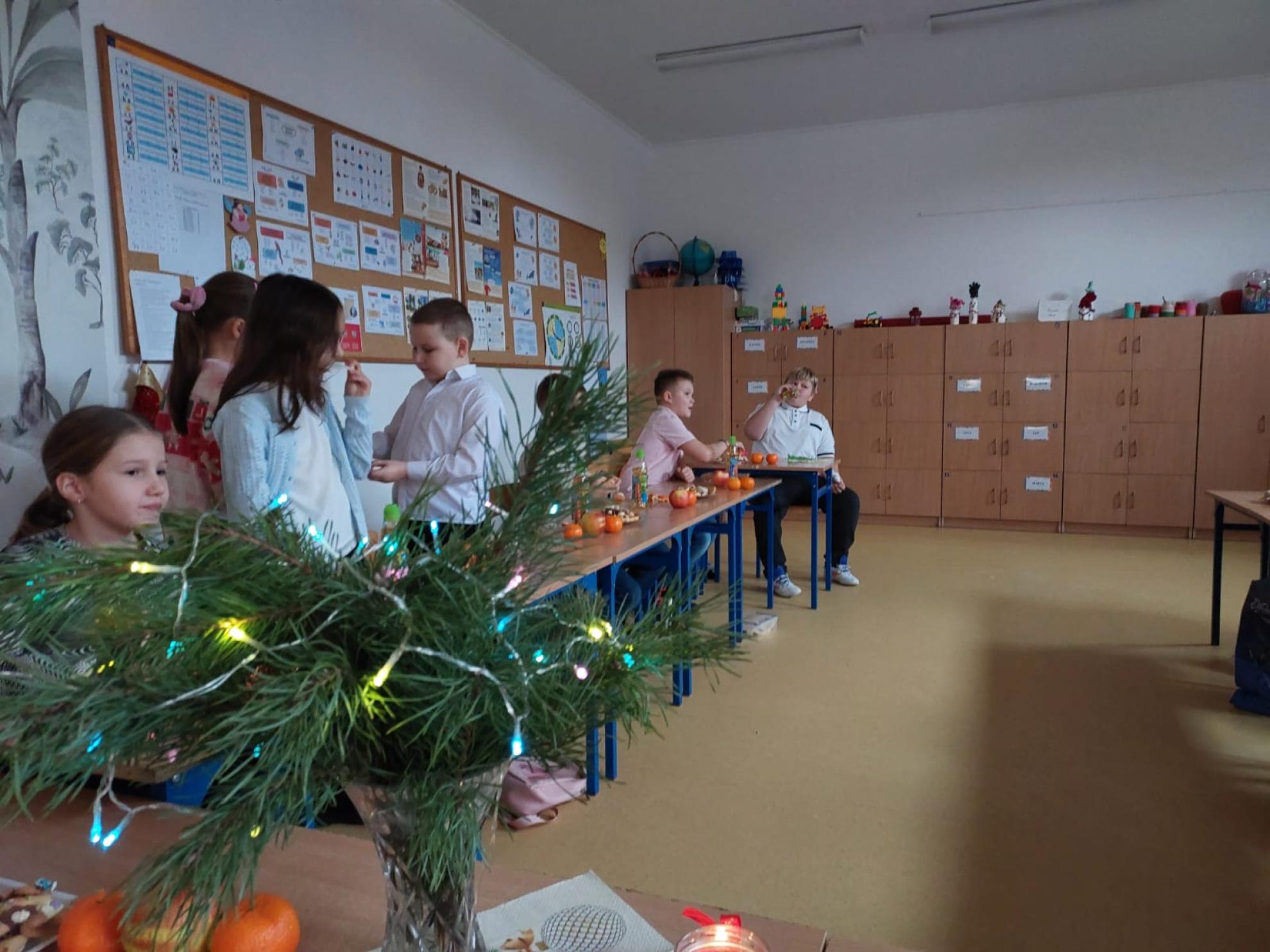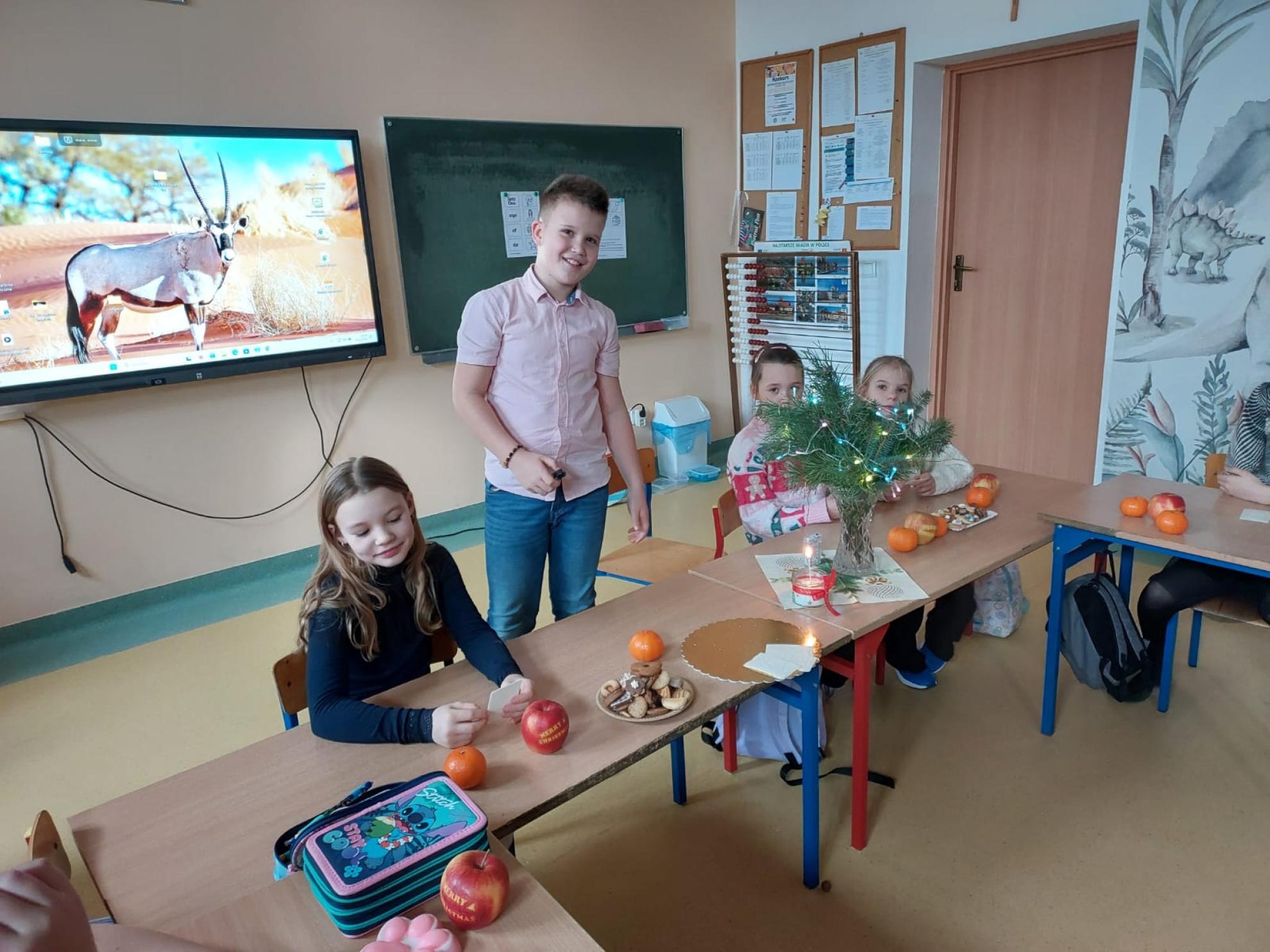 Wspólnie śpiewano kolędy oraz wysłuchano pięknej opowieści wigilijnej przygotowanej przez uczniów klasy VIII.