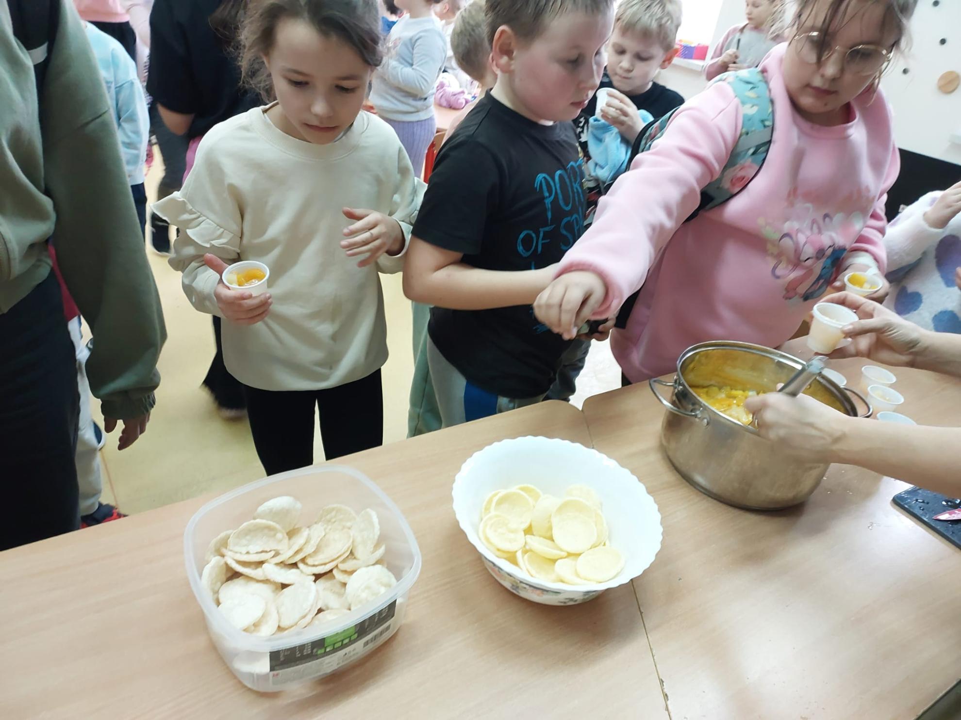 Dzieci miały okazję spróbować egzotycznego deseru z owoców: ananasa, brzoskwiń, mandarynek i mango, zanurzonych w słodkim, naturalnym syropie. Całość podawana była z wafelkami pszennymi i kukurydzianymi.