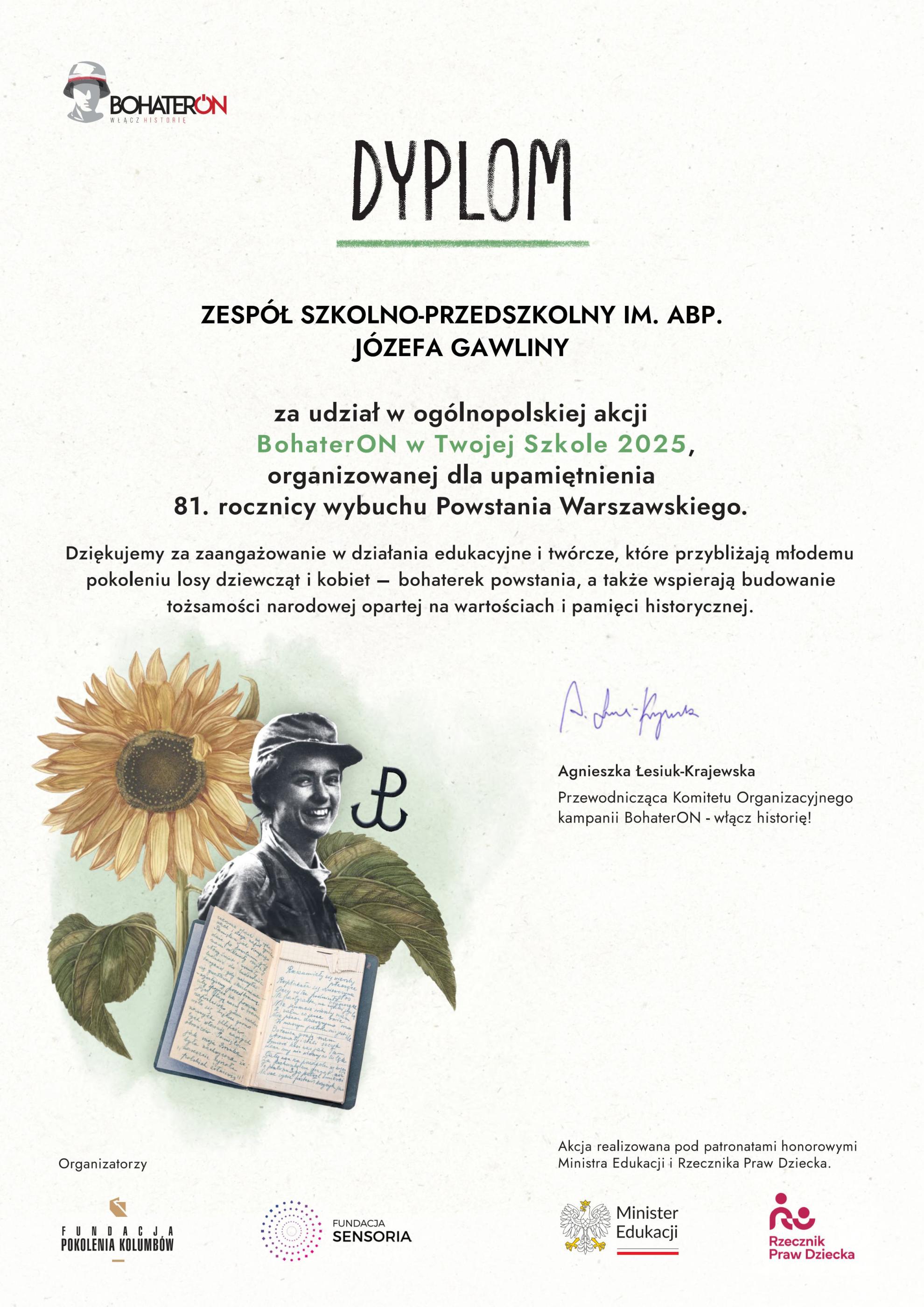 Po raz kolejny uczniowie naszej szkoły przystąpili do ogólnopolskiej akcji o tematyce historycznej BohaterON w Twojej Szkole w ramach edycji 2025 roku,organizowanej dla upamiętnienia 81.rocznicy wybuchu Powstania Warszawskiego.Tematyką kampanii jest Polskie Państwo Podziemne i Powstanie Warszawskie.Corocznym celem organizatorów jest edukacja młodzieży w zakresie dziejów Polski XX wieku, promocja patriotycznych postaw, wzmacnianie poczucia tożsamości narodowej budowanie wrażliwości społecznej. Tegoroczna edycja przybliżyła uczniom losy dziewcząt i kobiet-bohaterek powstania.Ogólnopolska akcja jest realizowana pod patronatami honorowymi Ministra Edukacji i Rzecznika Praw Dziecka. Dziękujemy organizatorom ogólnopolskiej kampanii Fundacji Pokolenia Kolumbów i Fundacji Sensoria za przesłane ciekawe materiały edukacyjne dla uczniów. Dziękujemy wszystkim uczniom biorącym udział w akcji, zwłaszcza klasy ósmej, którzy szczególnie zaangażowali się w prace w ramach akcji BohaterOn w Twojej Szkole. Podjęte prace i działania w ramach akcji zostały docenione przez organizatorów,którzy przesłali naszej szkole oraz uczestnikom akcji imienne dyplomy za zaangażowanie w działania edukacyjne i twórcze wspierające budowanie tożsamości narodowej opartej na wartościach i pamięci historycznej.