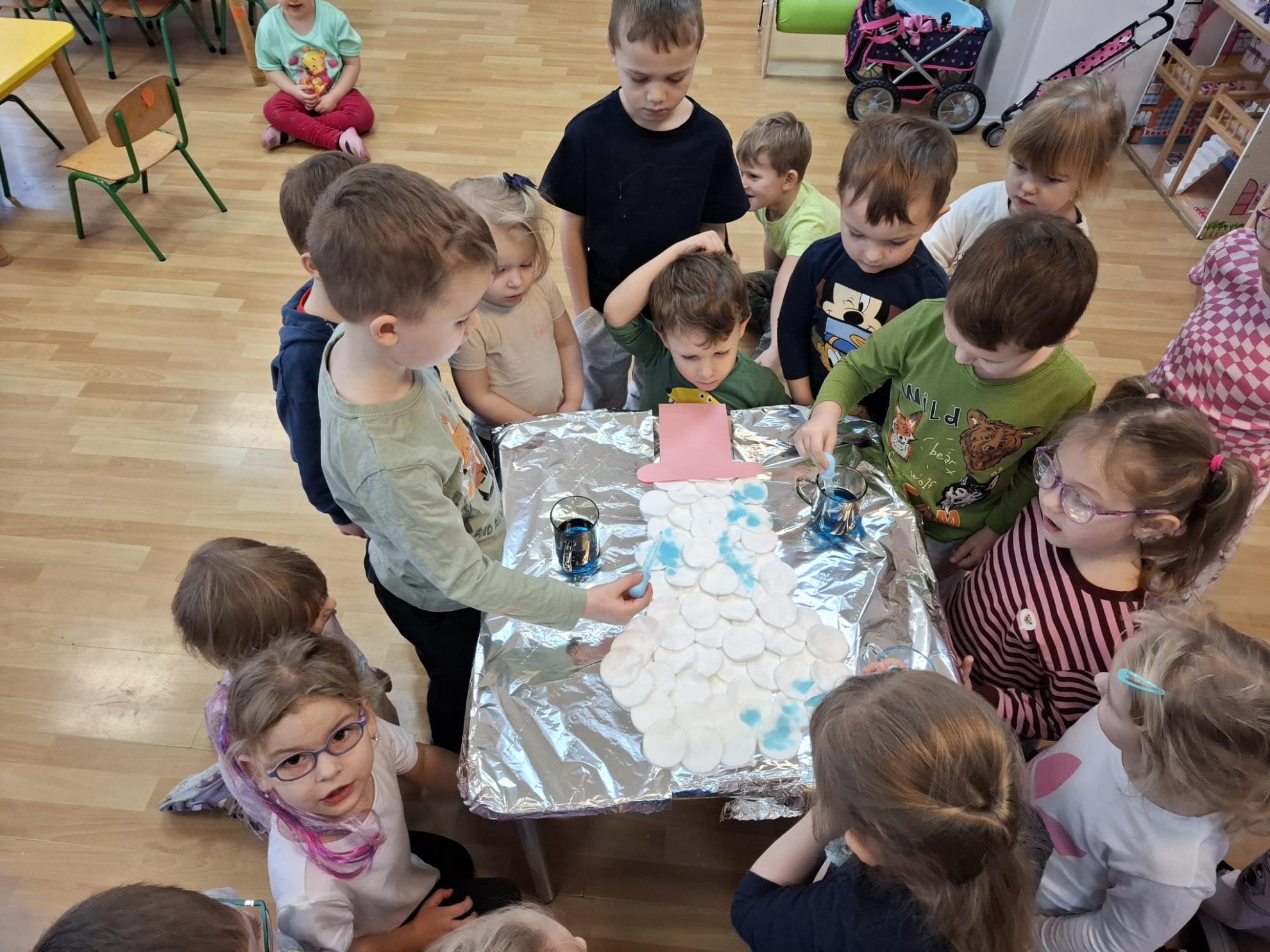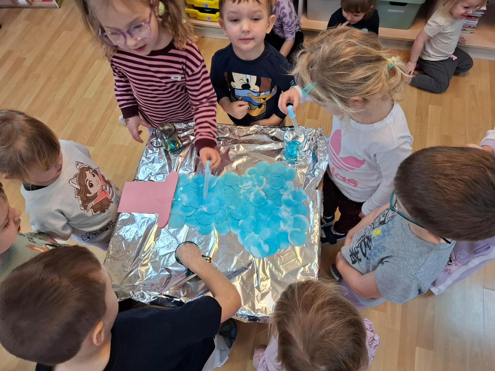 Farbowanie bałwanka – dzieci kolorowały bałwanka wykonanego z płatków kosmetycznych, używając magicznej niebieskiej wody.