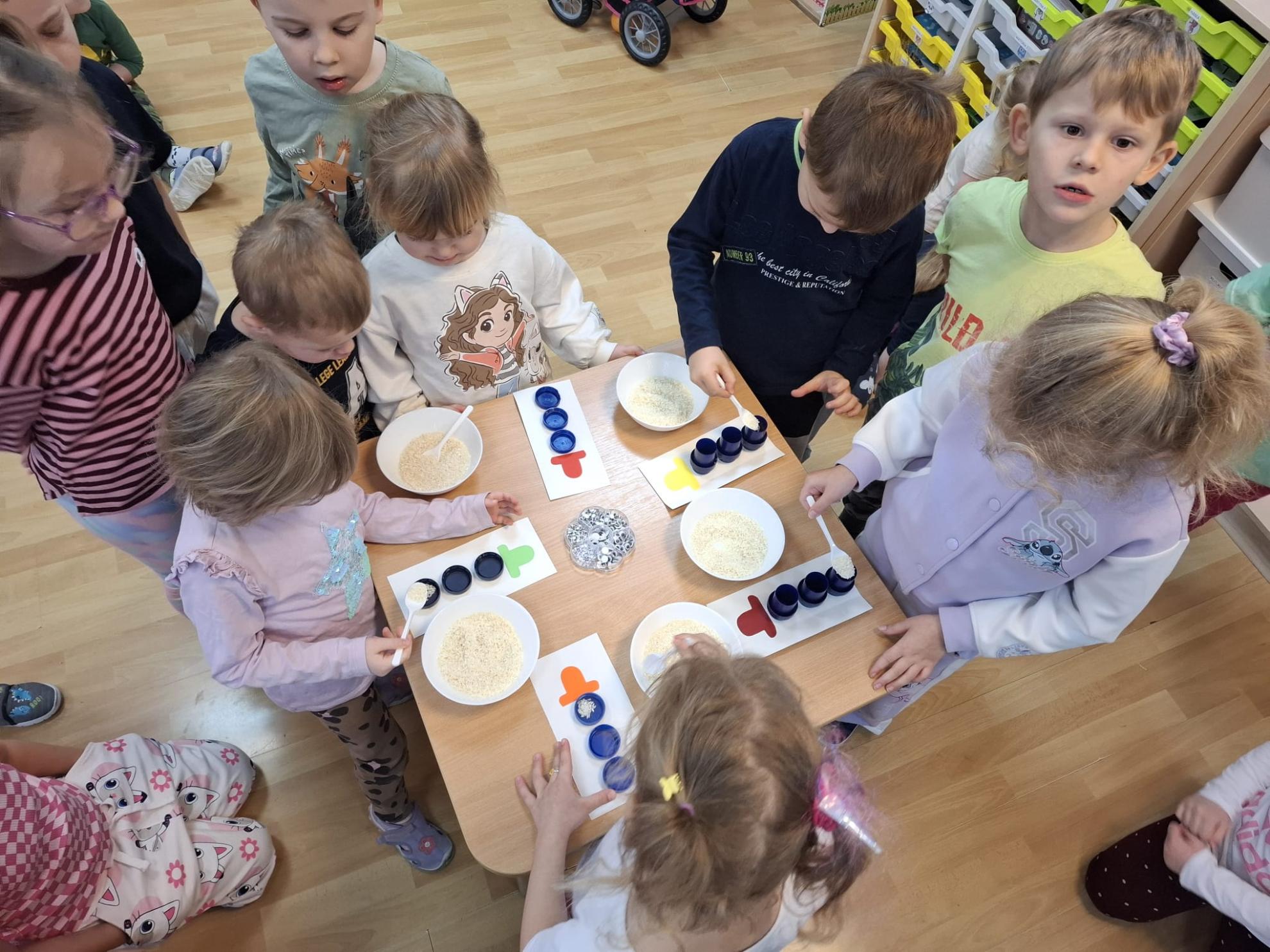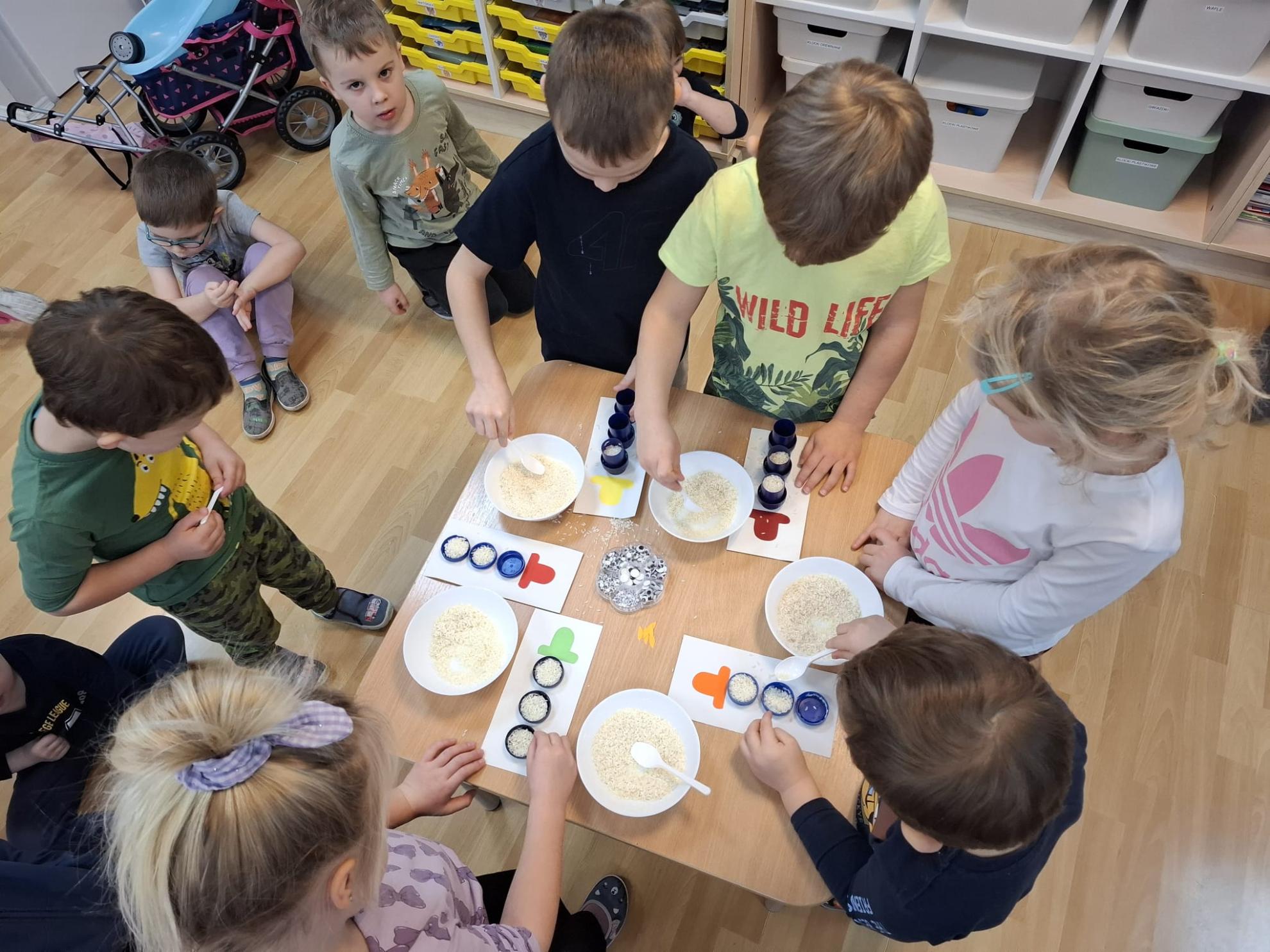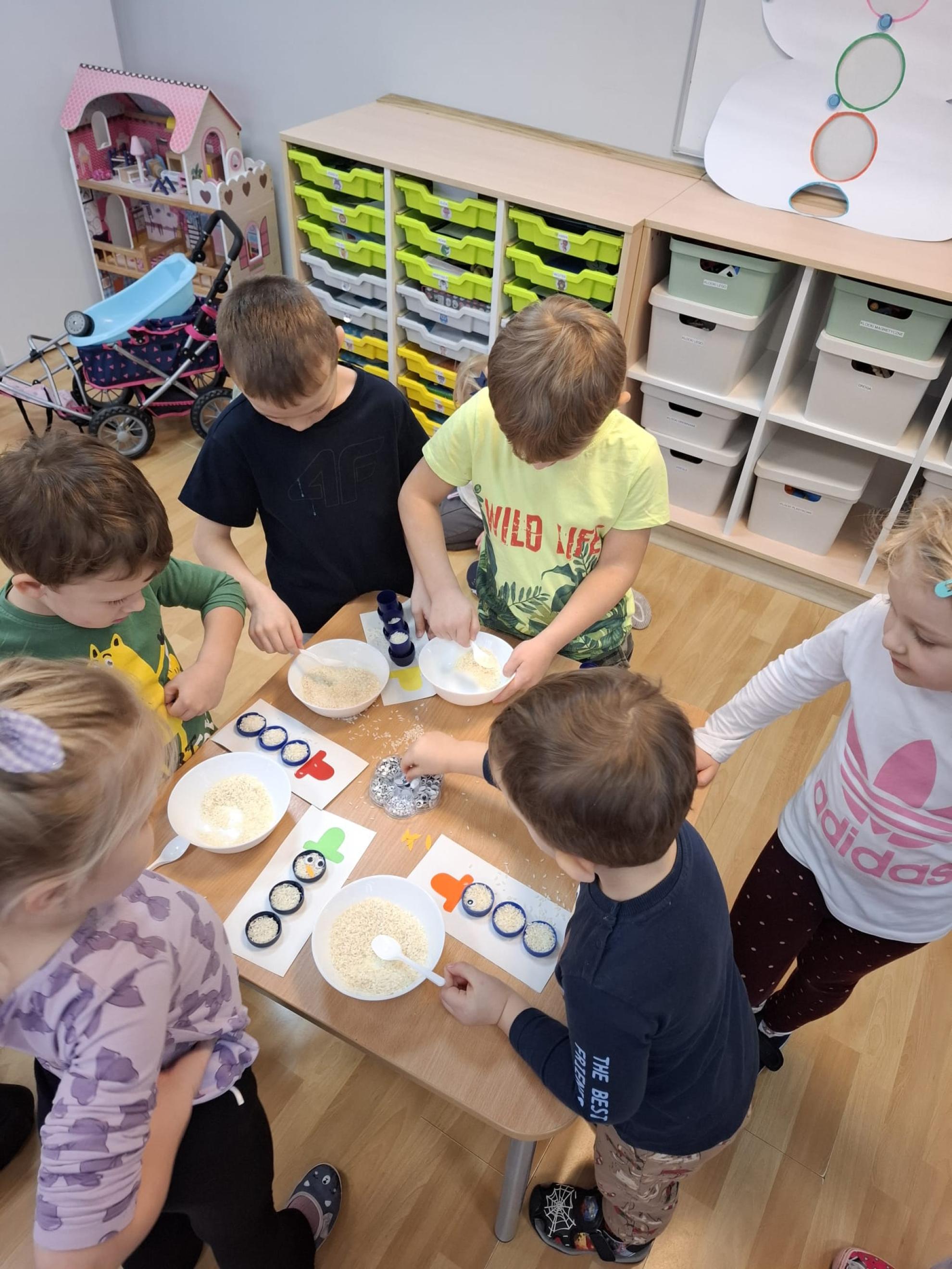 Sypanie ryżu do bałwanków z nakrętek – ćwiczyliśmy małą motorykę i cierpliwość.