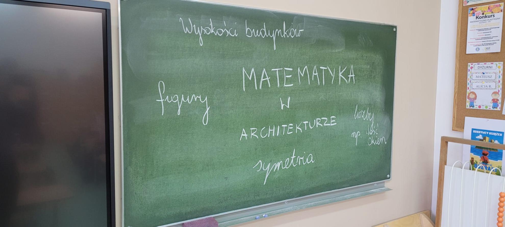 Uczniowie pracowali w grupach, rozważając, jak matematyka wykorzystywana jest w architekturze. Wspólnie z nauczycielem stworzyli mapę myśli na tablicy z hasłem przewodnim „Matematyka w architekturze”.