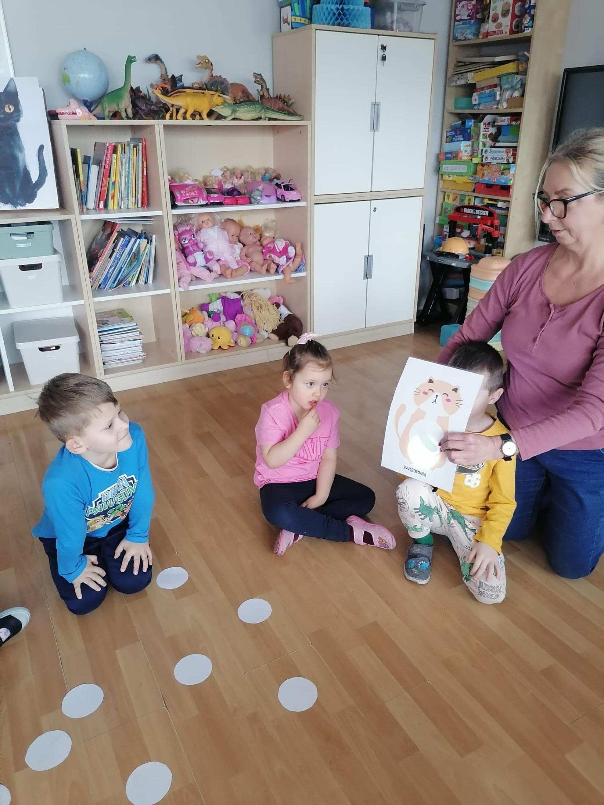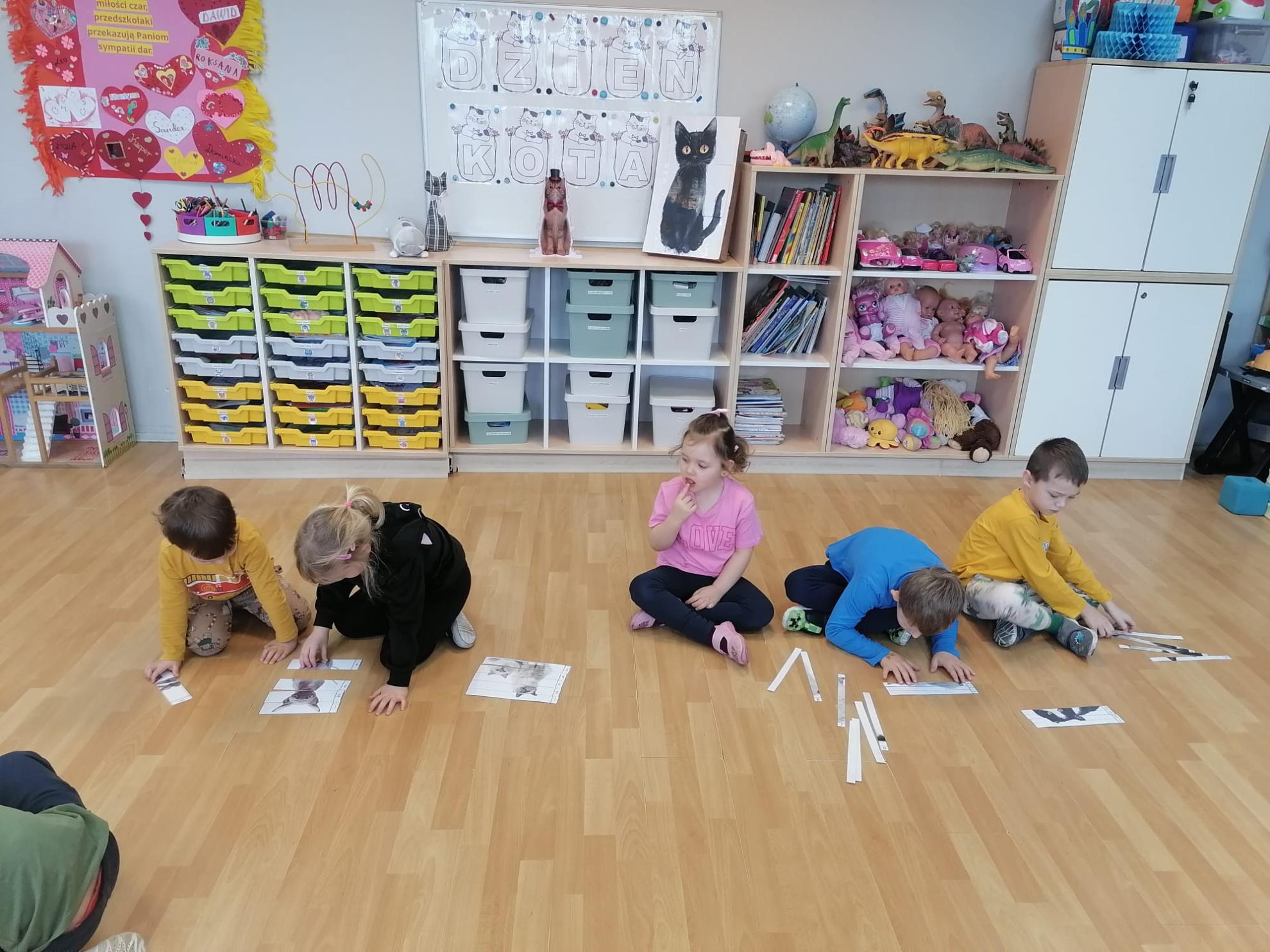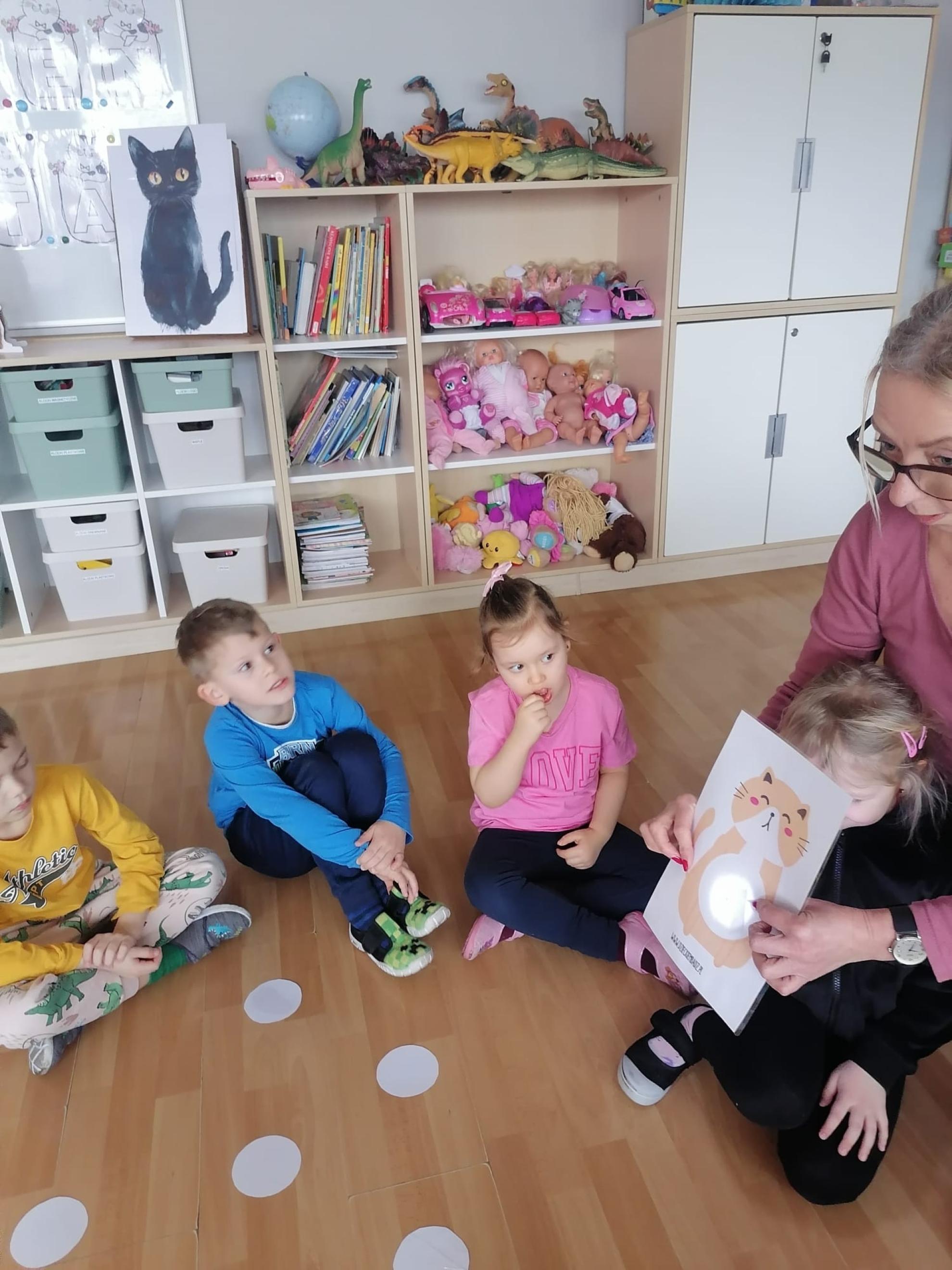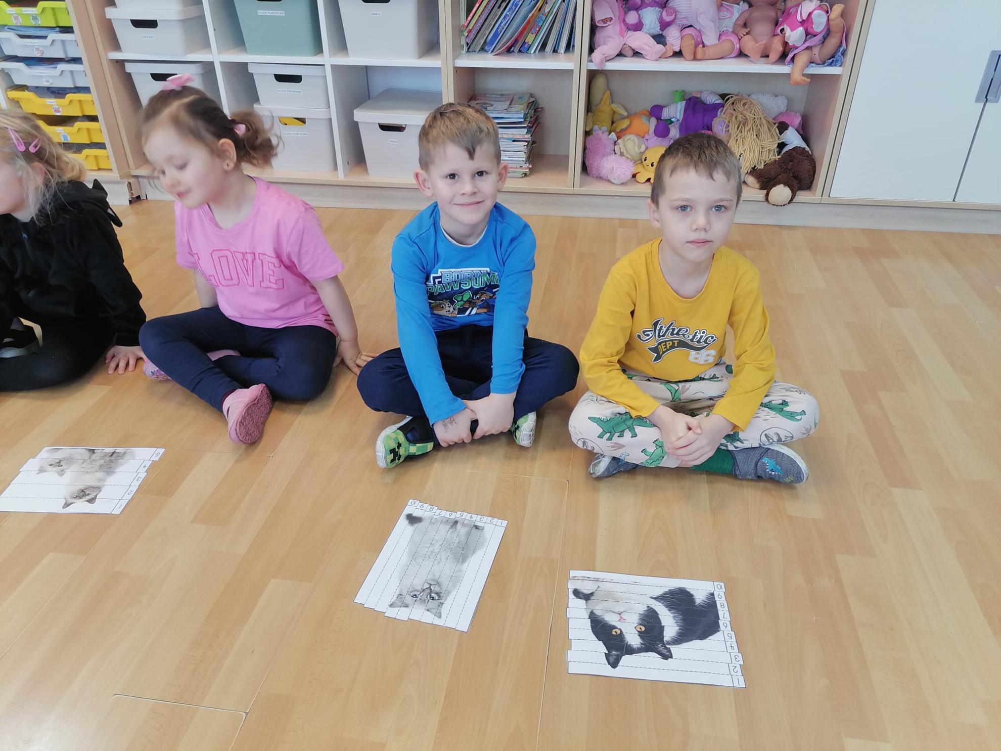 Przedszkolaki brały udział w kocich zabawach i konkursach - odgadywały nazwy bajkowych kotów, łapały myszki na włóczce, piły mleczko, układały puzzle, odgadywały co zjadł kotek, układały sylwetkę kota według wyrzuconego na kostce koloru. Na koniec zajęć wykonały pracę plastyczną, oczywiście wizerunek kota.