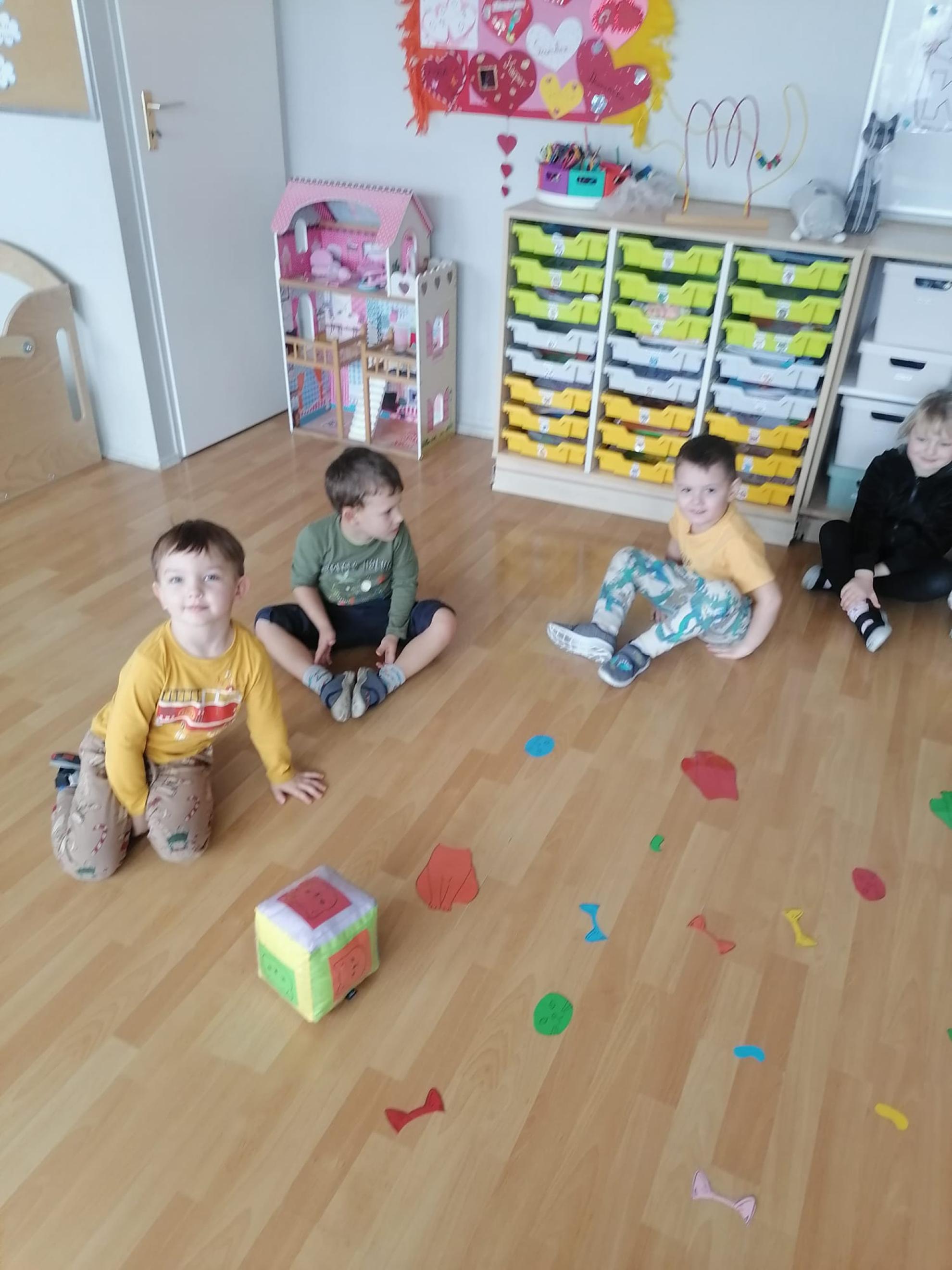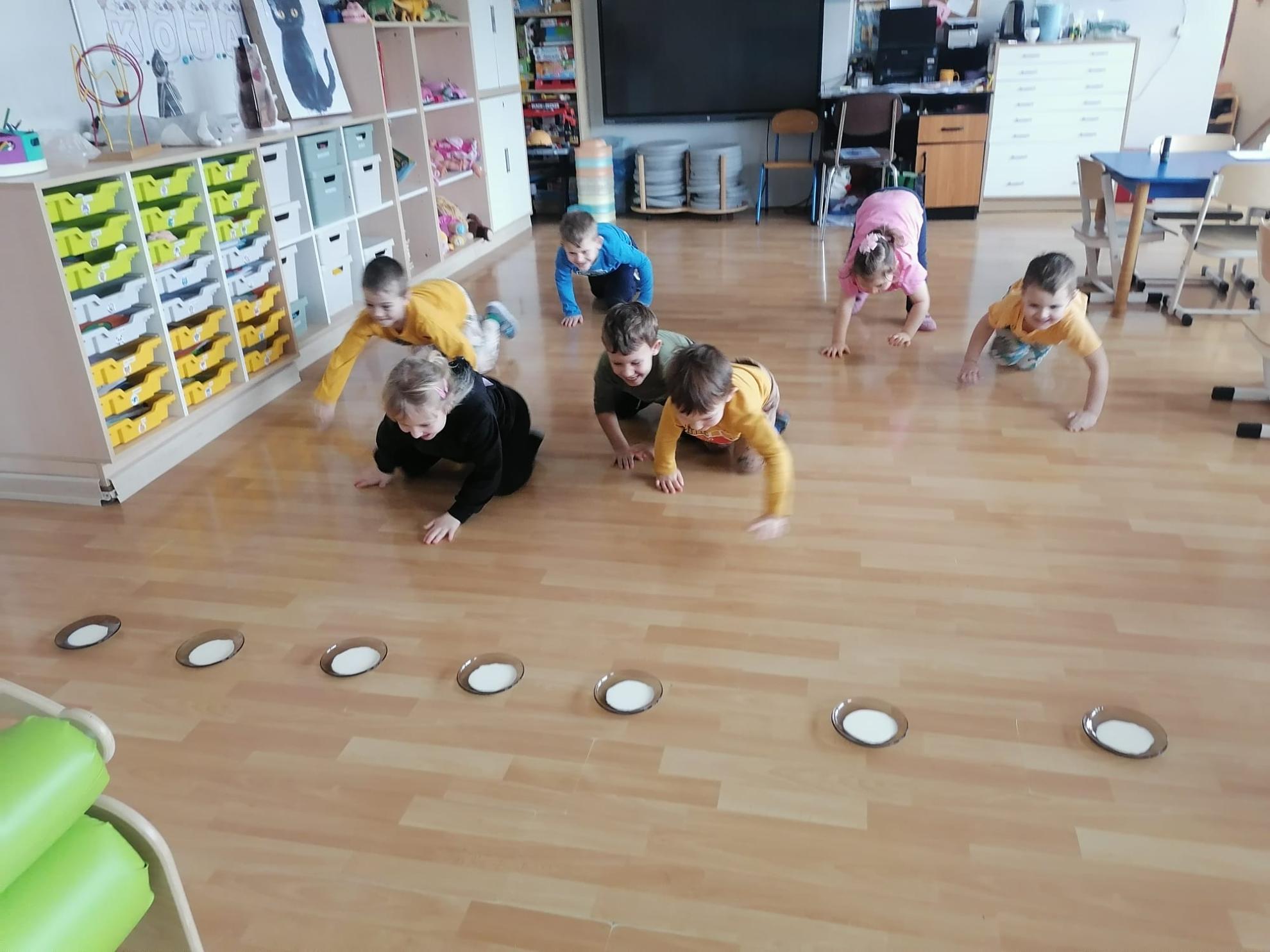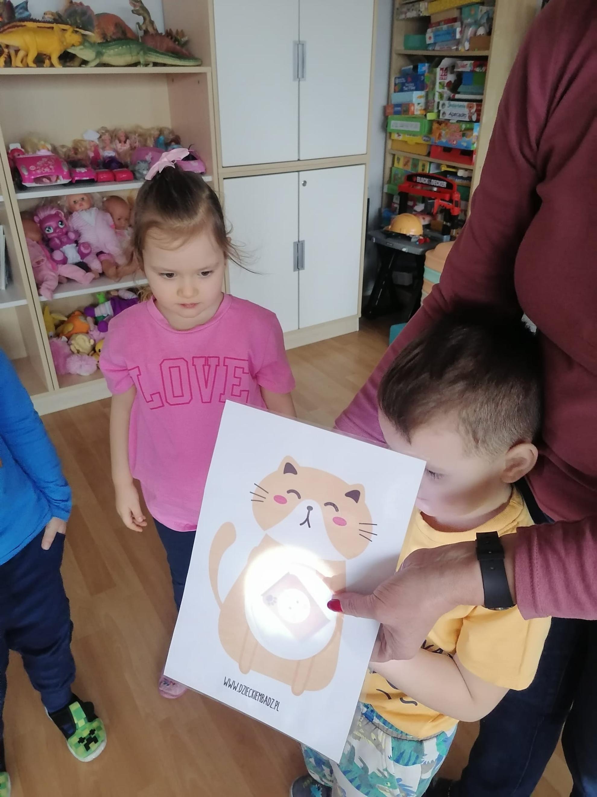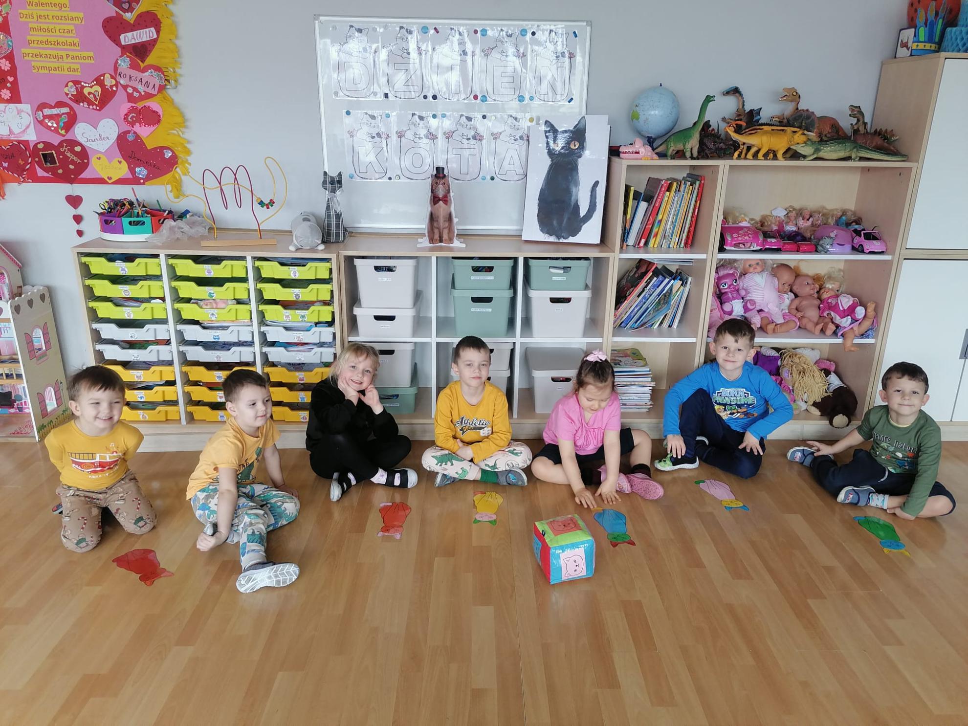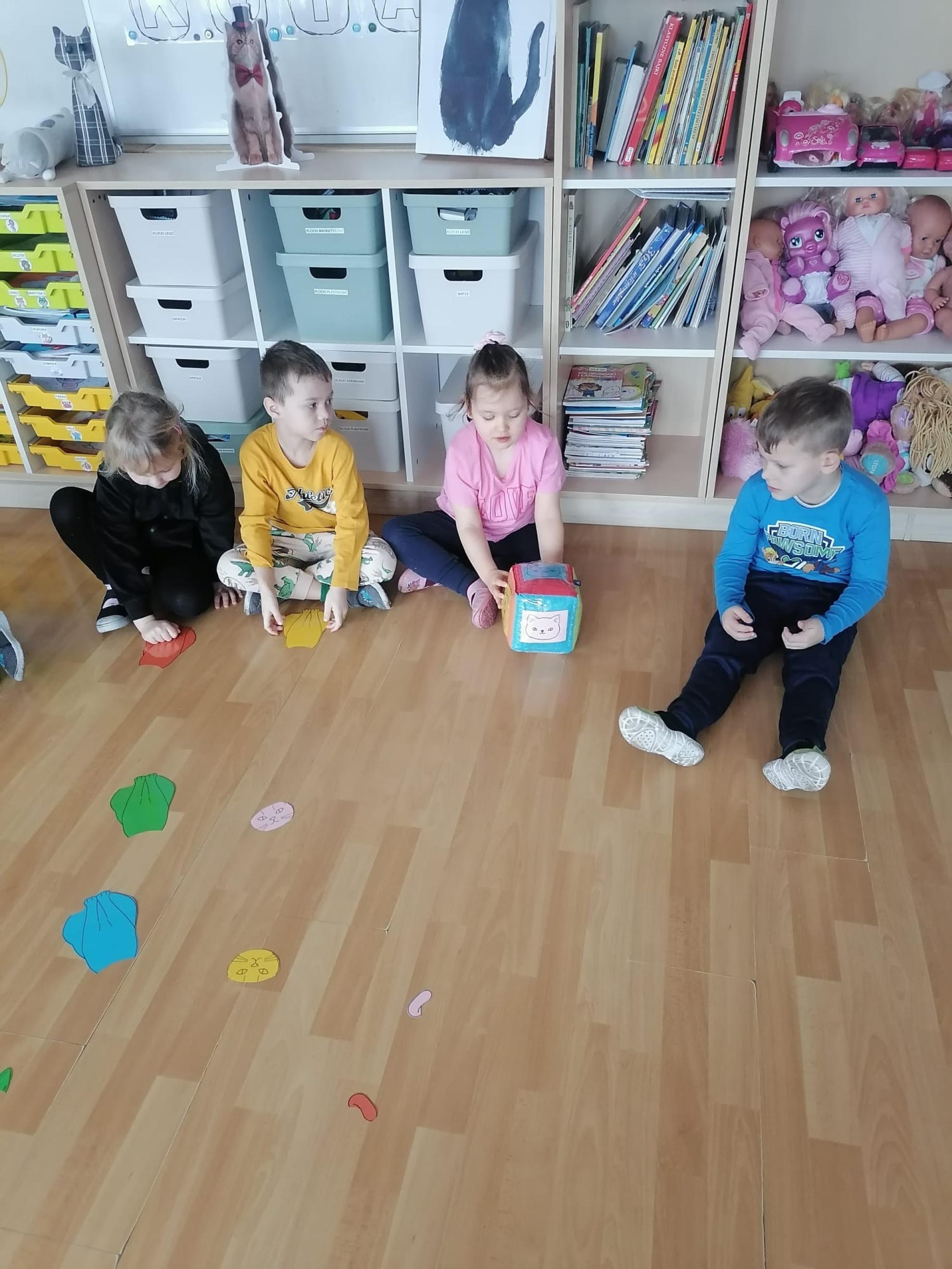 Przedszkolaki brały udział w kocich zabawach i konkursach - odgadywały nazwy bajkowych kotów, łapały myszki na włóczce, piły mleczko, układały puzzle, odgadywały co zjadł kotek, układały sylwetkę kota według wyrzuconego na kostce koloru. Na koniec zajęć wykonały pracę plastyczną, oczywiście wizerunek kota.