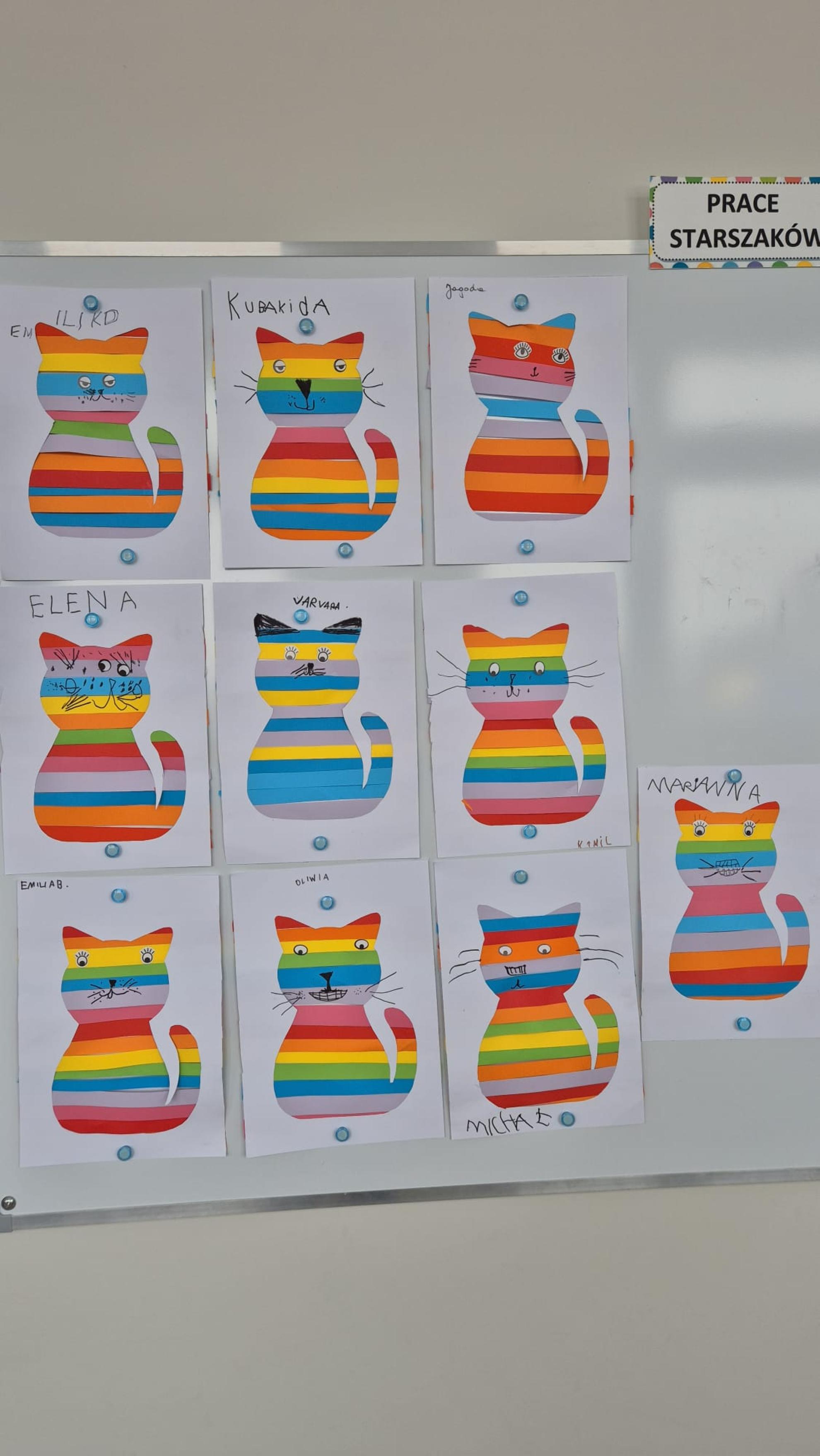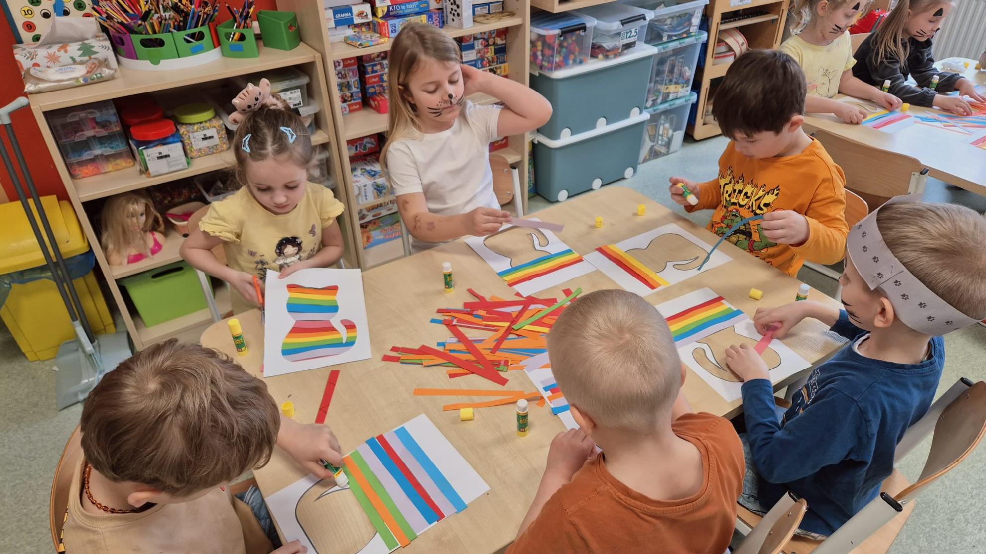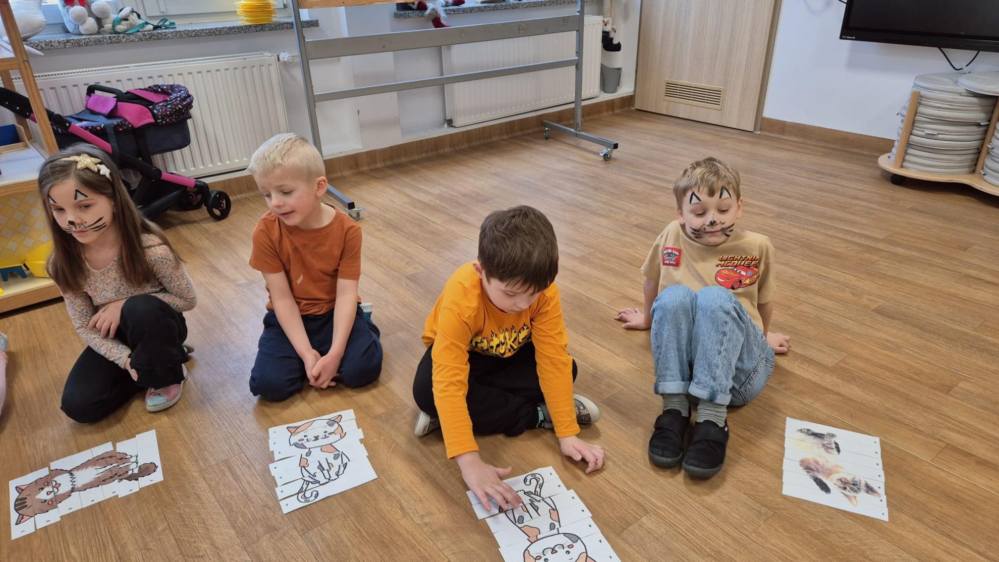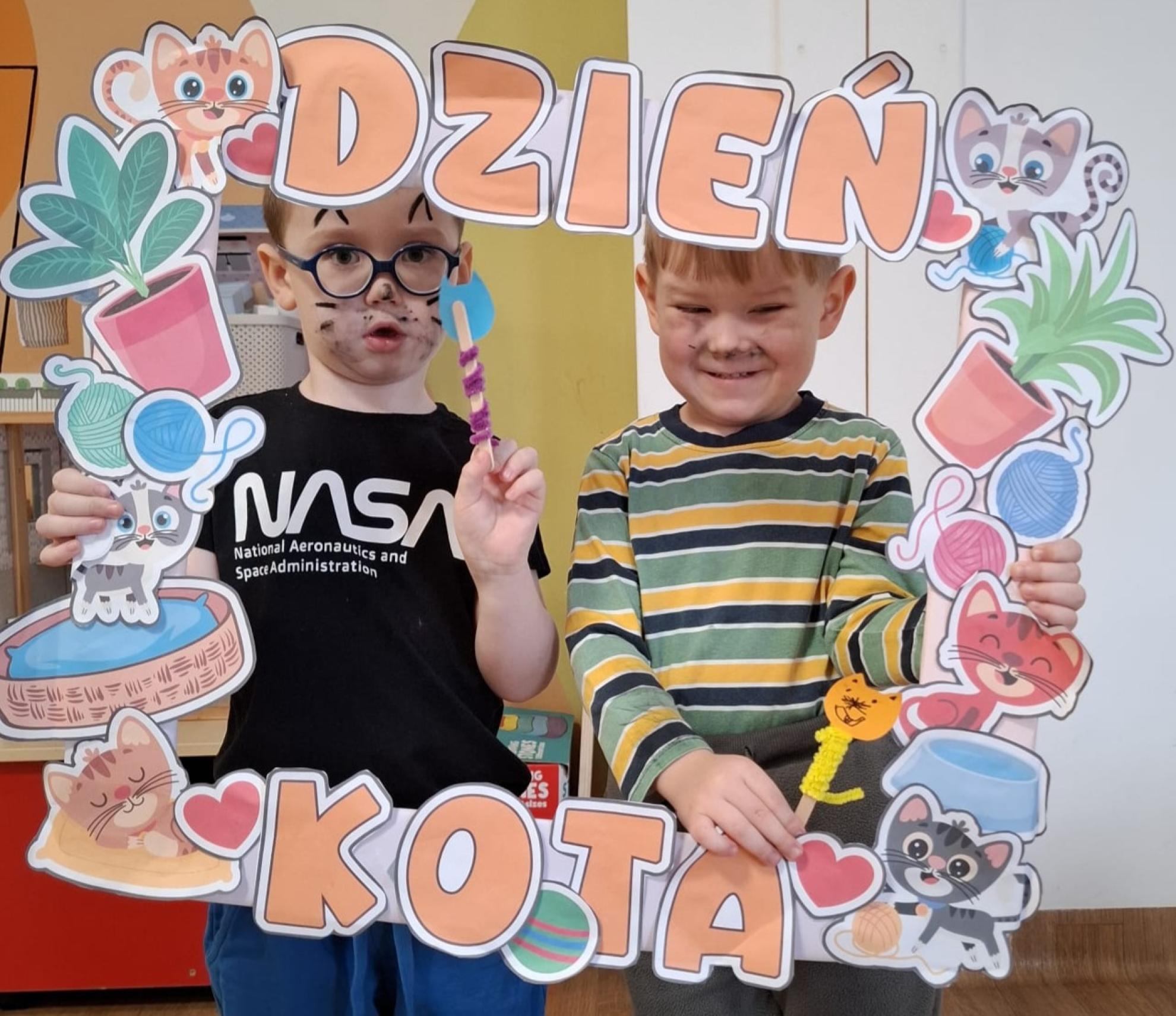 Ten dzień był pełen radości, uśmiechu i kocich atrakcji. Dzieci miały okazję poznać ciekawostki o kotach, dowiedzieć się, jak należy o nie dbać oraz dlaczego zwierzęta zasługują na naszą troskę i miłość. Nie zabrakło również wesołych zabaw ruchowych, kocich konkursów oraz kreatywnych prac plastycznych, podczas których powstały przepiękne kotki.