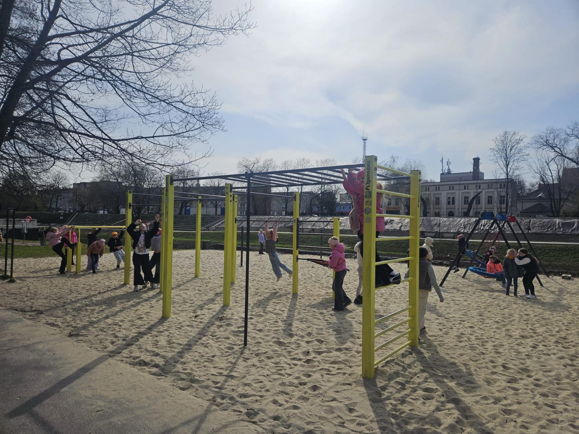 Na zakończenie wycieczki udaliśmy się do parku zamkowego, gdzie na dzieci czekała chwila aktywnego odpoczynku na świeżym powietrzu. Były wspinaczki, podciąganie się na rurkach, zabawa na huśtawkach i na ściance wspinaczkowej, a także gra na parkowych instrumentach. Radosna zabawa dostarczyła uczniom mnóstwo energii, uśmiechu oraz okazji do wspólnej integracji.