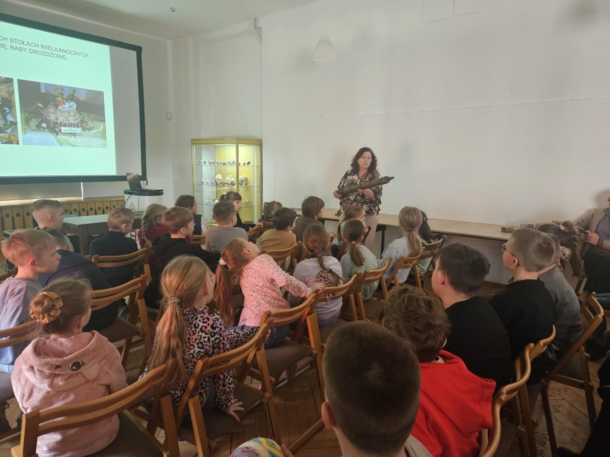 Po teatralnych przeżyciach uczniowie udali się do Muzeum w Raciborzu, gdzie uczestniczyli w zajęciach z cyklu „Święta doroczne na Śląsku”. Celem lekcji było przybliżenie dzieciom miejscowych tradycji oraz zwyczajów związanych z obchodami Świąt Wielkanocnych. Zajęcia wzbogacone były interesującą prezentacją multimedialną. Podczas spotkania uczniowie mogli zobaczyć różnorodne przedmioty związane z dawnymi obrzędami i tradycjami, m.in. Marzannę i goik, pięknie zdobione jajka wielkanocne, zabytkowe klekotki wielkopostne oraz sikawki wielkanocne. Była to niezwykle ciekawa i wartościowa lekcja regionalnej kultury.