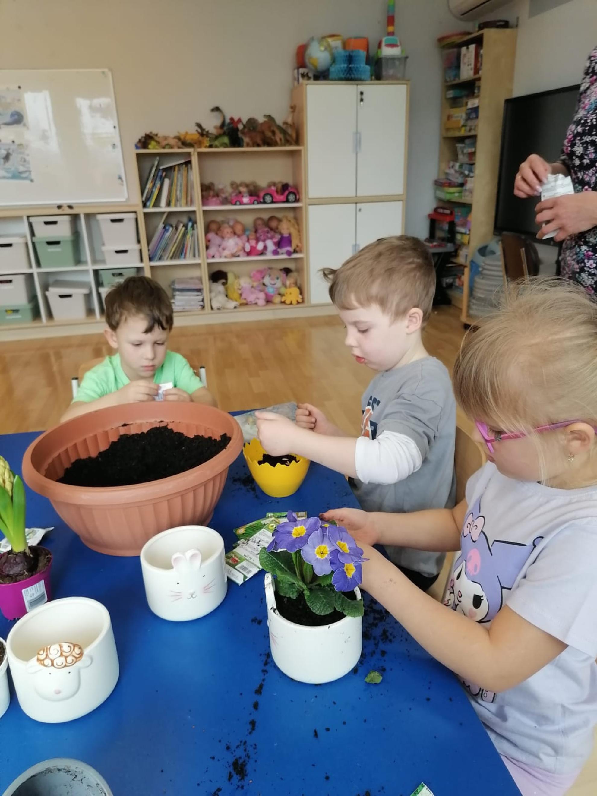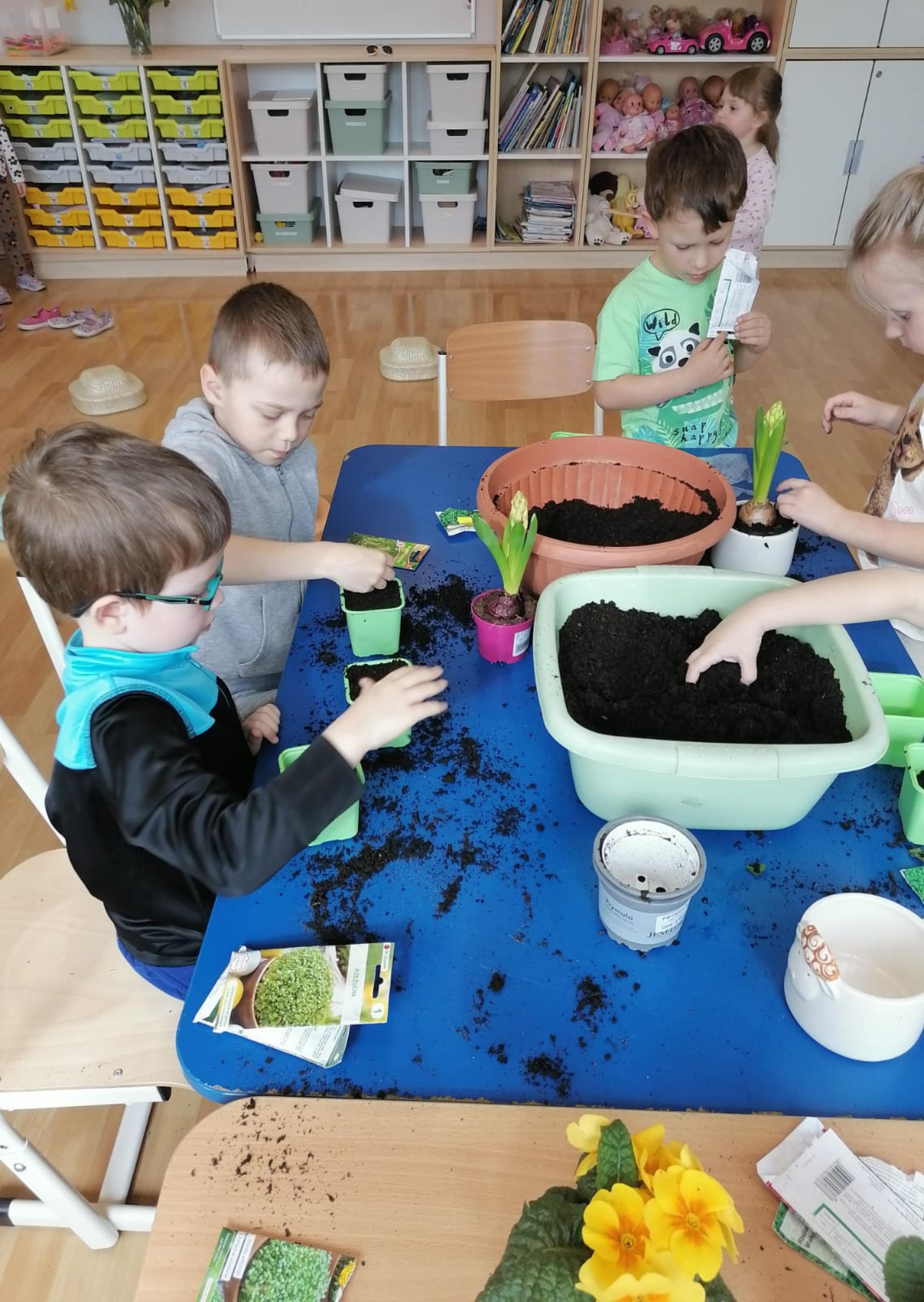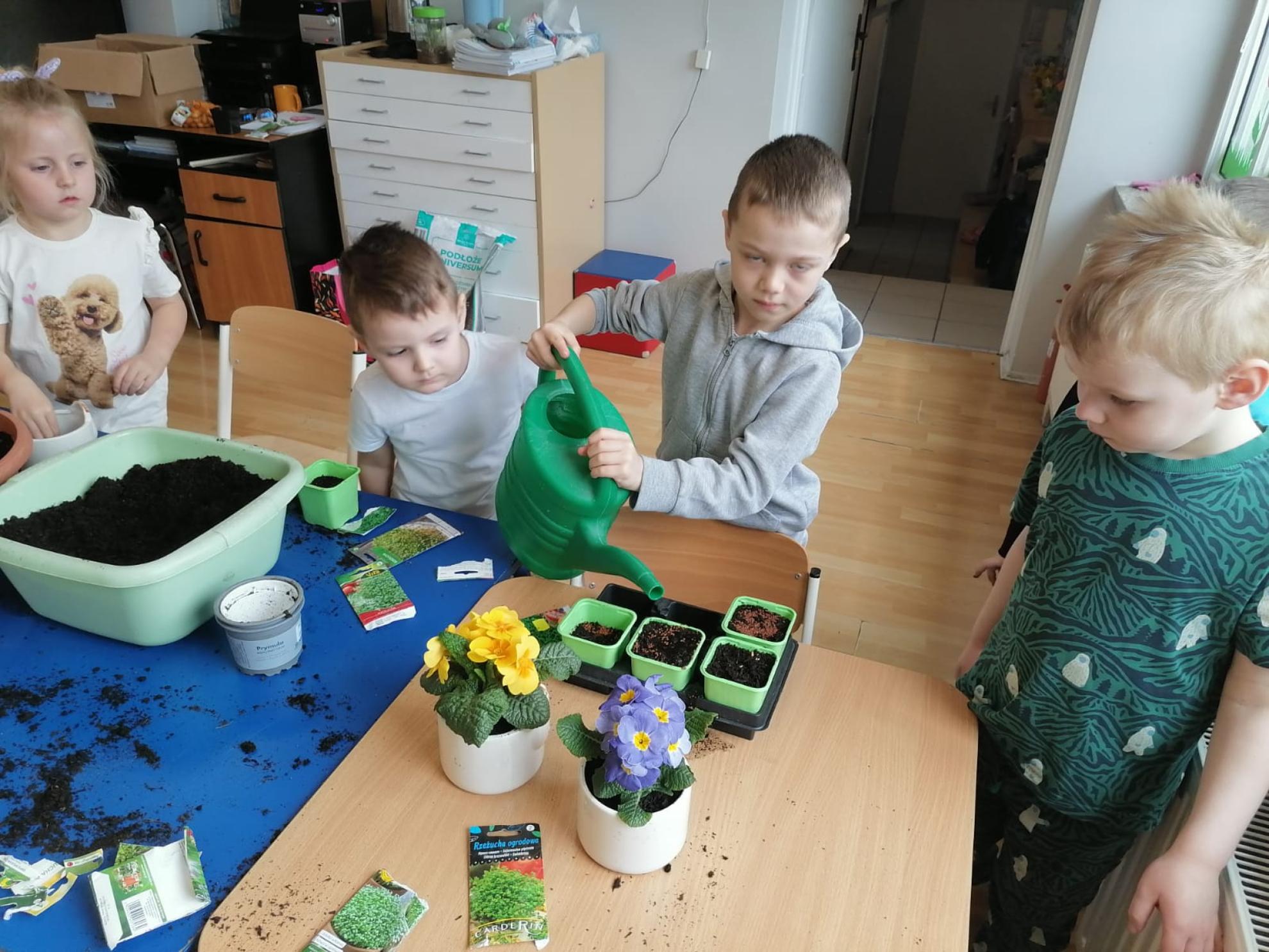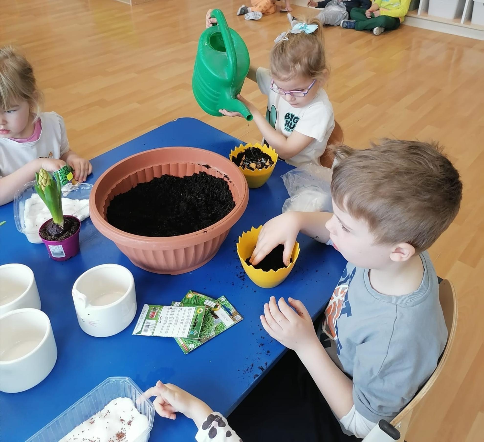 Przedszkolaki z wielkim zapałem siały rzeżuchę i owies, sadziły cebulkę oraz wiosenne kwiaty.