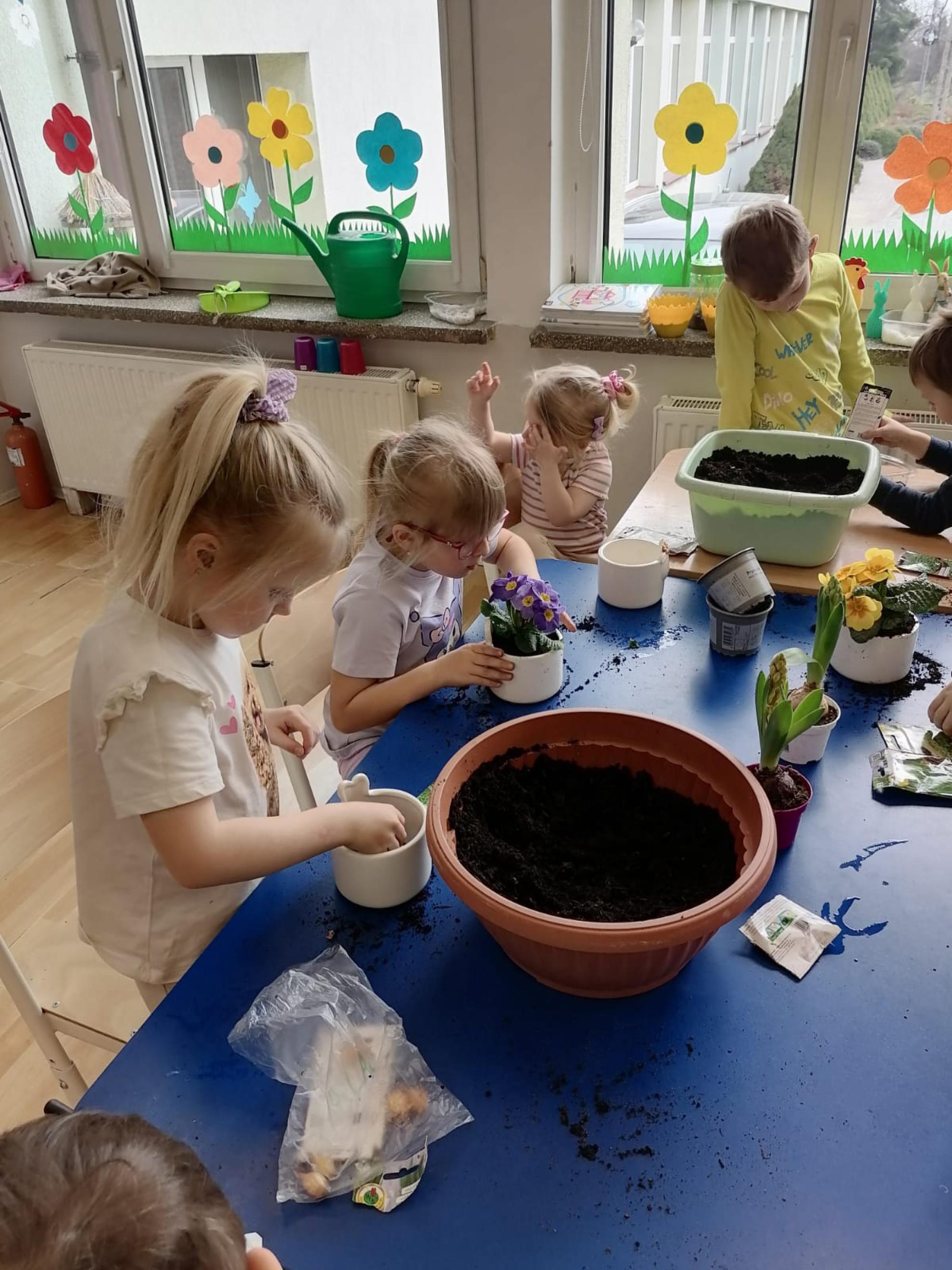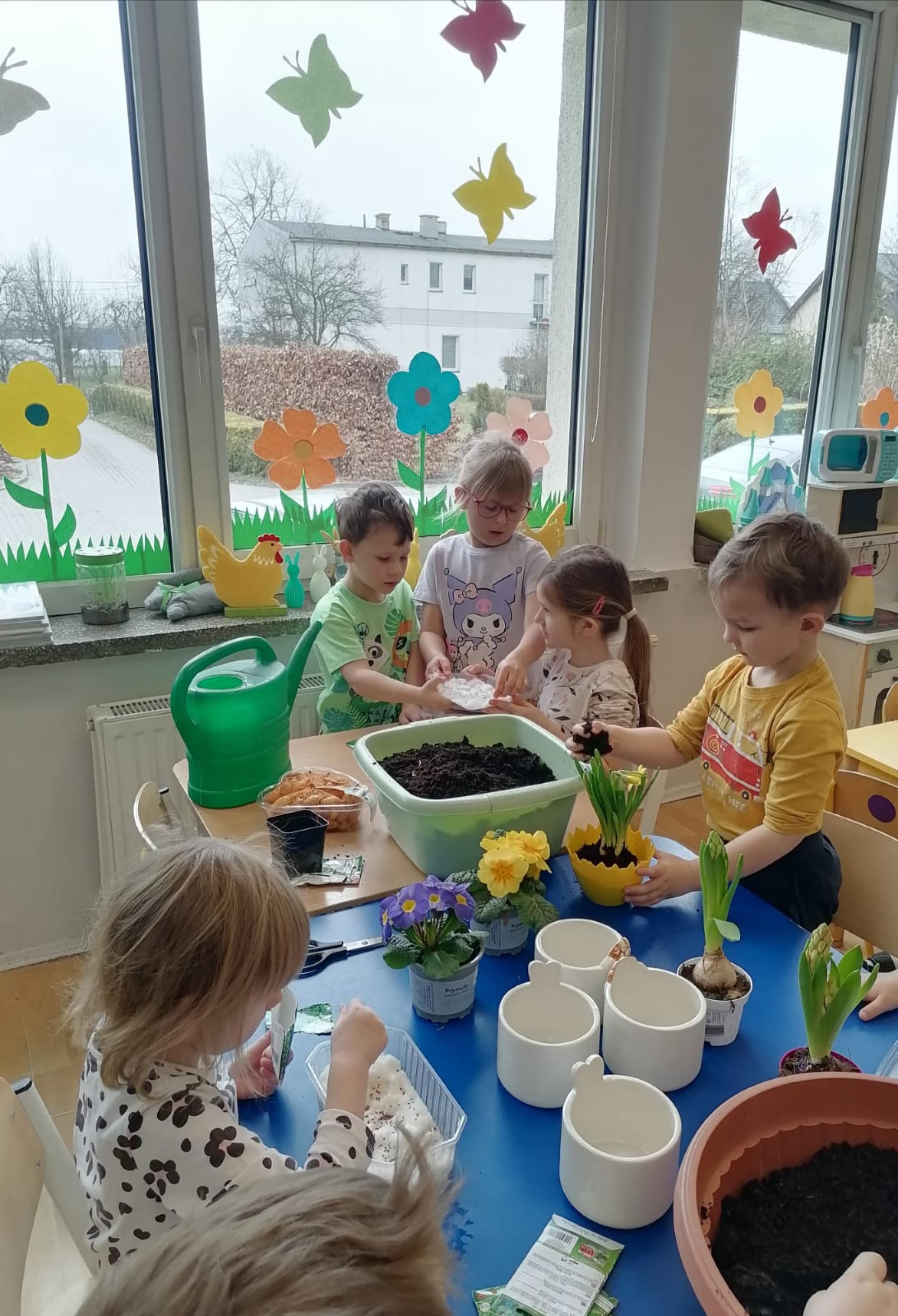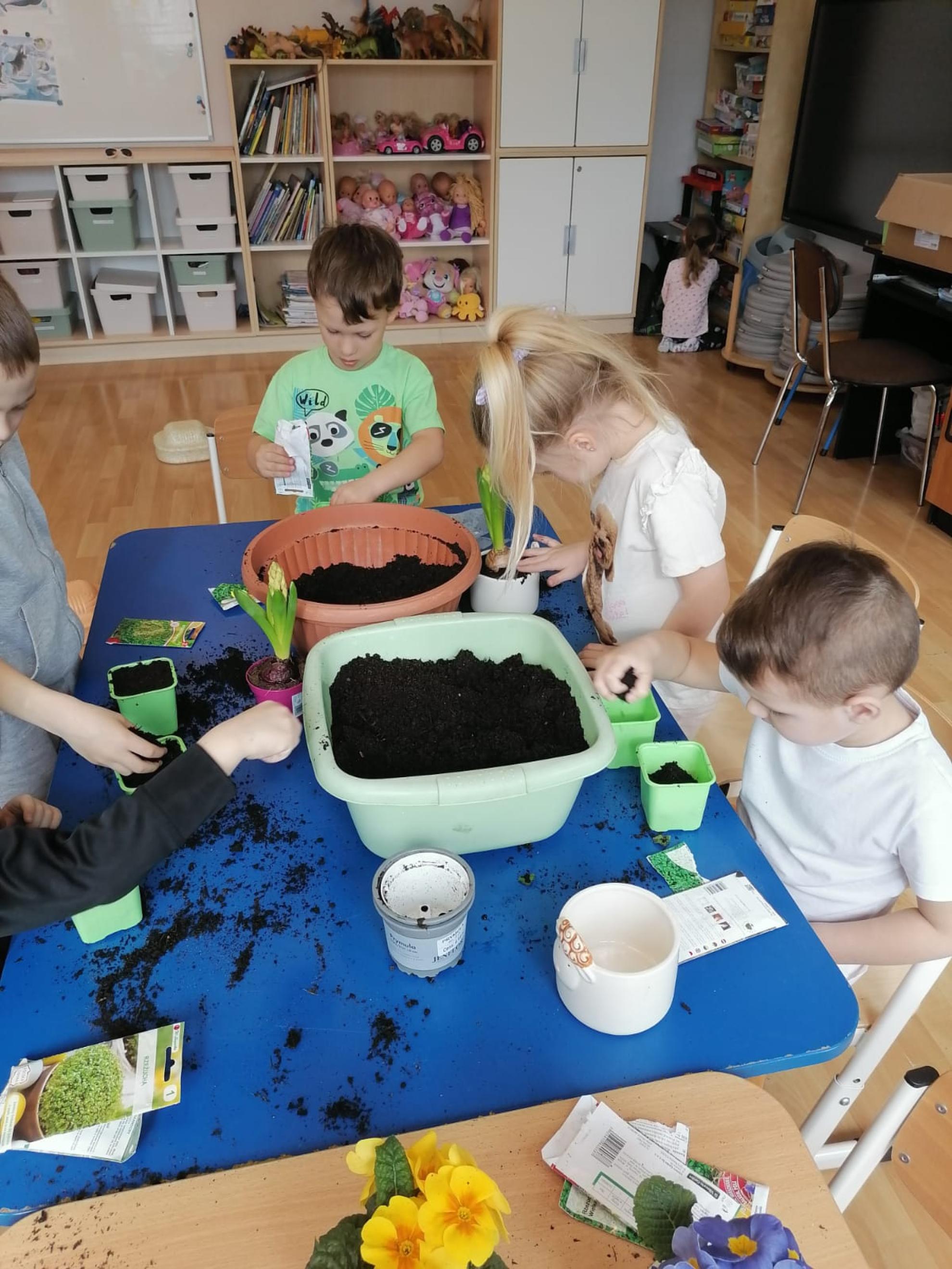Przedszkolaki z wielkim zapałem siały rzeżuchę i owies, sadziły cebulkę oraz wiosenne kwiaty.