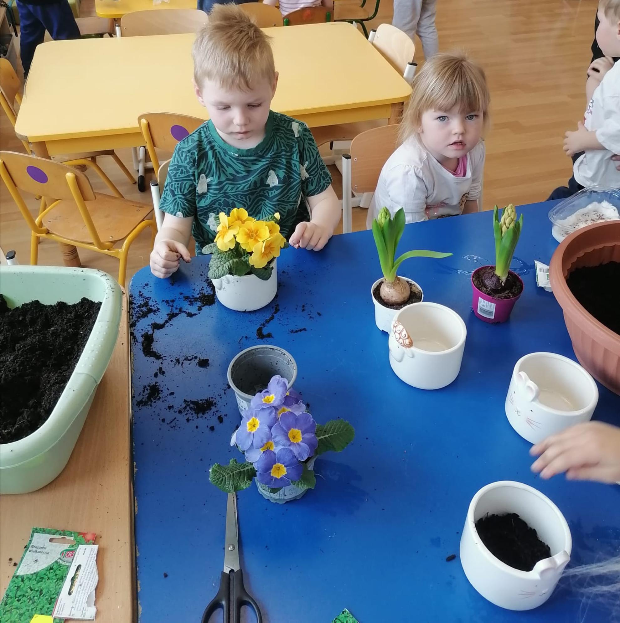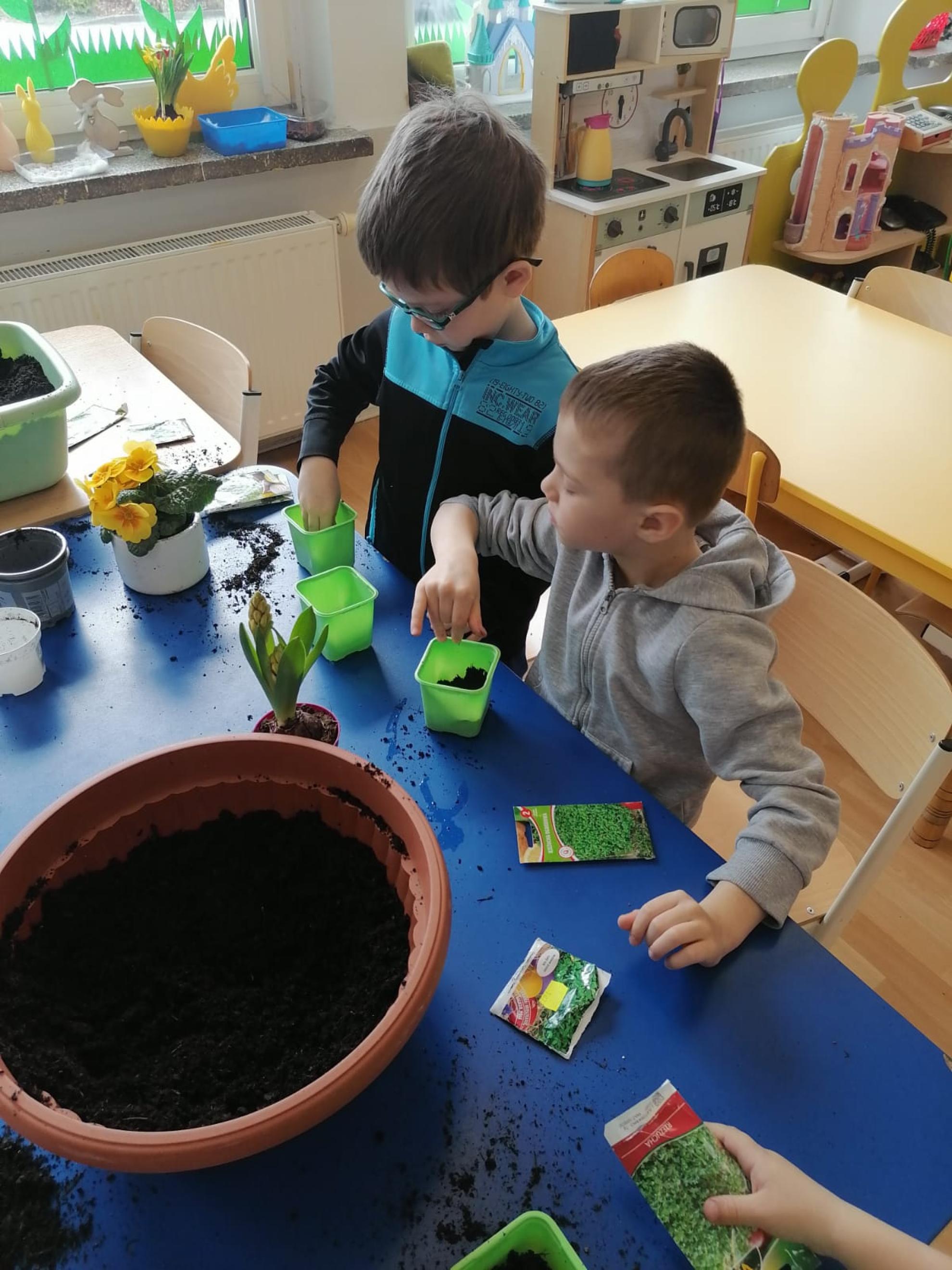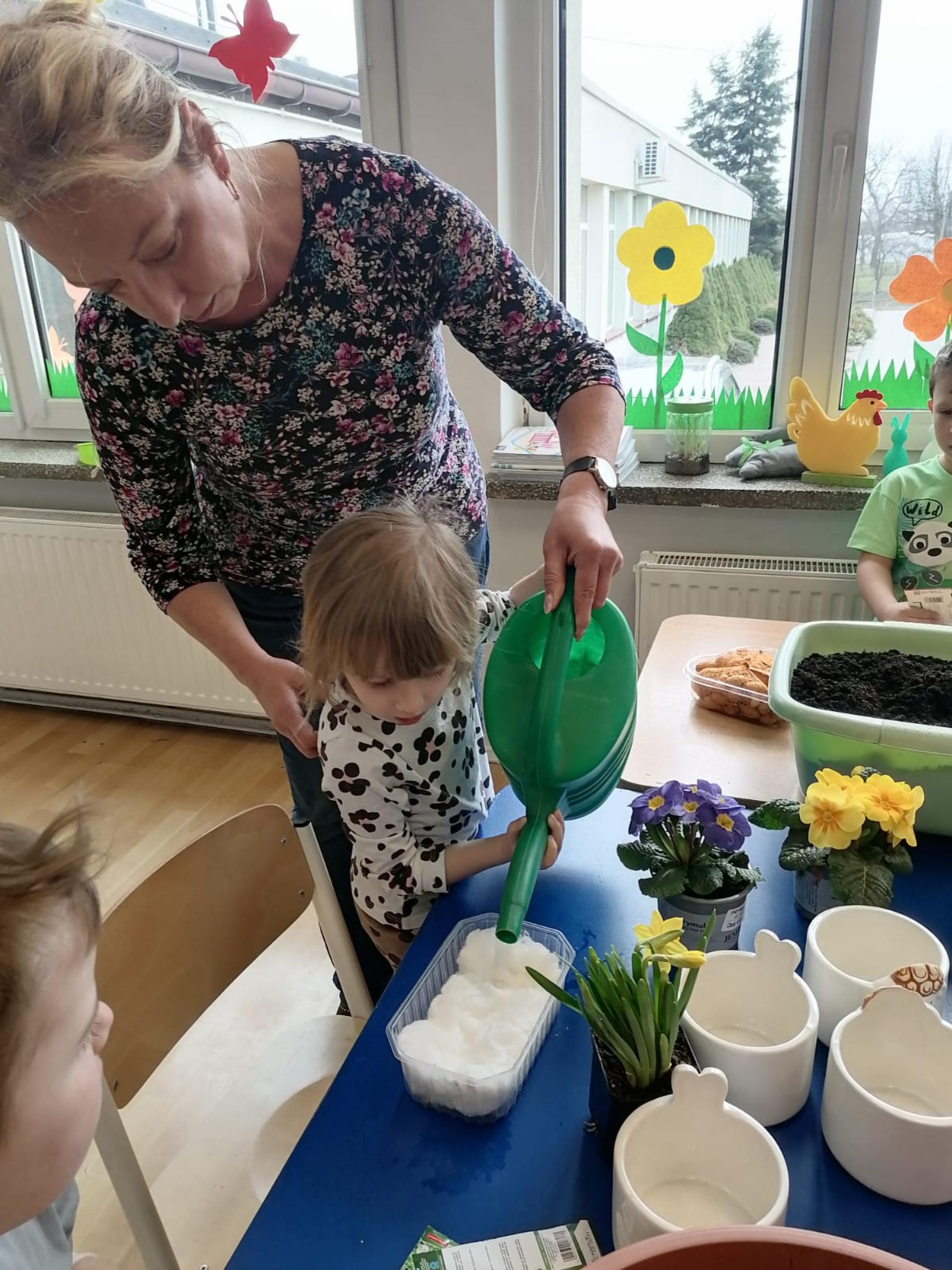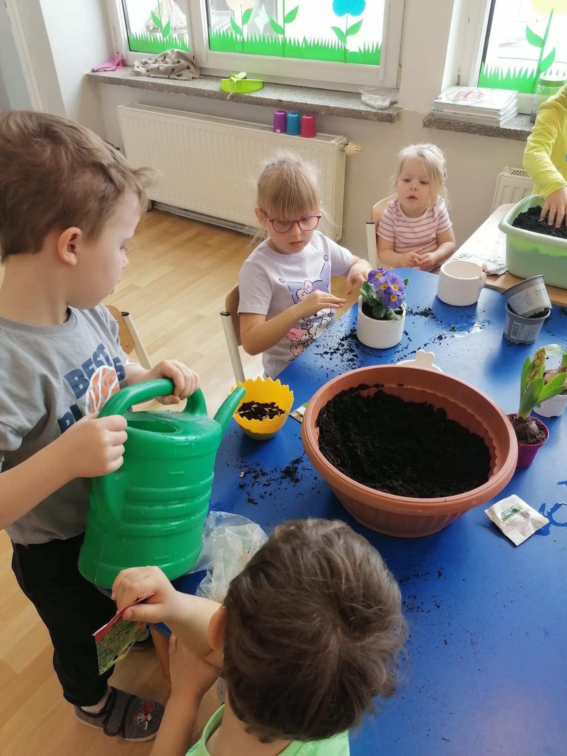 Przedszkolaki z wielkim zapałem siały rzeżuchę i owies, sadziły cebulkę oraz wiosenne kwiaty.