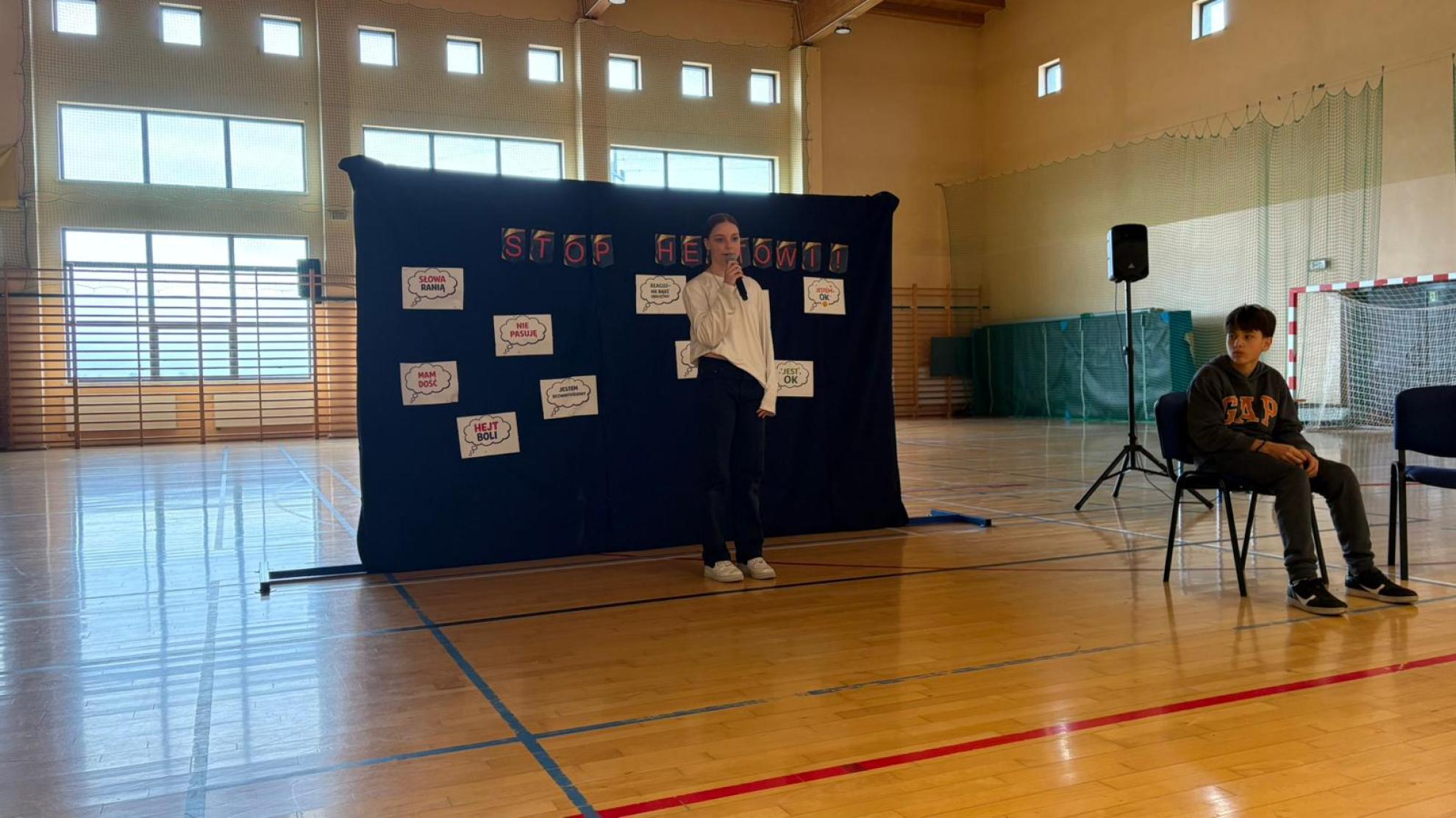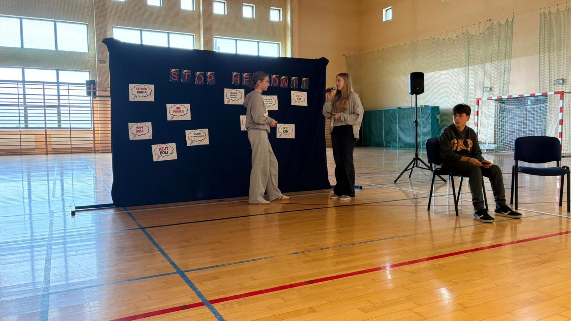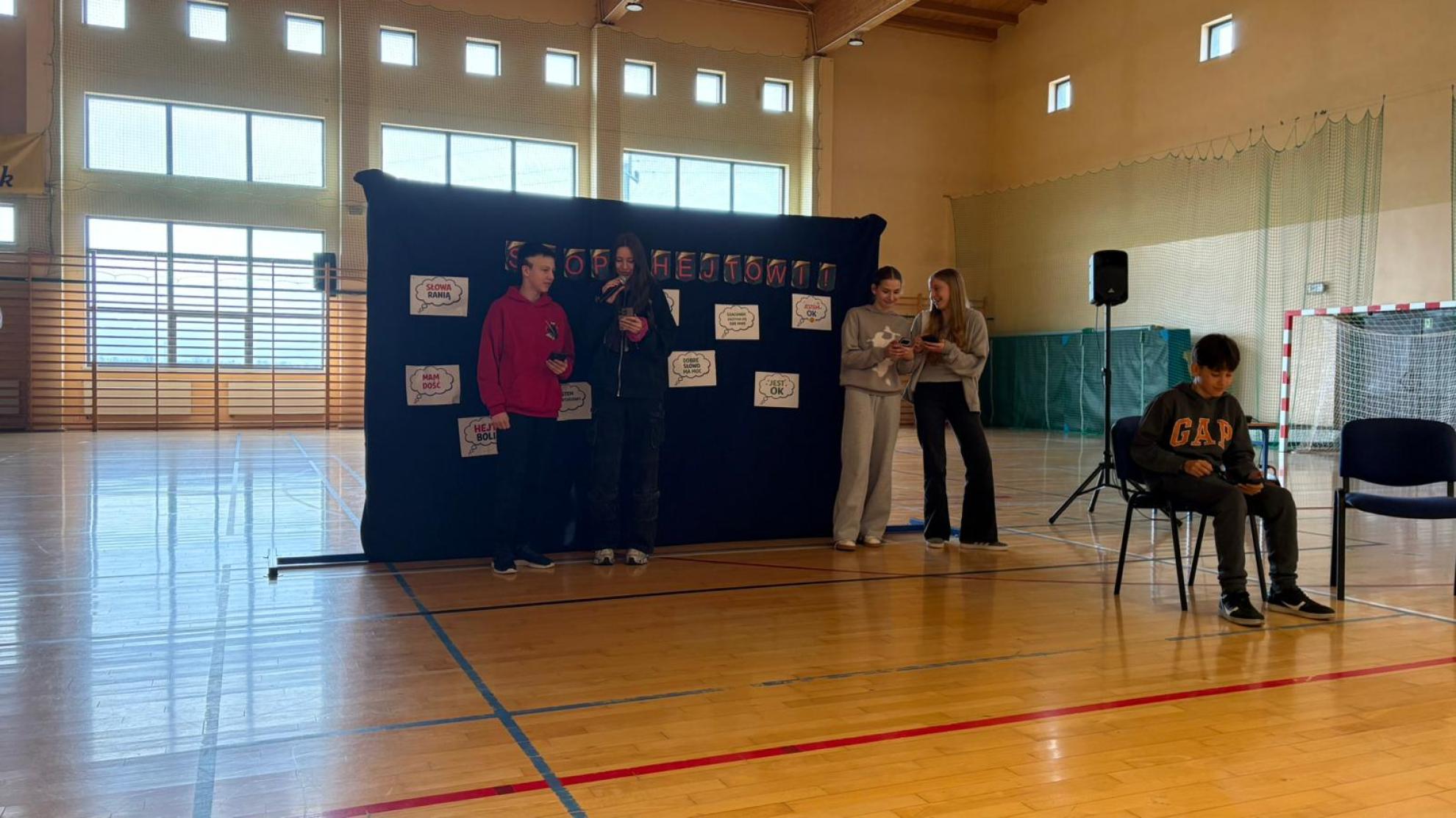 Uczniowie zaprezentowali scenki pokazujące sytuacje wyśmiewania, obraźliwych komentarzy oraz brak reakcji świadków. Przedstawienie ukazało emocje osoby doświadczającej hejtu oraz znaczenie wsparcia ze strony przyjaciół i dorosłych.