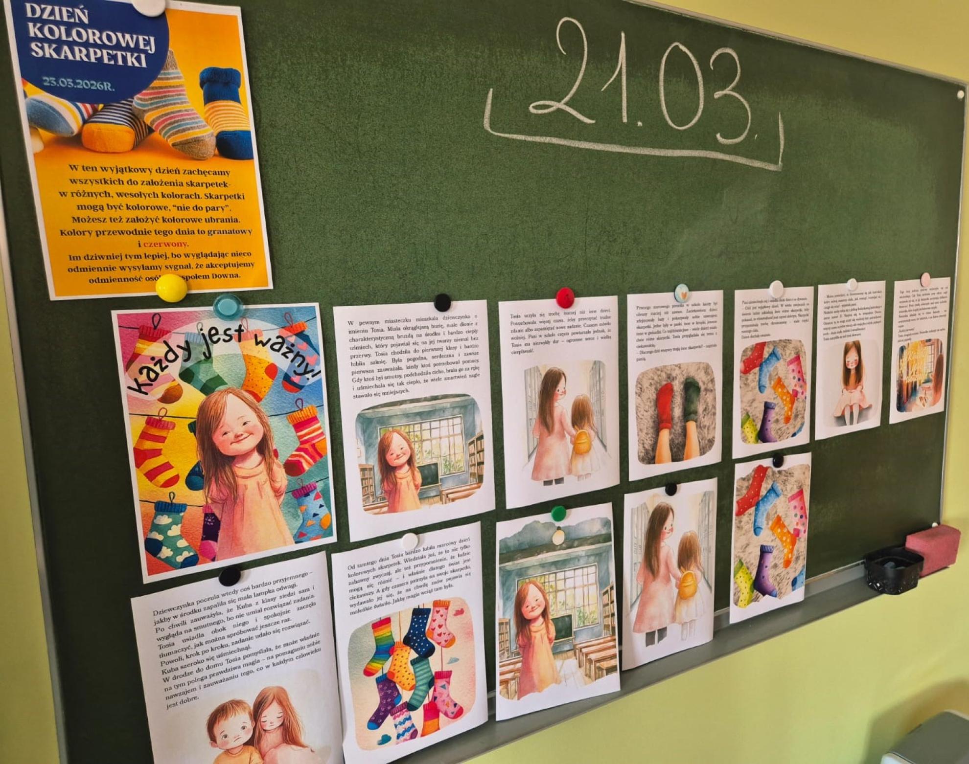 Z okazji obchodów Światowego Dnia Zespołu Downa, który obchodzimy 21 marca, w naszej szkole zorganizowano akcję pod nazwą „Dzień Kolorowej Skarpetki”. Celem wydarzenia było zwiększenie świadomości uczniów na temat Zespołu Downa oraz promowanie postawy akceptacji, szacunku i solidarności z osobami z trisomią 21.