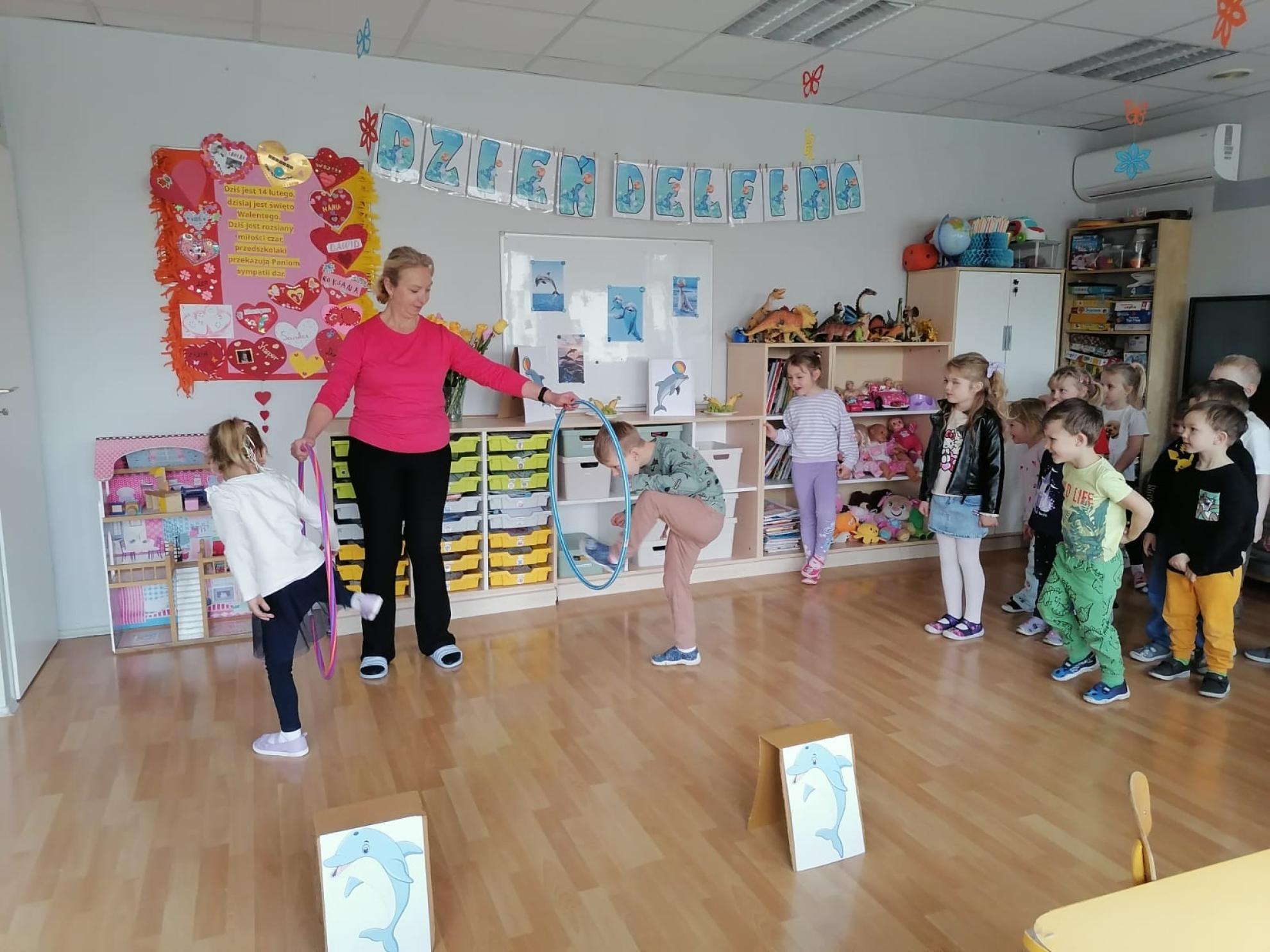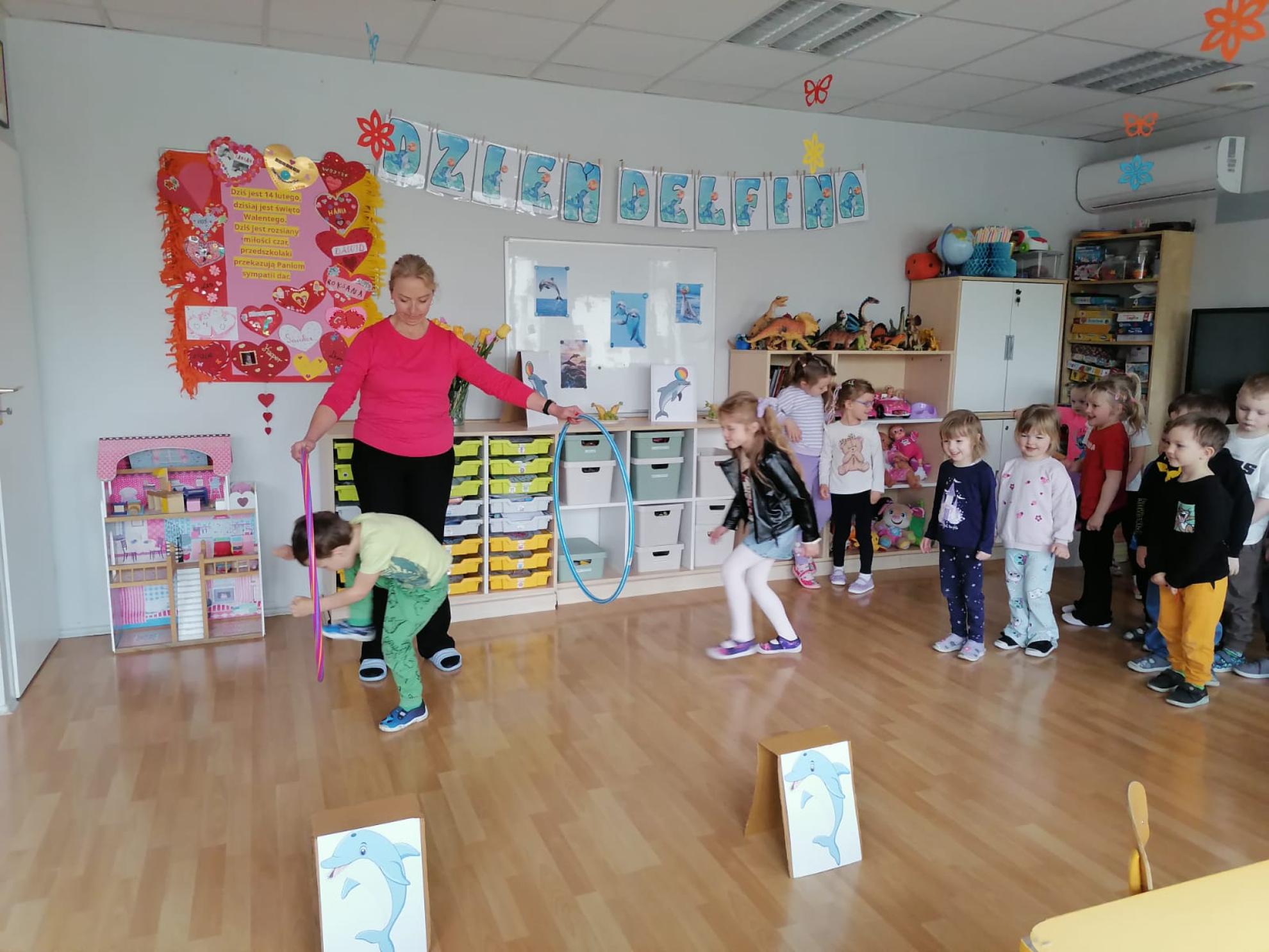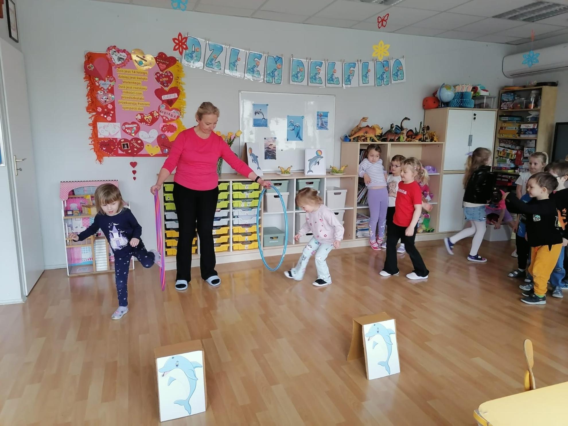 Przedszkolaki skakały przez obręcze jak delfiny, karmiły delfina oraz rzucały obręczą celujący w nos delfina.