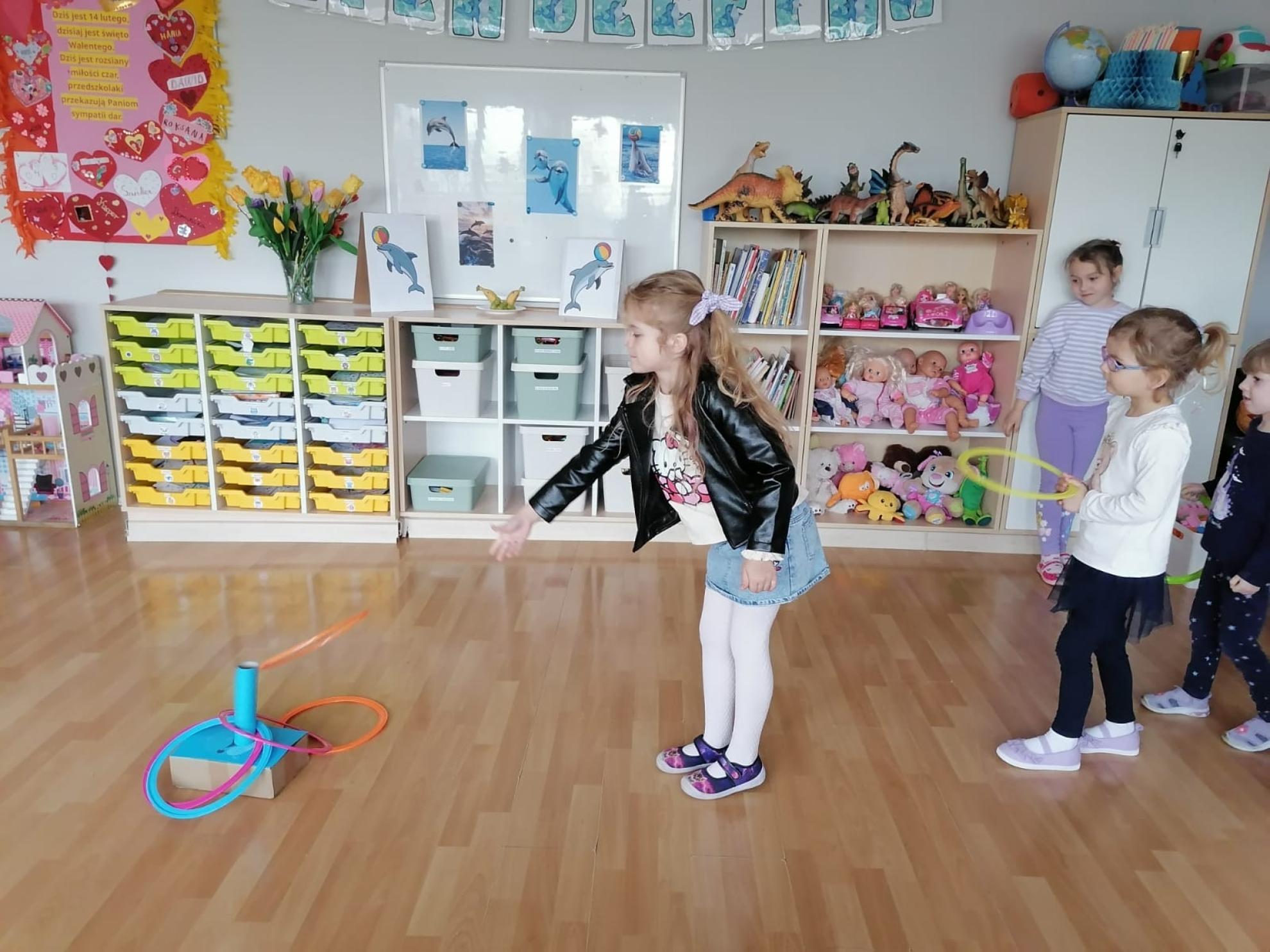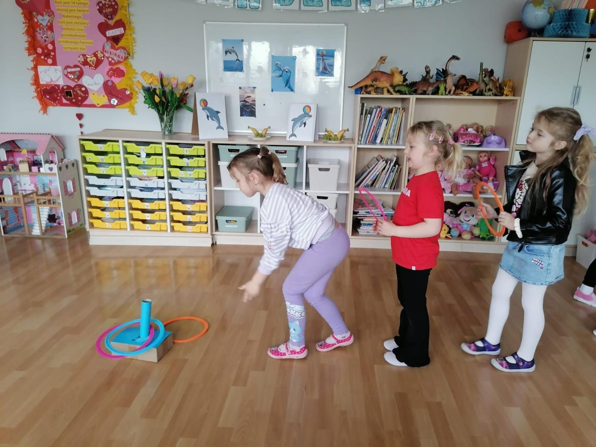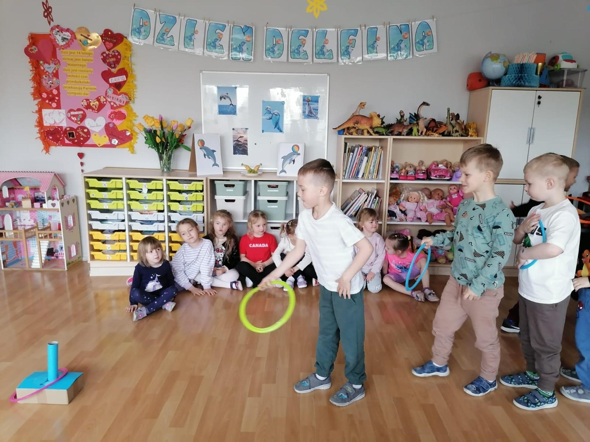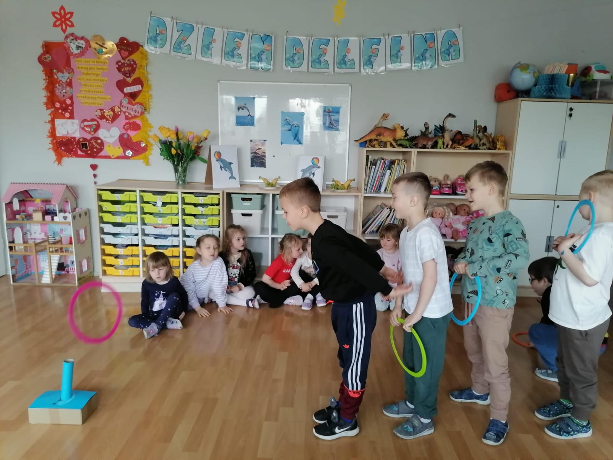 Przedszkolaki skakały przez obręcze jak delfiny, karmiły delfina oraz rzucały obręczą celujący w nos delfina.
