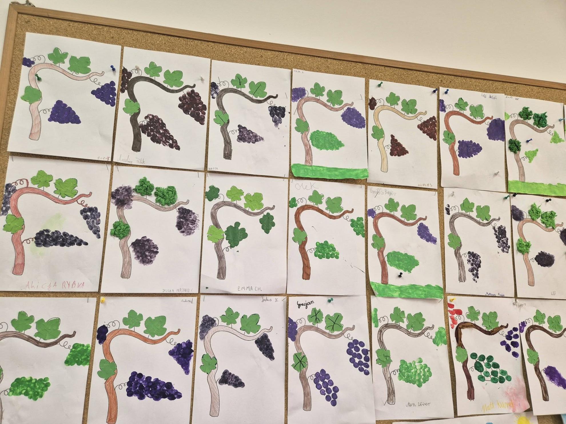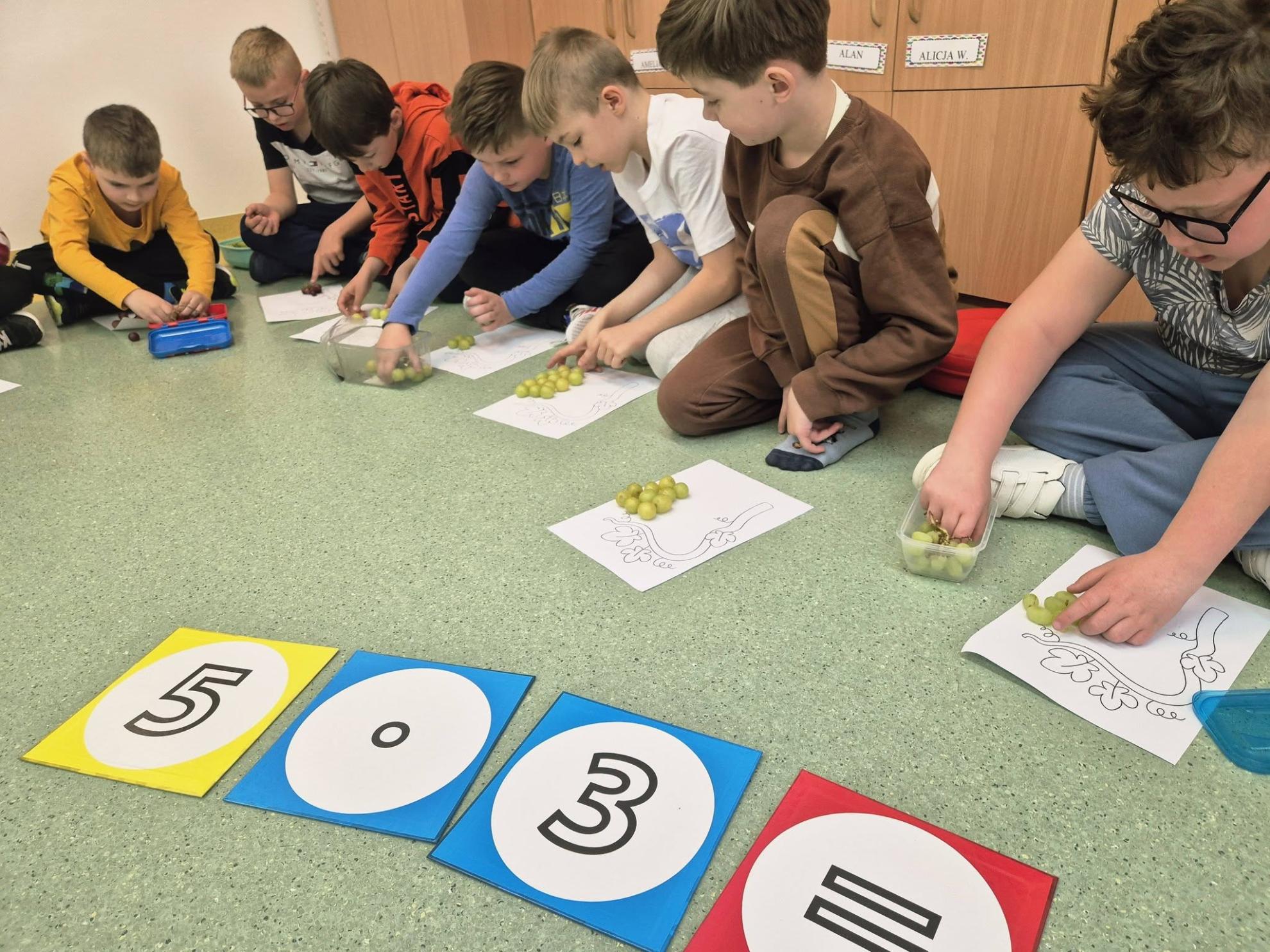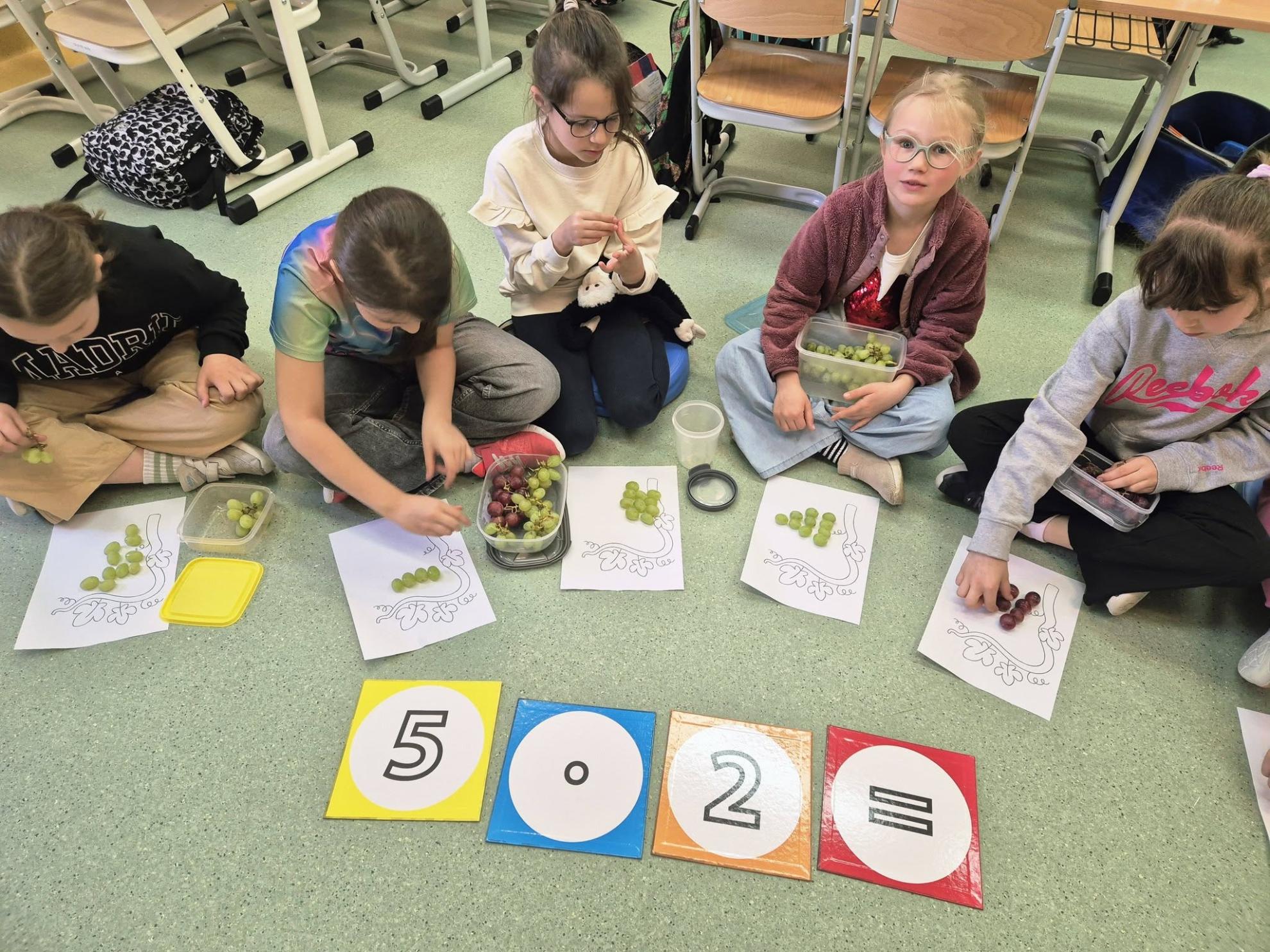 Podczas zajęć dzieci ćwiczyły liczenie – przeliczały, dodawały i mnożyły, układając kiście winogron z kulek. Na zakończenie wykonały piękne prace plastyczno-techniczne pt. „Krzak winogrona”.