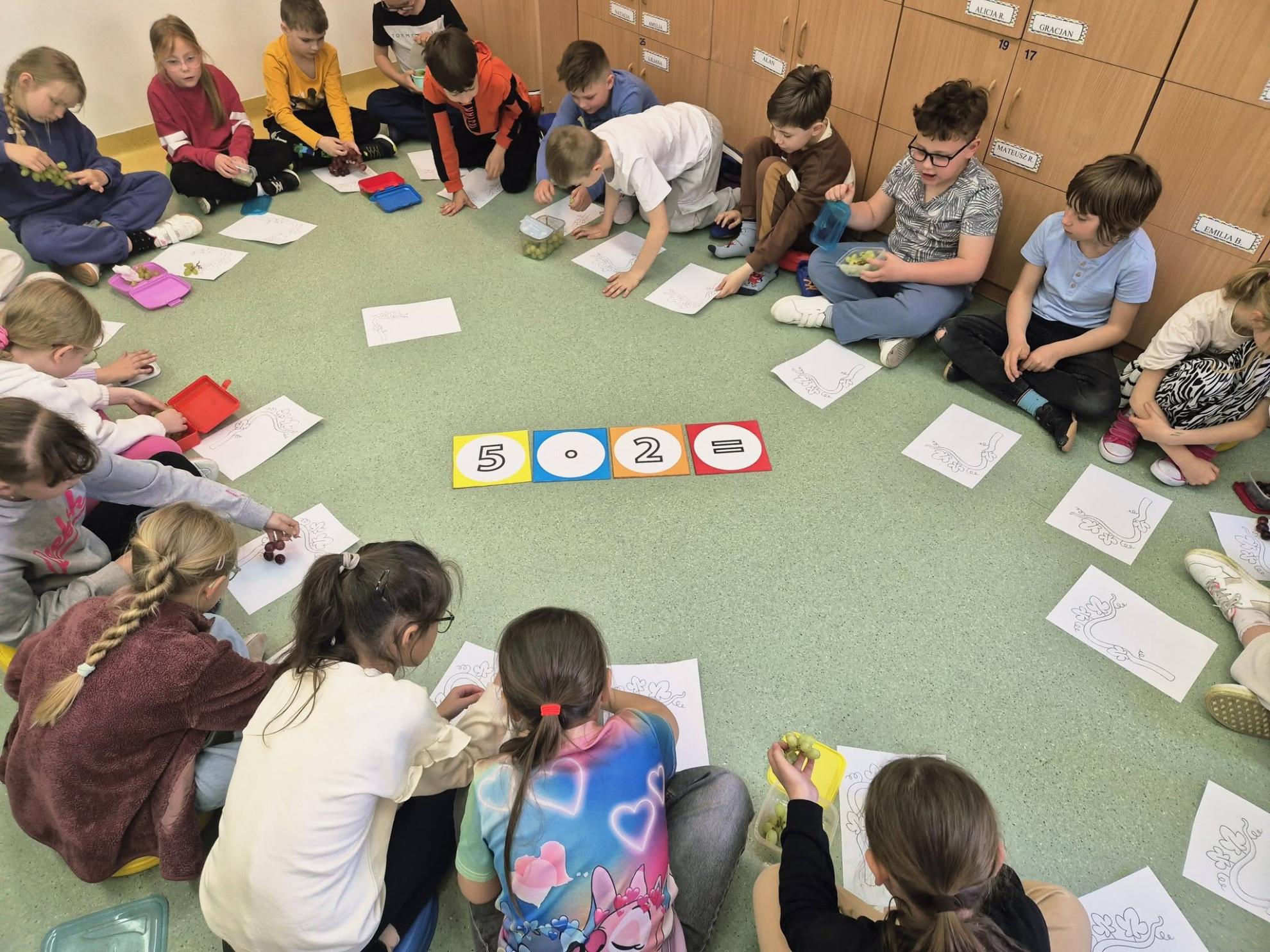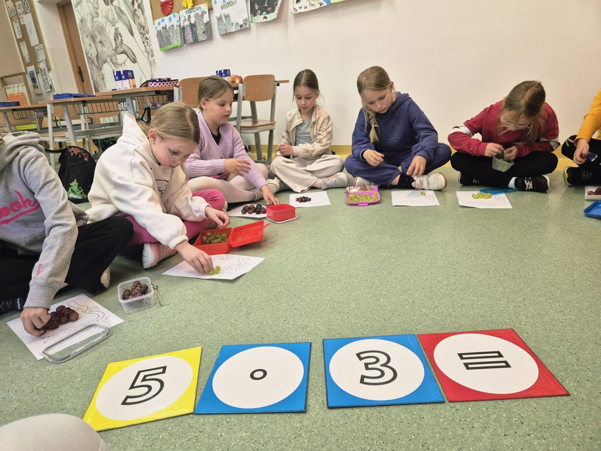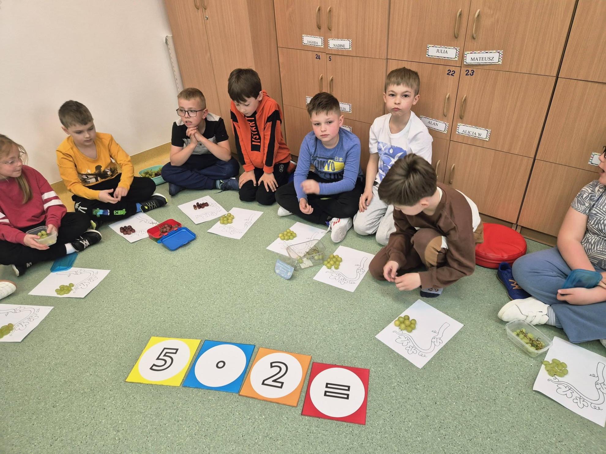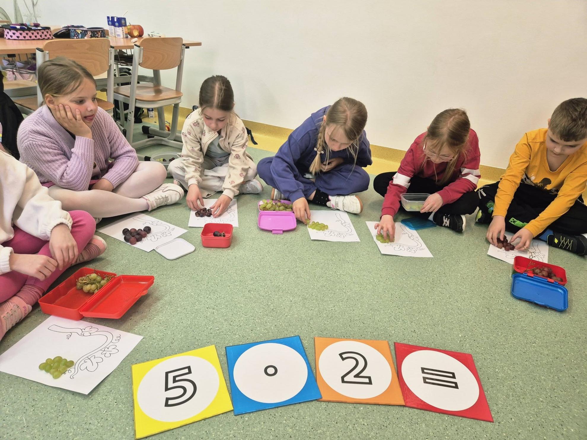 Podczas zajęć dzieci ćwiczyły liczenie – przeliczały, dodawały i mnożyły, układając kiście winogron z kulek. Na zakończenie wykonały piękne prace plastyczno-techniczne pt. „Krzak winogrona”.